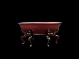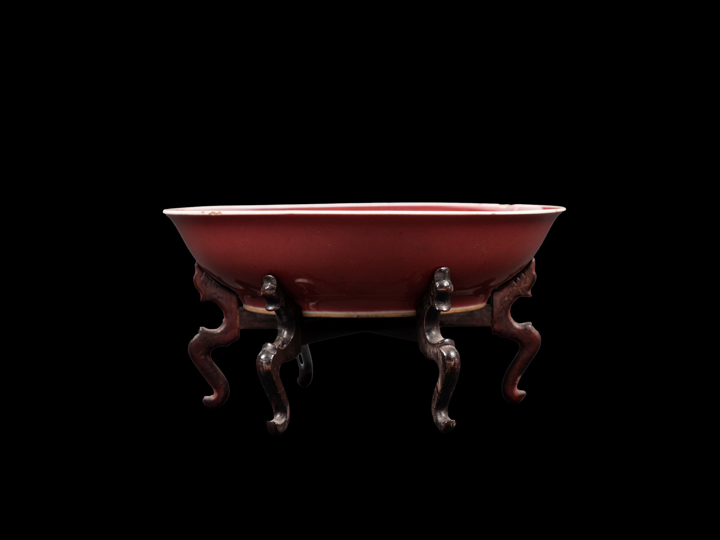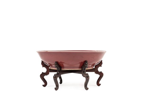 With rounded sides rising from a short foot, both the interior and exterior covered with a iron-red glaze below the white rim; the base bears a six-character underglaze blue mark of the Qianlong Emperor. With wooden base.