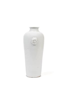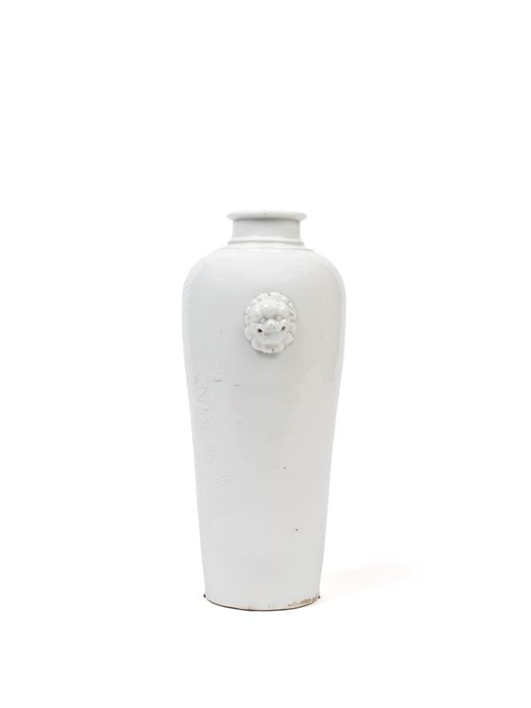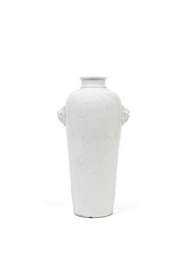 Tall and slender in form, with two lion-head handles, the body decorated in anhua technique with chrysanthemums.