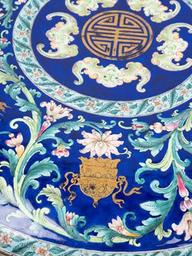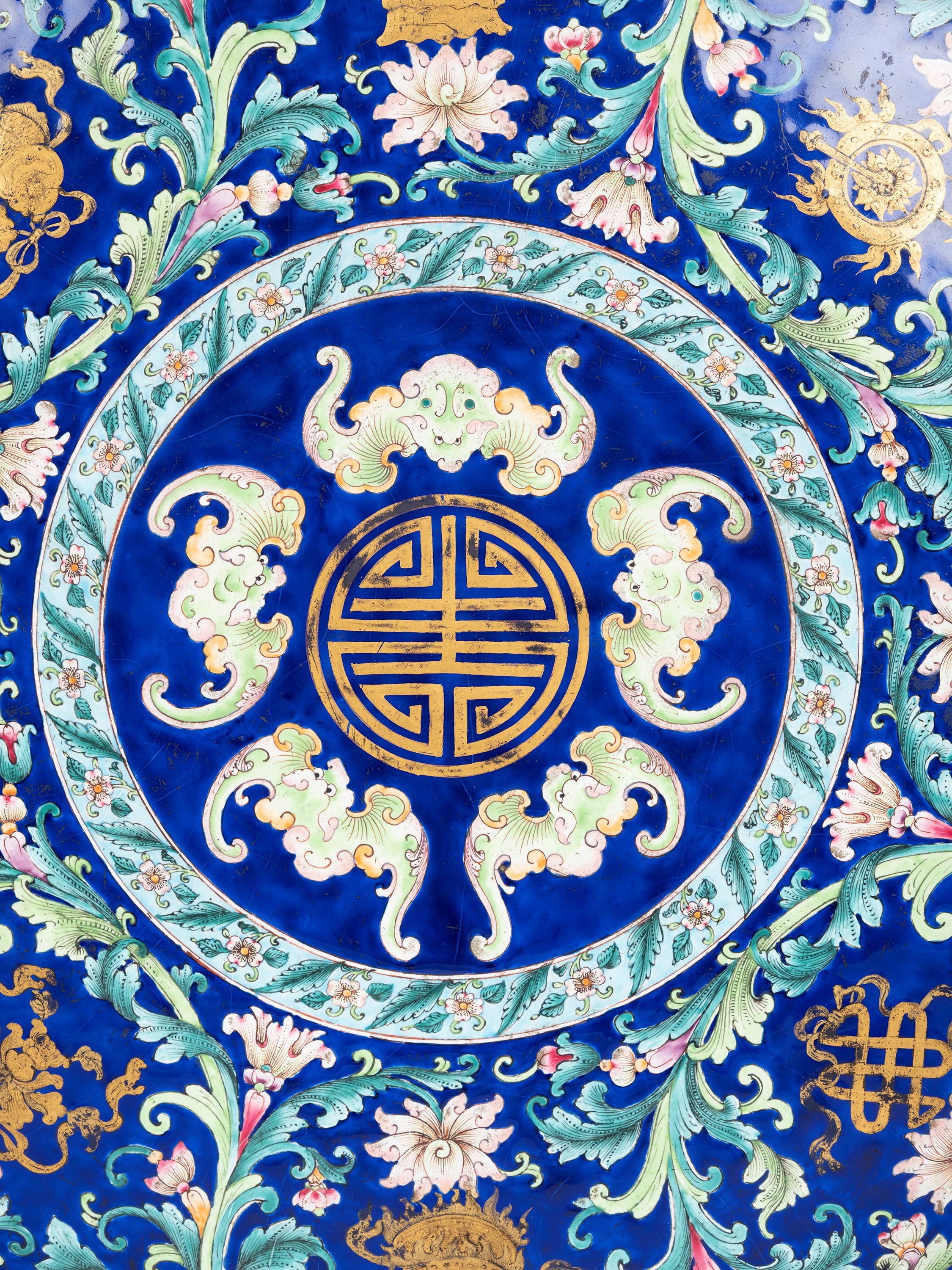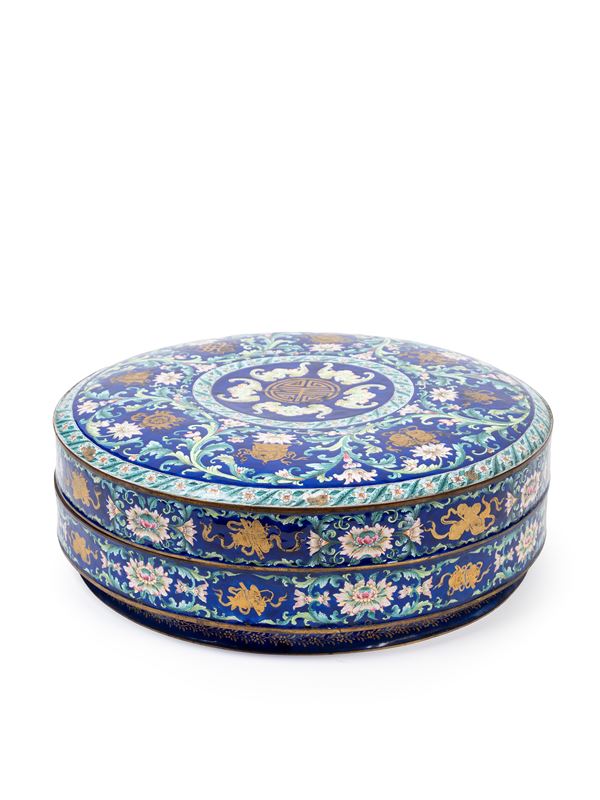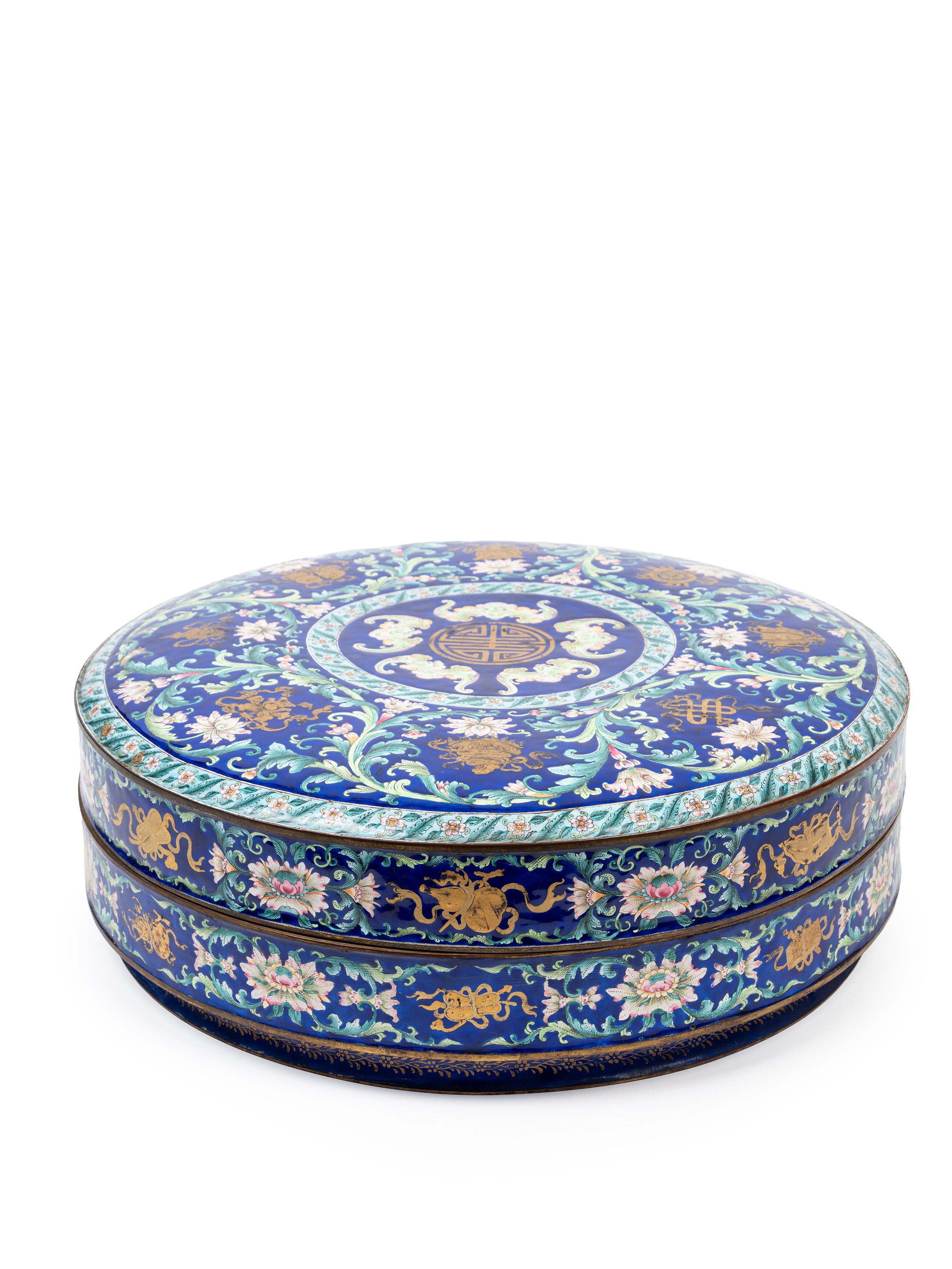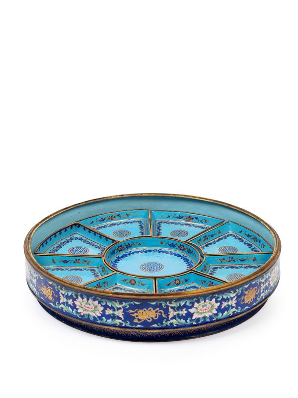 Of flat circular form with a slightly domed cover, finely enamelled on a blue ground with a central band in gilt overglaze depicting the Eight Buddhist Emblems among lotus flowers and leafy scrolls. At the center, five bats support a large gilt shou (longevity) symbol. The interior contains eight fan-shaped trays surrounding a central circular dish, each decorated with bats, foliate motifs, and auspicious symbols.