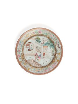 Finely and delicately enamelled, at the centre the scene depicts two ladies on a courtyard terrace, another figure peering through a circular window, and an attendant at the foot of a staircase, all framed by an elaborate decorative border enriched with flowers, butterflies, and gilt vegetal motifs.