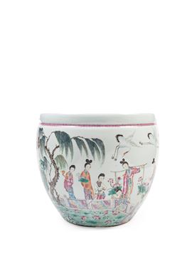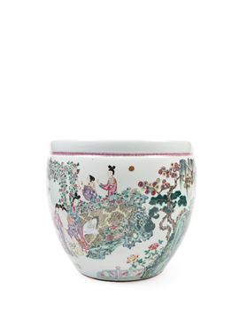 Finely painted in a continuous composition, it depicts elegantly dressed ladies and children gathering flowers in a lush natural landscape with blossoming trees, herons, and a pond dotted with peonies.