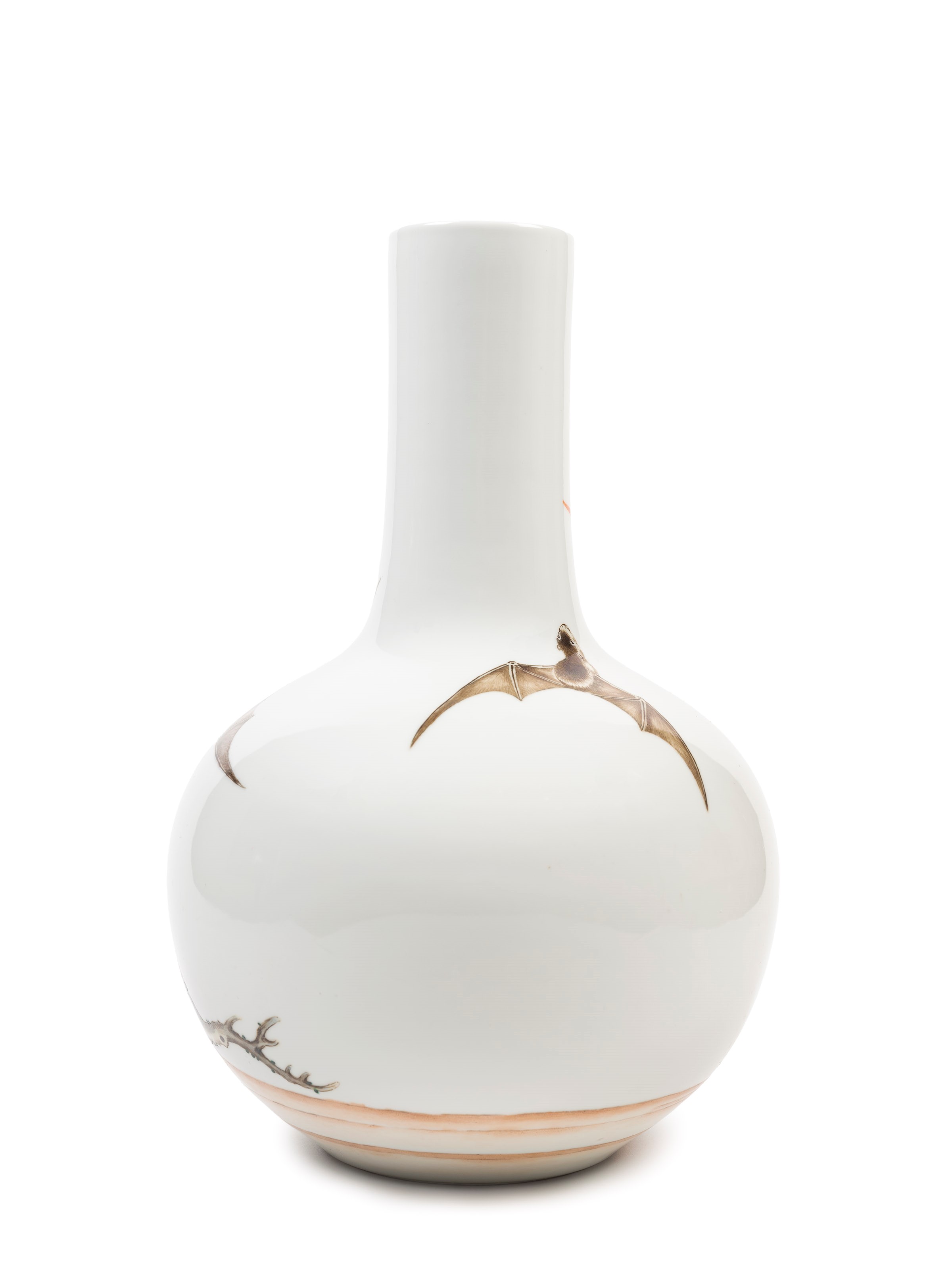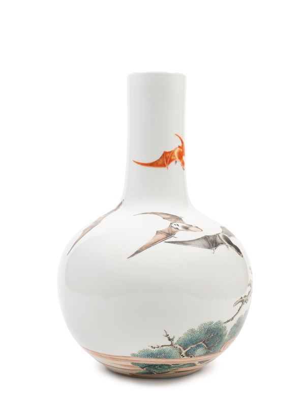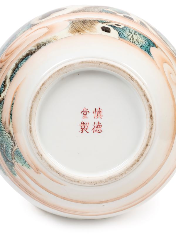 Finely painted in a continuous scene with five bats flying above a naturalistic landscape of trees and clouds. To the center of the base a four-character iron-red mark Shen De Tang Zhi (慎德堂製).