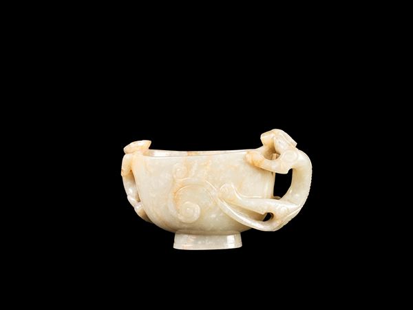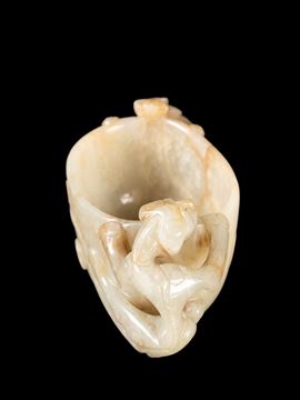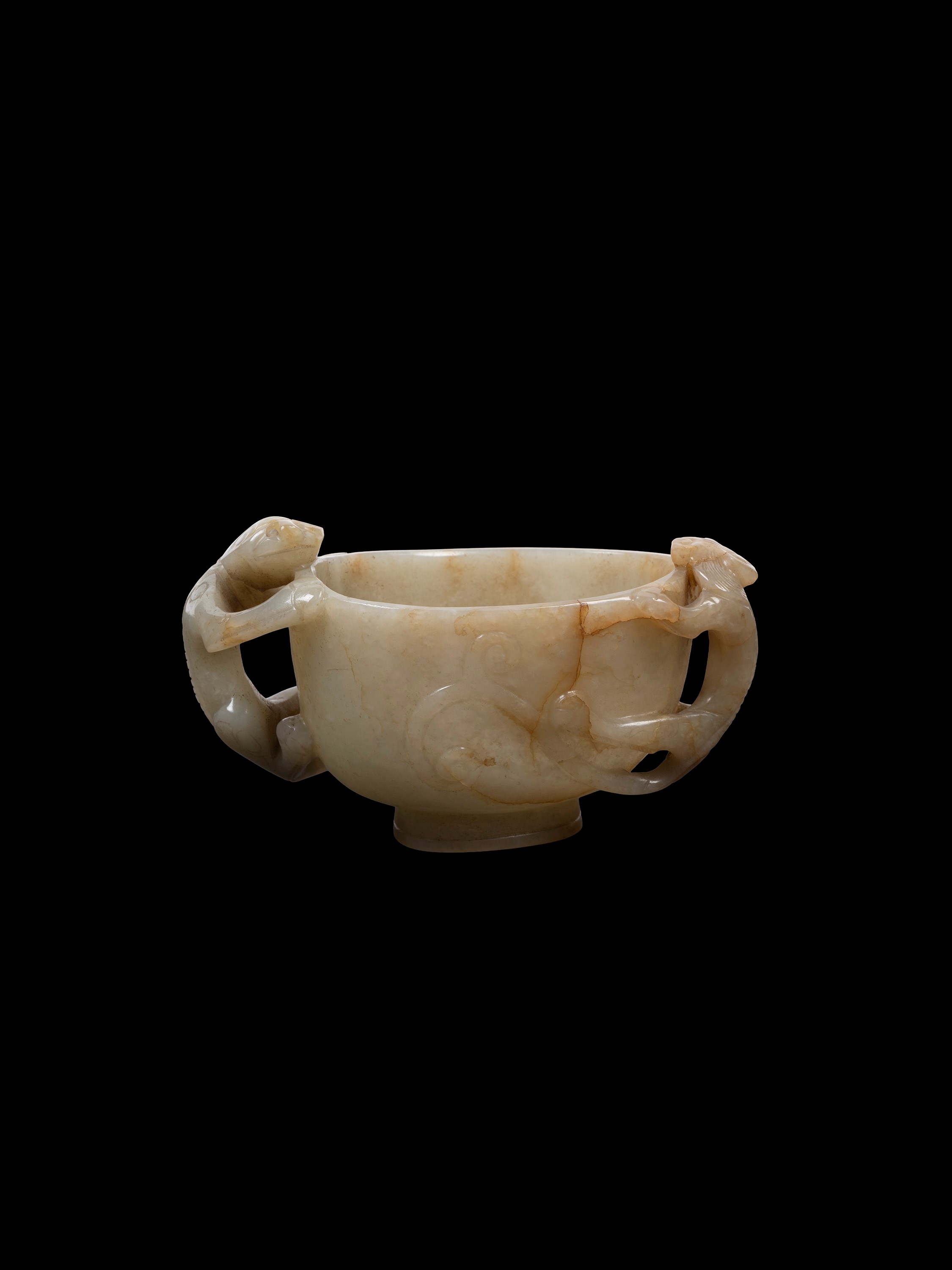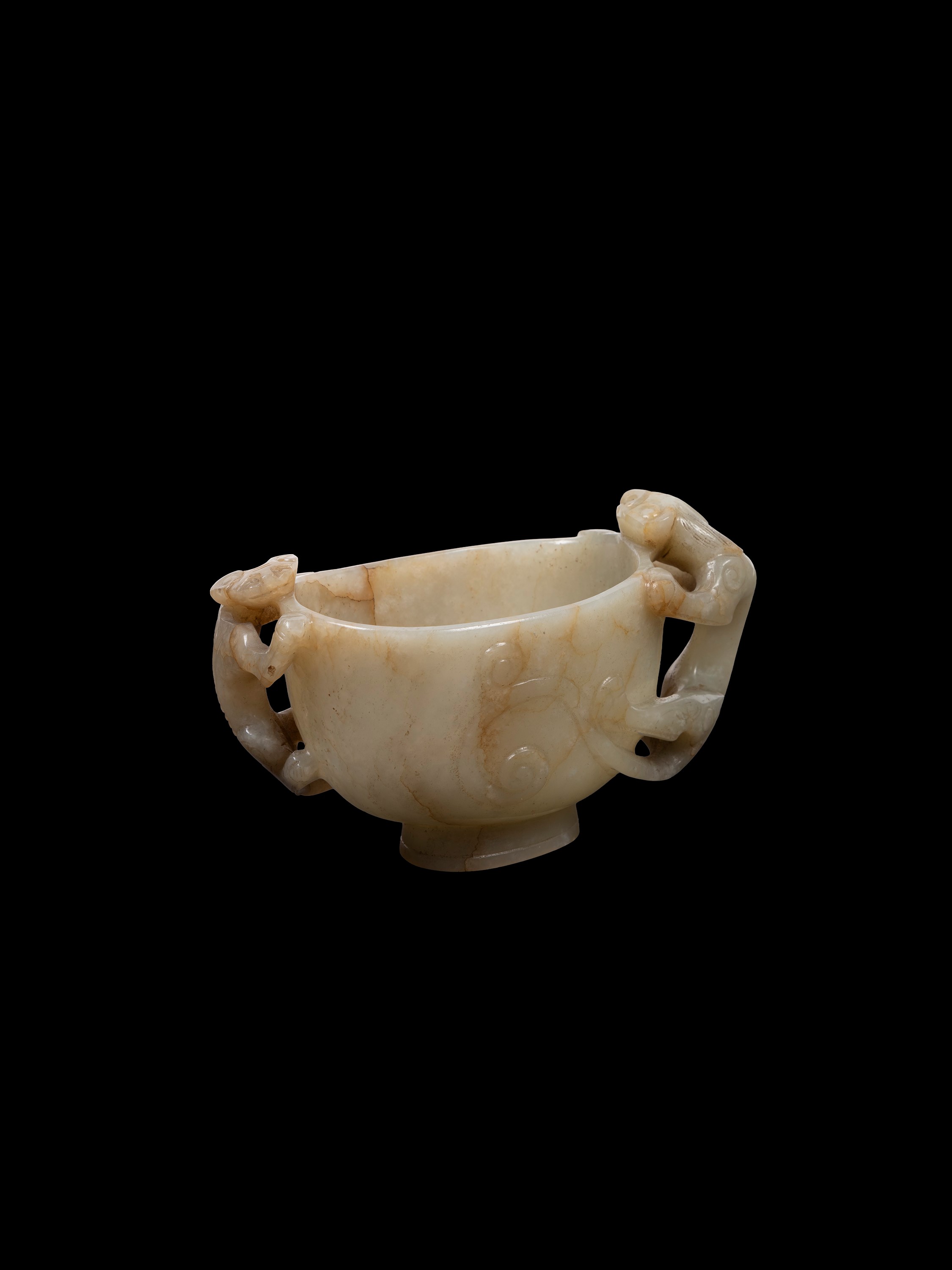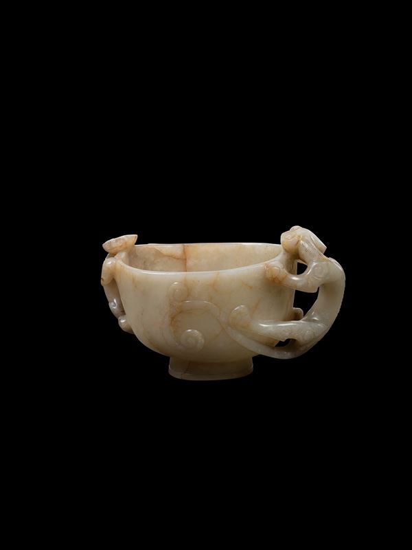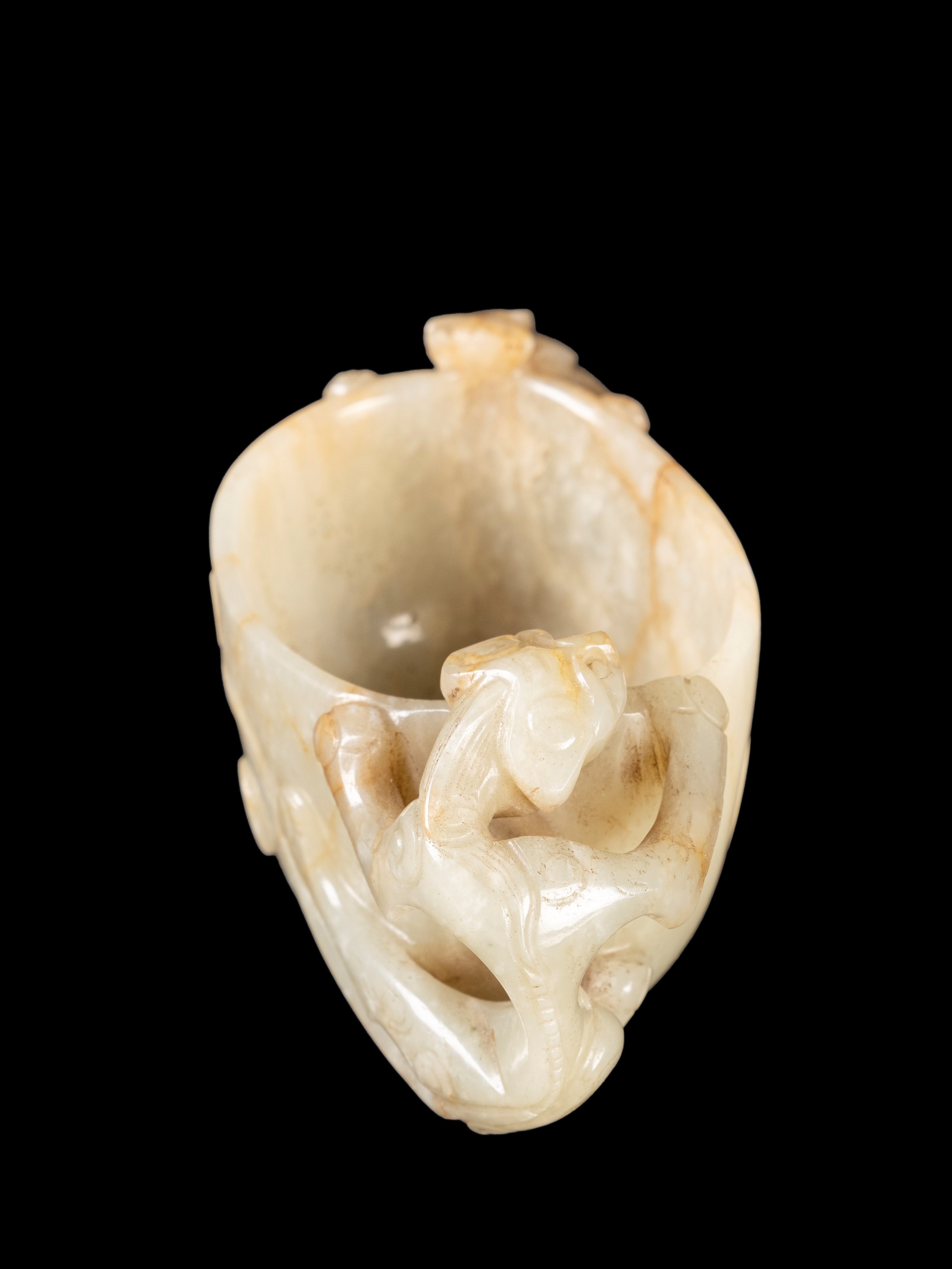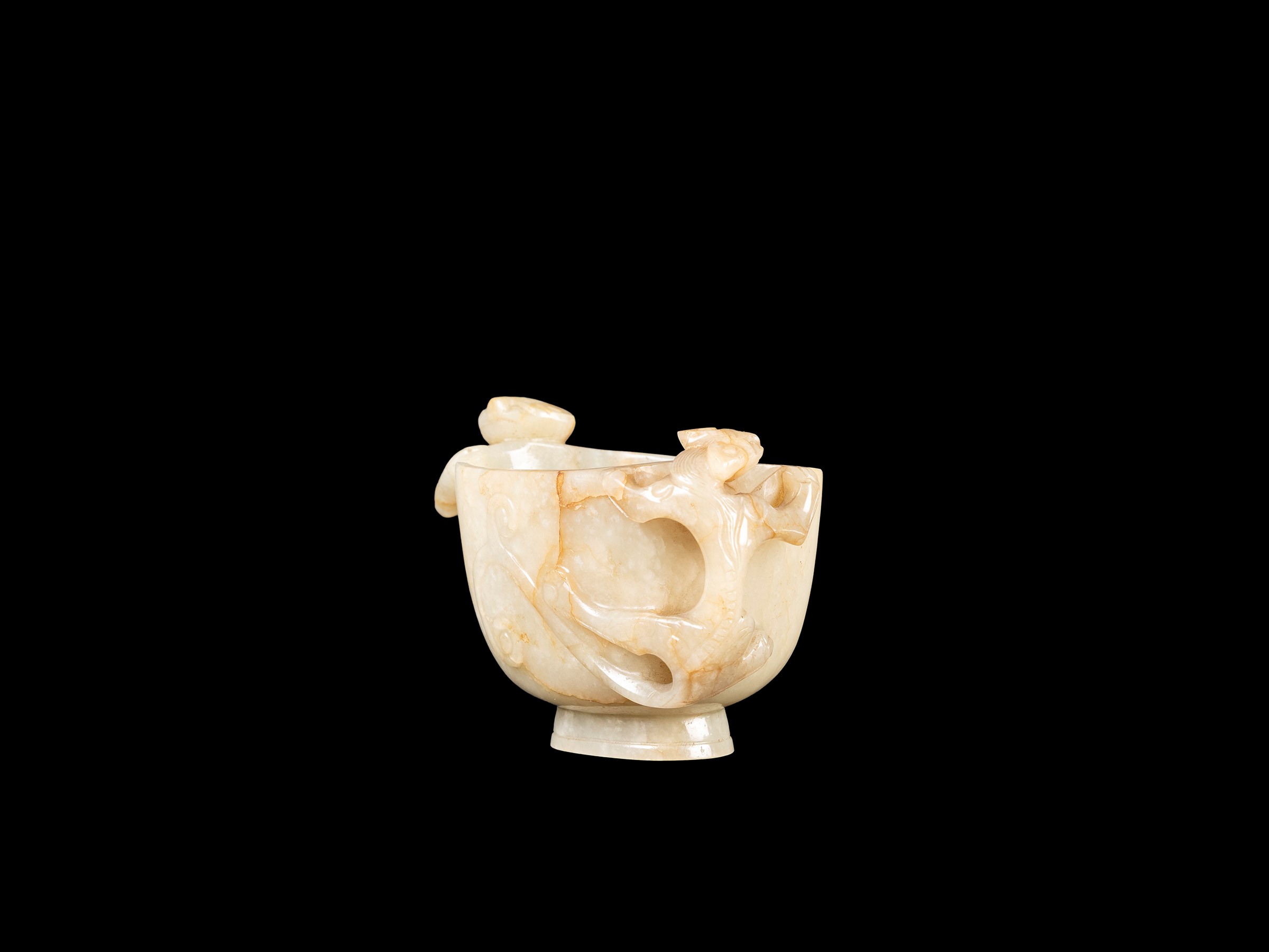 A JADE AND RUSSETT ‘QILONG’ LIBATION CUP, China, Ming dynasty (1368-1644)