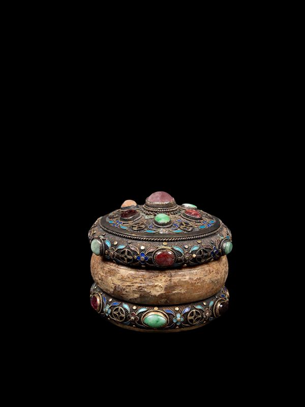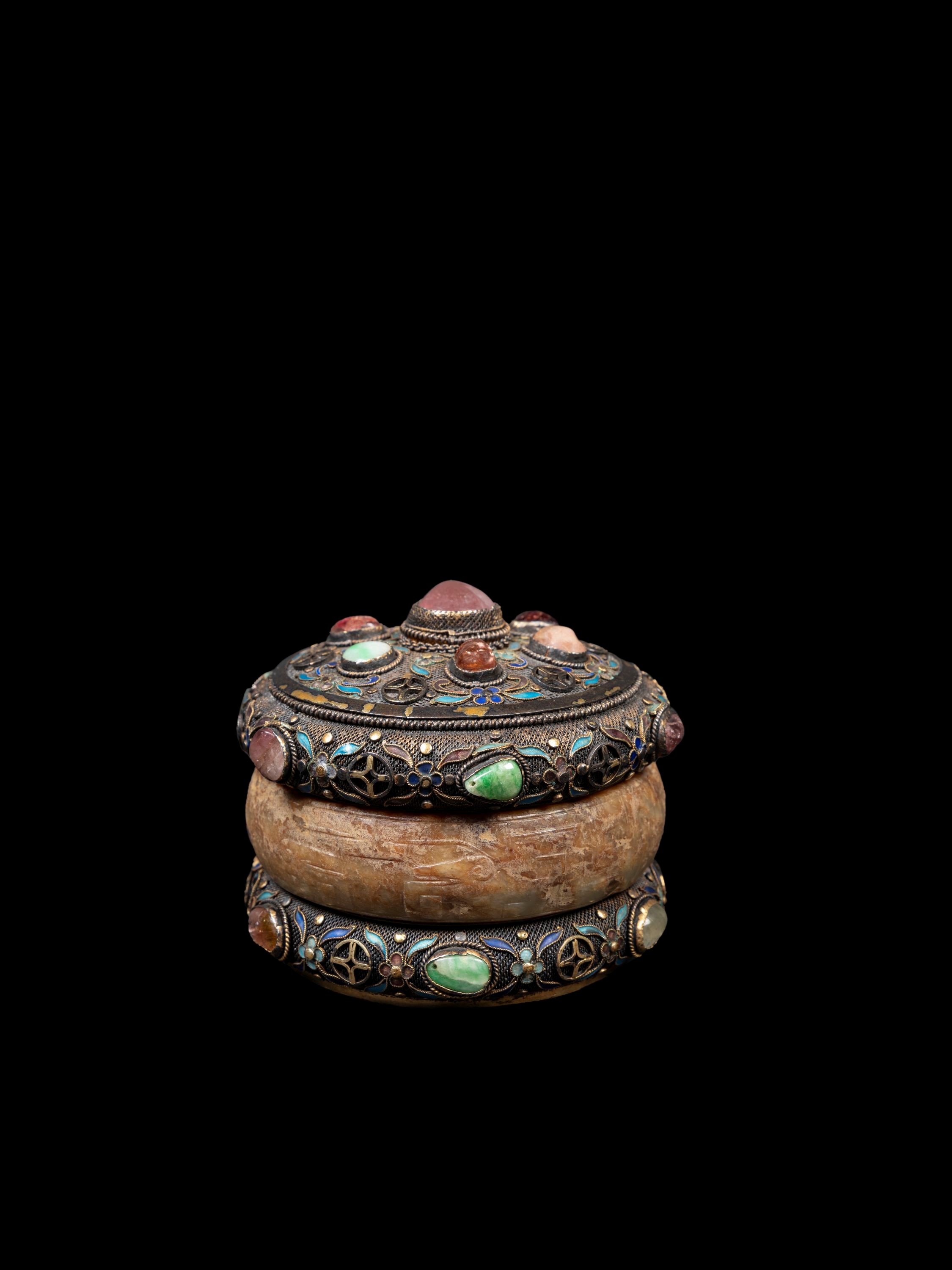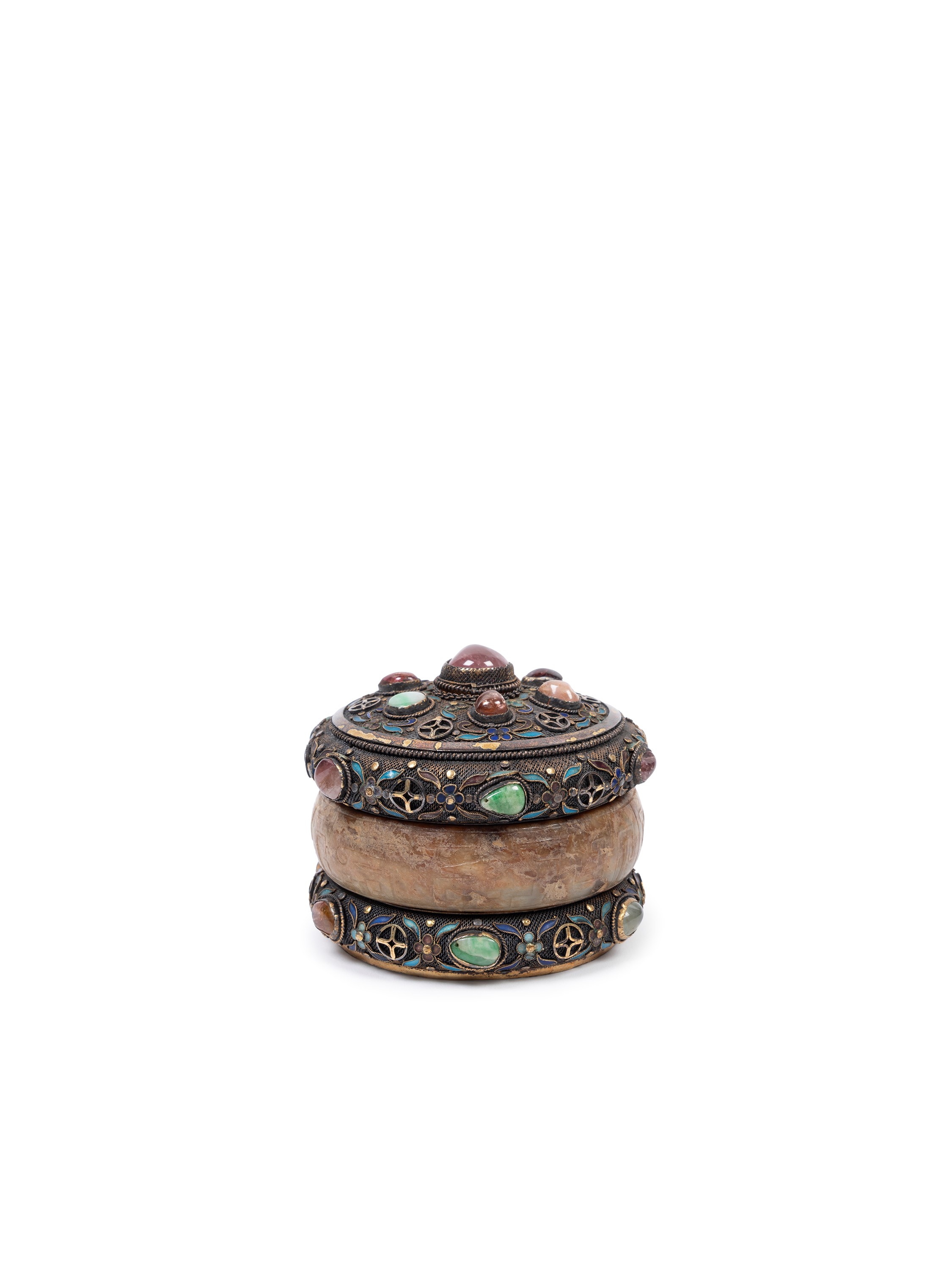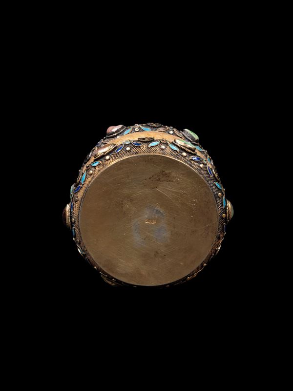 二十世纪  银制烧蓝百宝嵌玉环首饰盒 重 249g