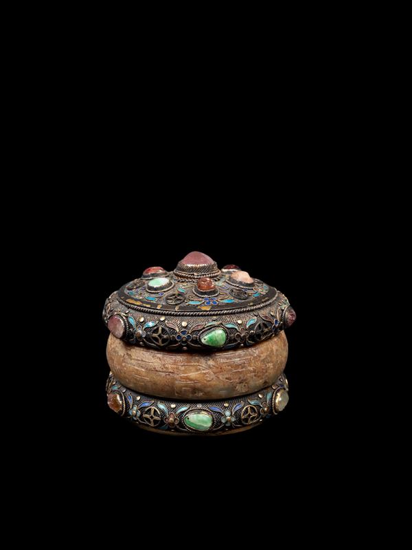 Decorated with enamel and semi-precious stones, and featuring a jade ring engraved with archaistic motifs. Total weight g 249.
