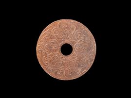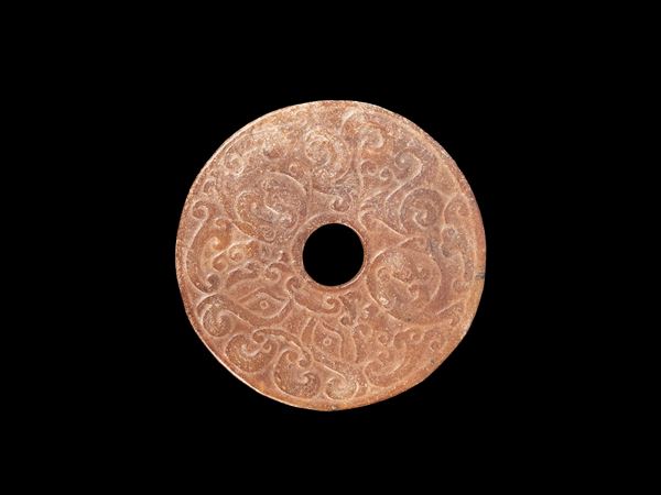 Of circular form, it is carved on both sides with taotie masks and phoenixes among stylized clouds.