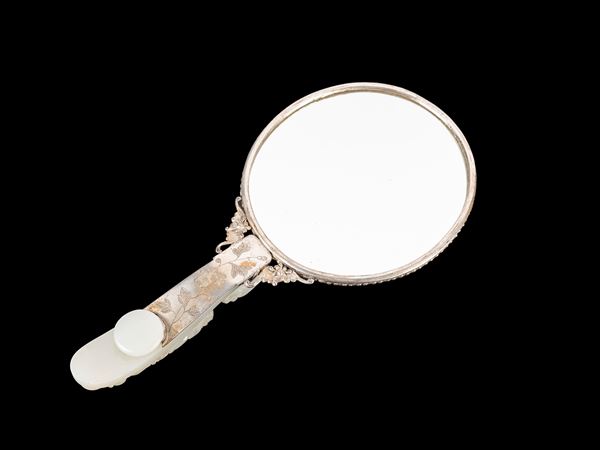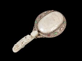 With a pierced relief dragon decoration on the handle and a low-relief engraved scene of figures in a landscape on the plaque. The edge on the back of the mirror is decorated with babao motifs and semi-precious stones.