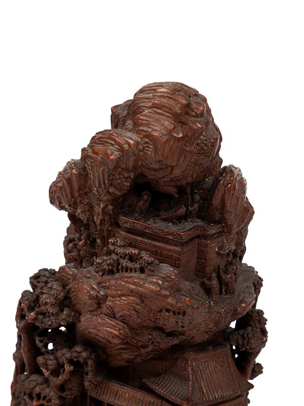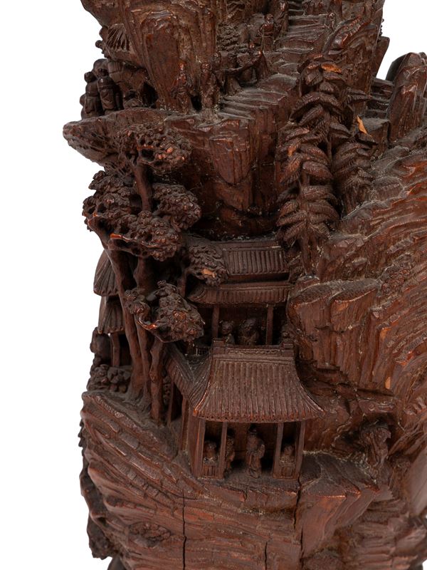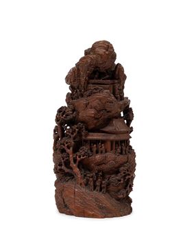Shaped like a mountain, it is finely and deeply carved in high relief, depicting a gathering of scholars assembled in pavilions nestled among pine trees and rocks.