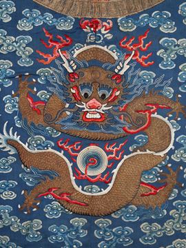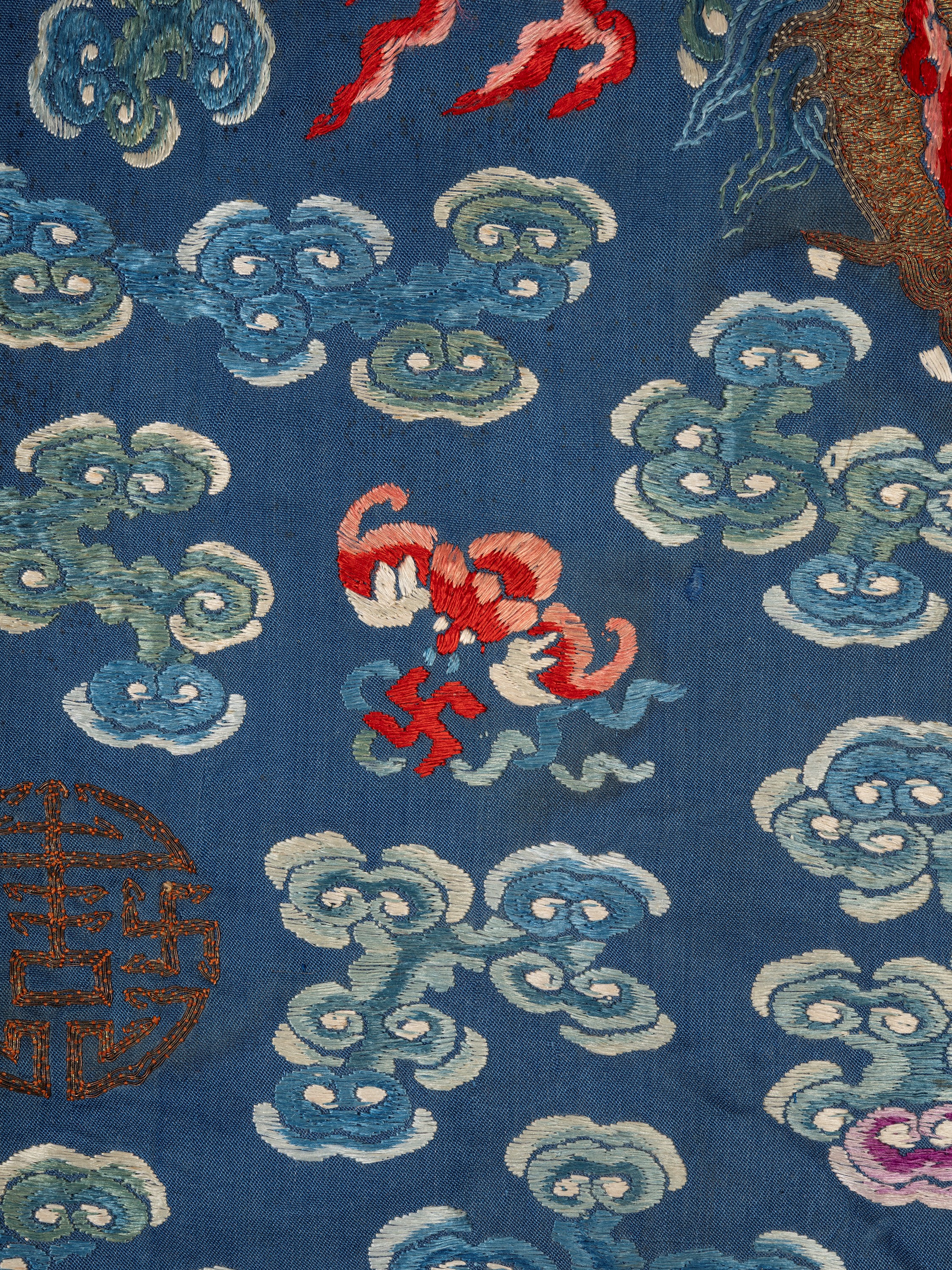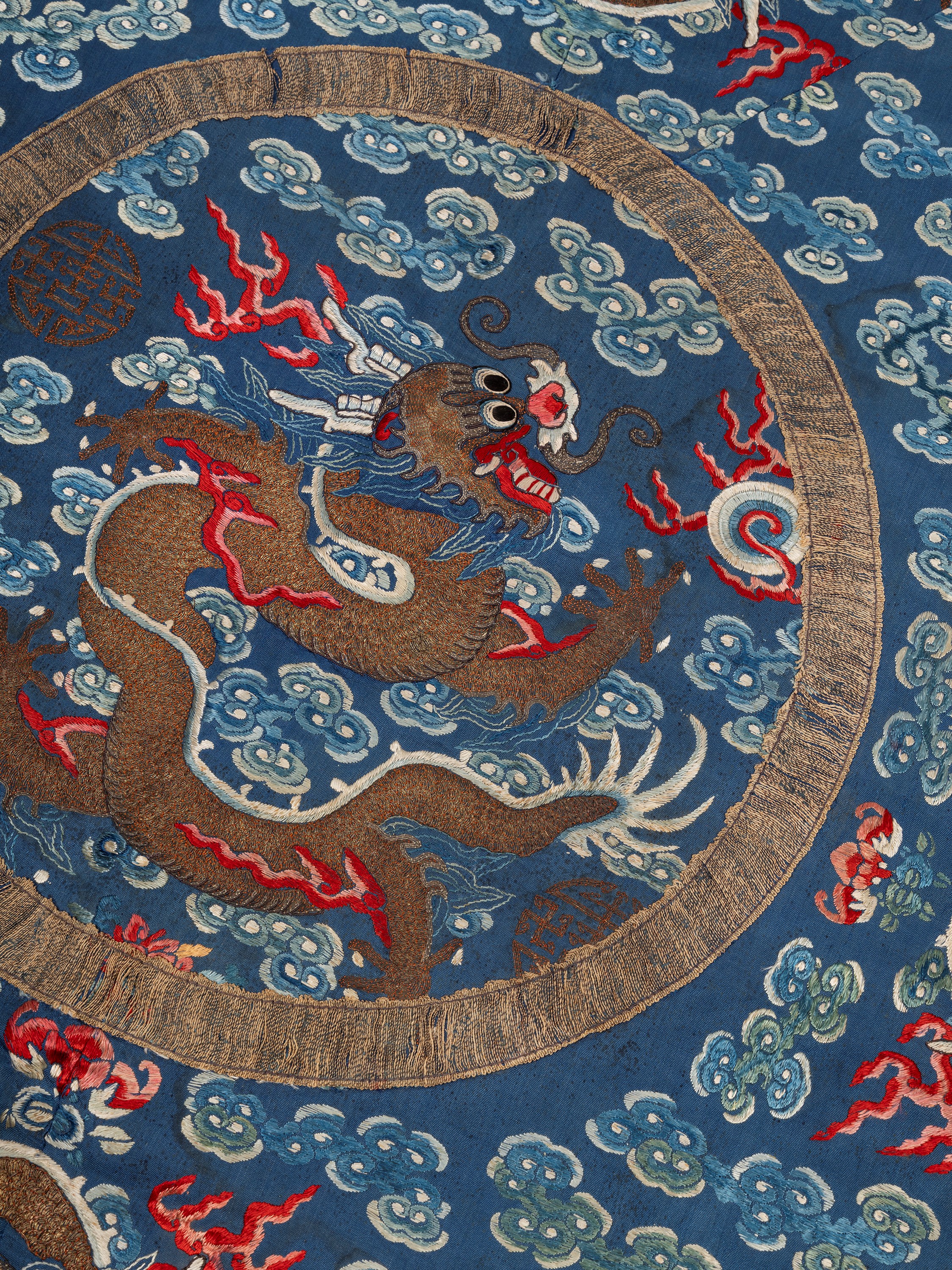 Finely decorated on a blue ground with stylized clouds, shou symbols, waves, and bats, featuring four five-clawed dragons at the sides and a central circular panel containing an additional dragon.