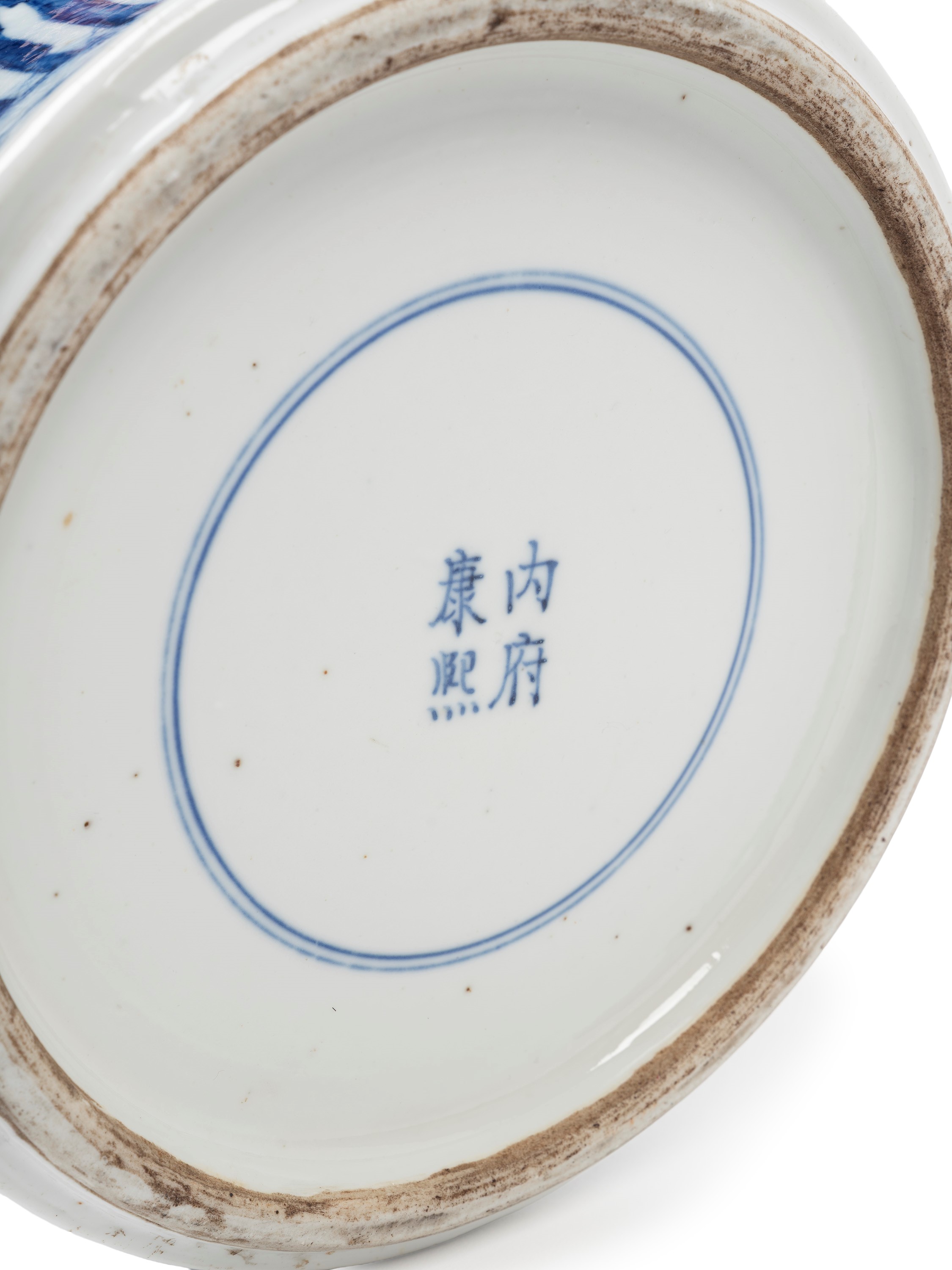 The body is finely decorated with a naturalistic landscape depicting peony trees, rocks, and birds. The base bears a four-character apocryphal underglaze-blue mark of the Kangxi Emperor.