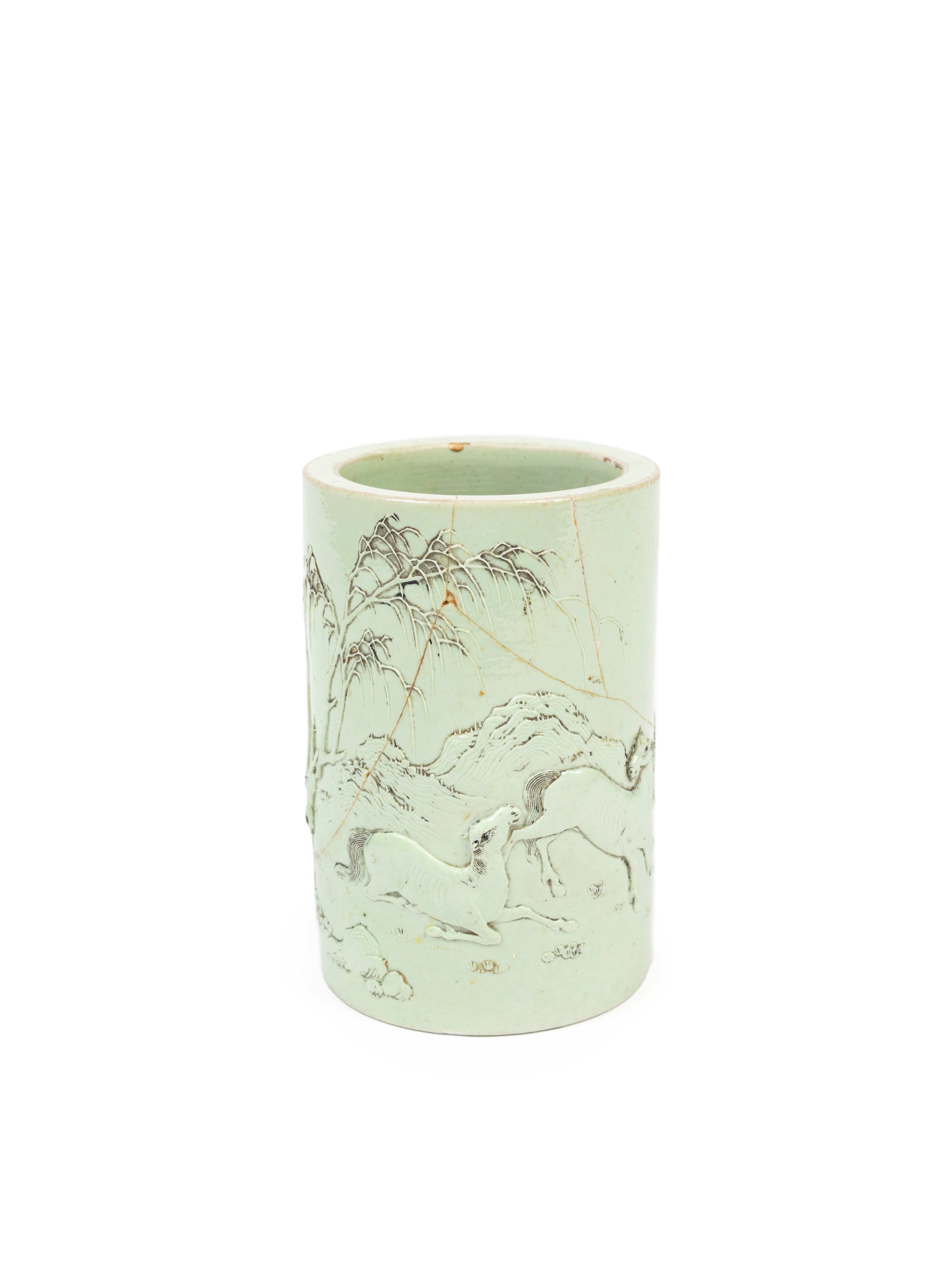 清19世纪   “柳荫双骏”雕瓷笔筒  底款“李裕成作”
