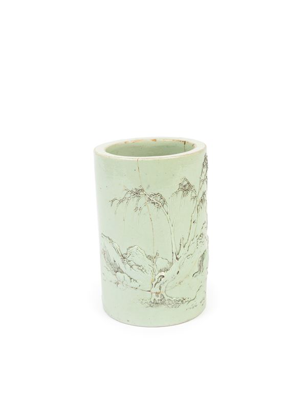 Cylindrical in form, it is finely decorated in relief with two horses within a mountainous landscape with trees and rocks. The base bears the  Lǐ Yùchéng Zuò (李裕成作) square mark in relief.
