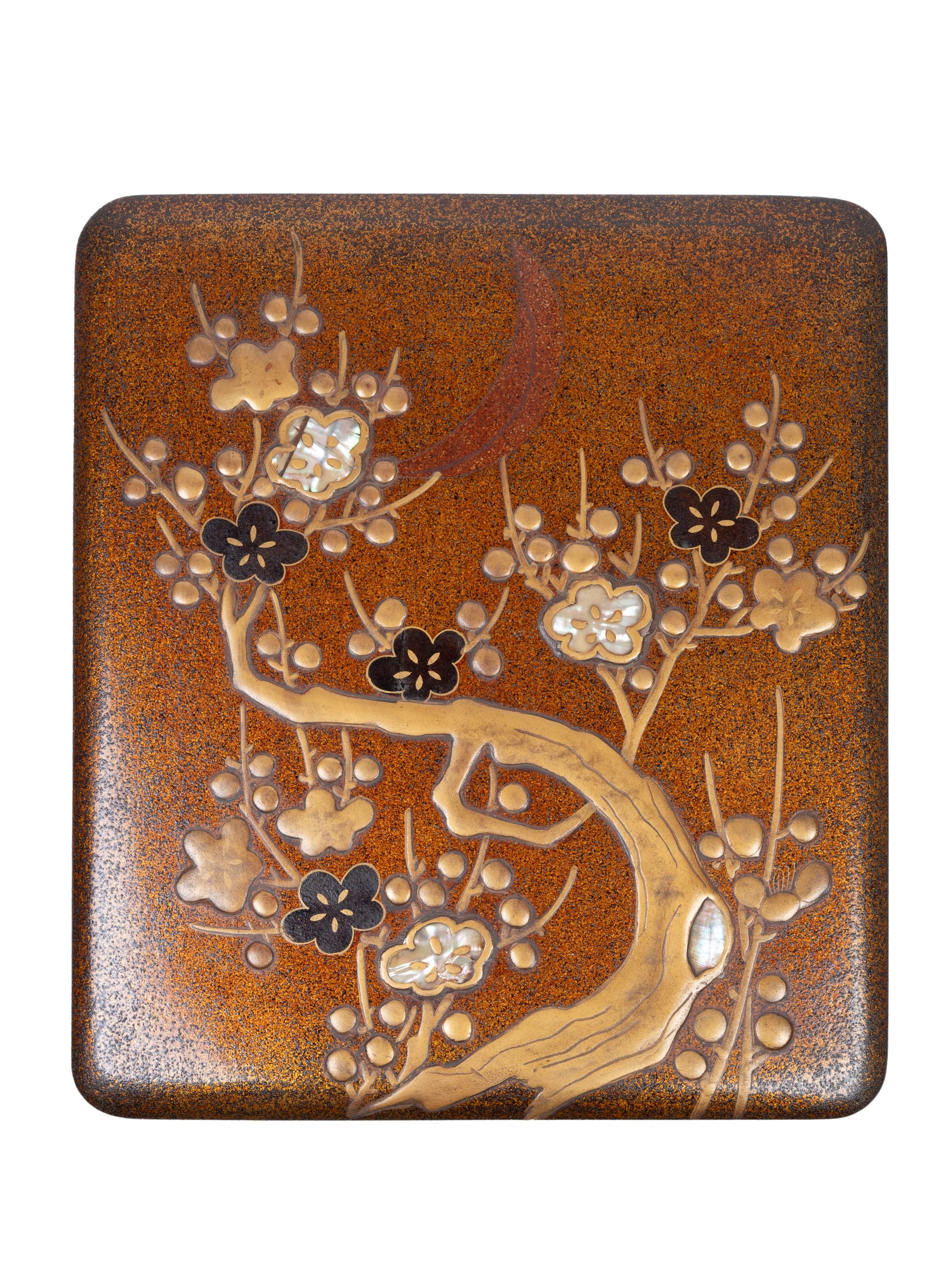 Decorated on the lid with a blossoming plum branch beneath a crescent moon. the flowers, rendered in relief with mother-of-pearl inlays and gold lacquer, stand out against an iridescent nashiji ground. inside, the surface is decorated with a pine-needle motif on a nashiji background and houses the traditional suzuri (inkstone) and suiteki (water dropper).