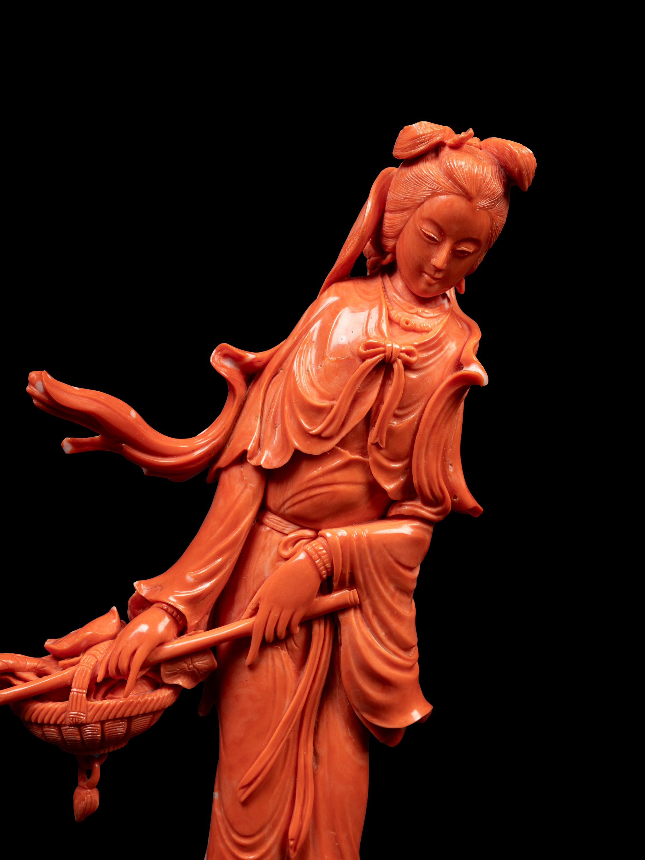 Finely carved, depicting a lady elegantly dressed with a refined hairstyle, holding a basket and a flowering staff in her hands. Total weight g 684.