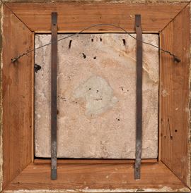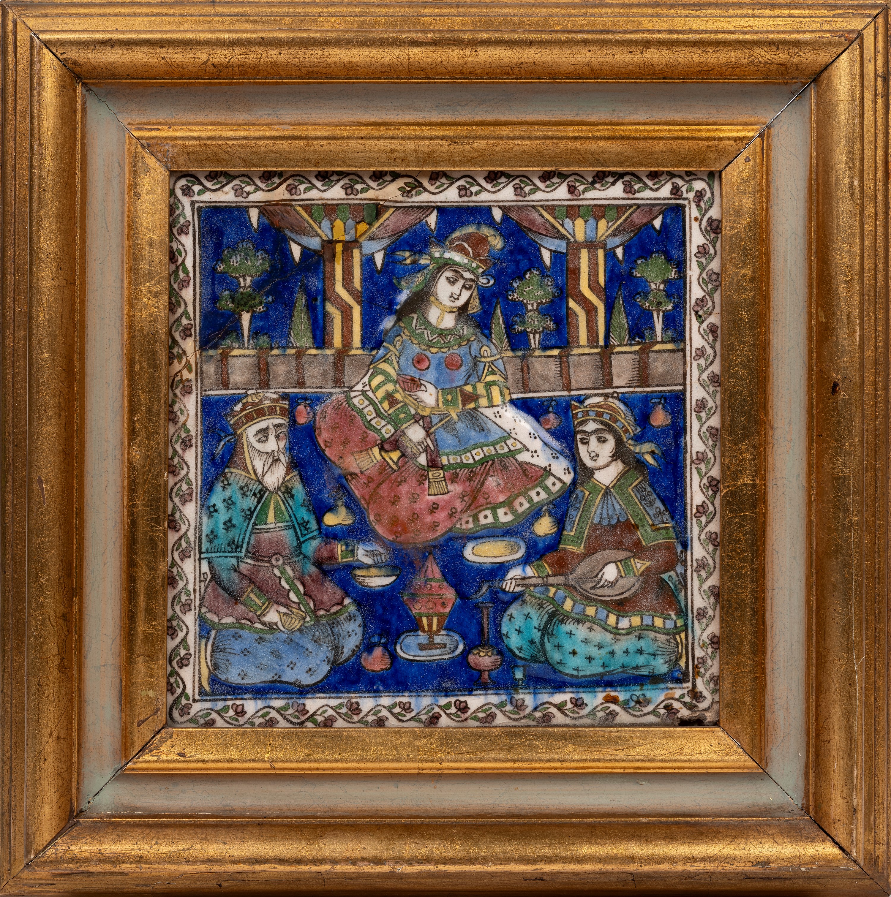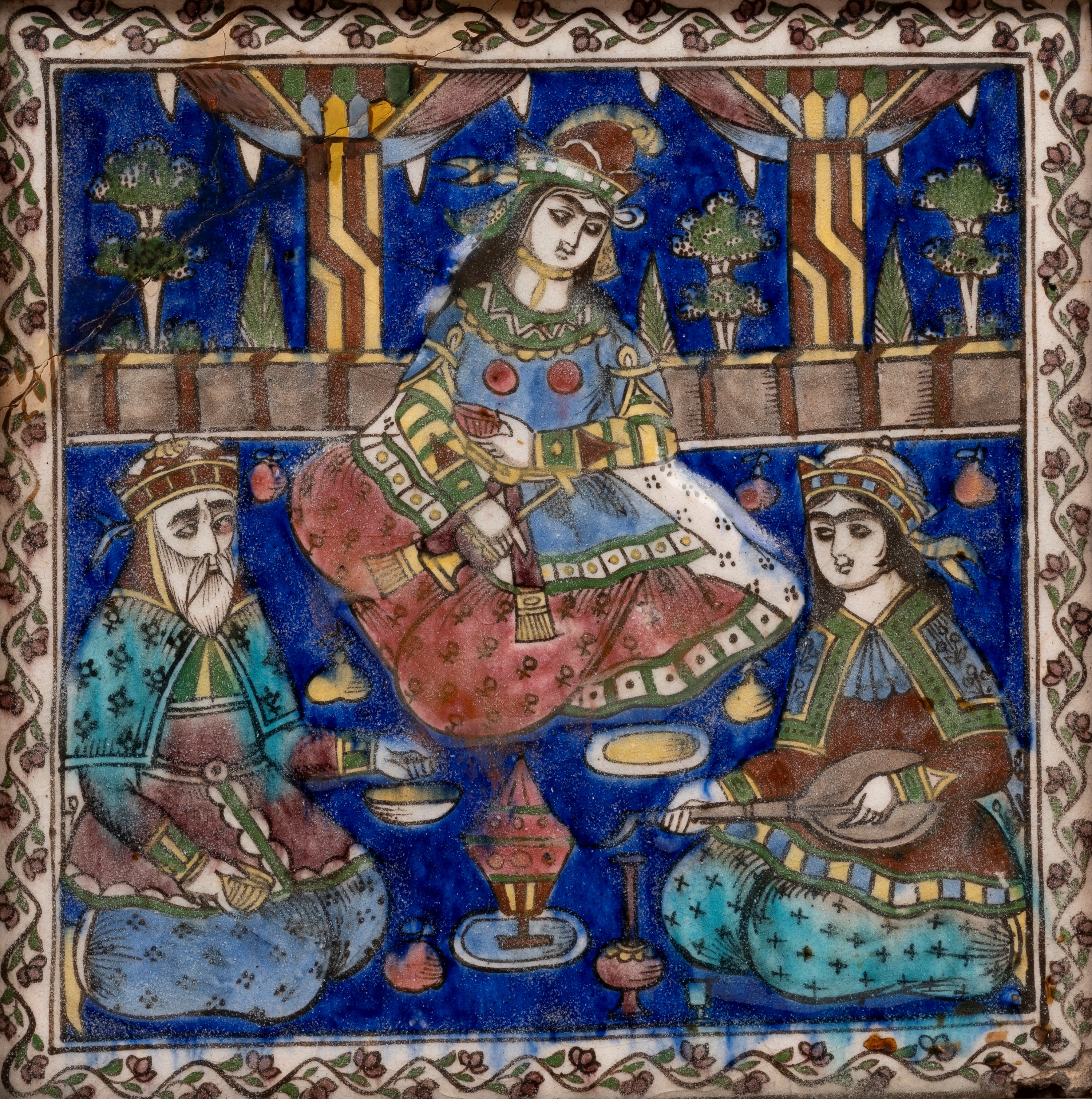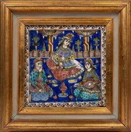 Of square form, moulded and painted in black (for the outlines), cobalt blue, turquoise, copper green, ochre yellow, and manganese purple. The scene portrays a banquet with three figures in relief seated on the ground: an elderly bearded man holding a cup, a young musician playing a sitar or Persian lute, and a richly dressed female figure wearing a long decorated gown, a tunic with multicoloured sleeves and ornamental appliqués, and an elaborate headdress reminiscent of pre-Islamic Persian styles. She holds a globular flask and a small cup, as if pouring a drink for herself and her companions. The floor is scattered with small fruit, possibly quinces or pears, pieces of tableware, and a central cup with a pyramidal lid. In the background, two polychrome columns with flared capitals, draped with wide curtains, frame a lush garden, suggesting that the scene is taking place in an open pavilion within a Persian bāgh. Particularly noteworthy are the details (such as the lady’s headdress, the architectural elements and the tableware) reflecting an engagement with pre-Islamic Persian motifs, in keeping with the Achaemenid Revival style characteristic of the Qajar period.