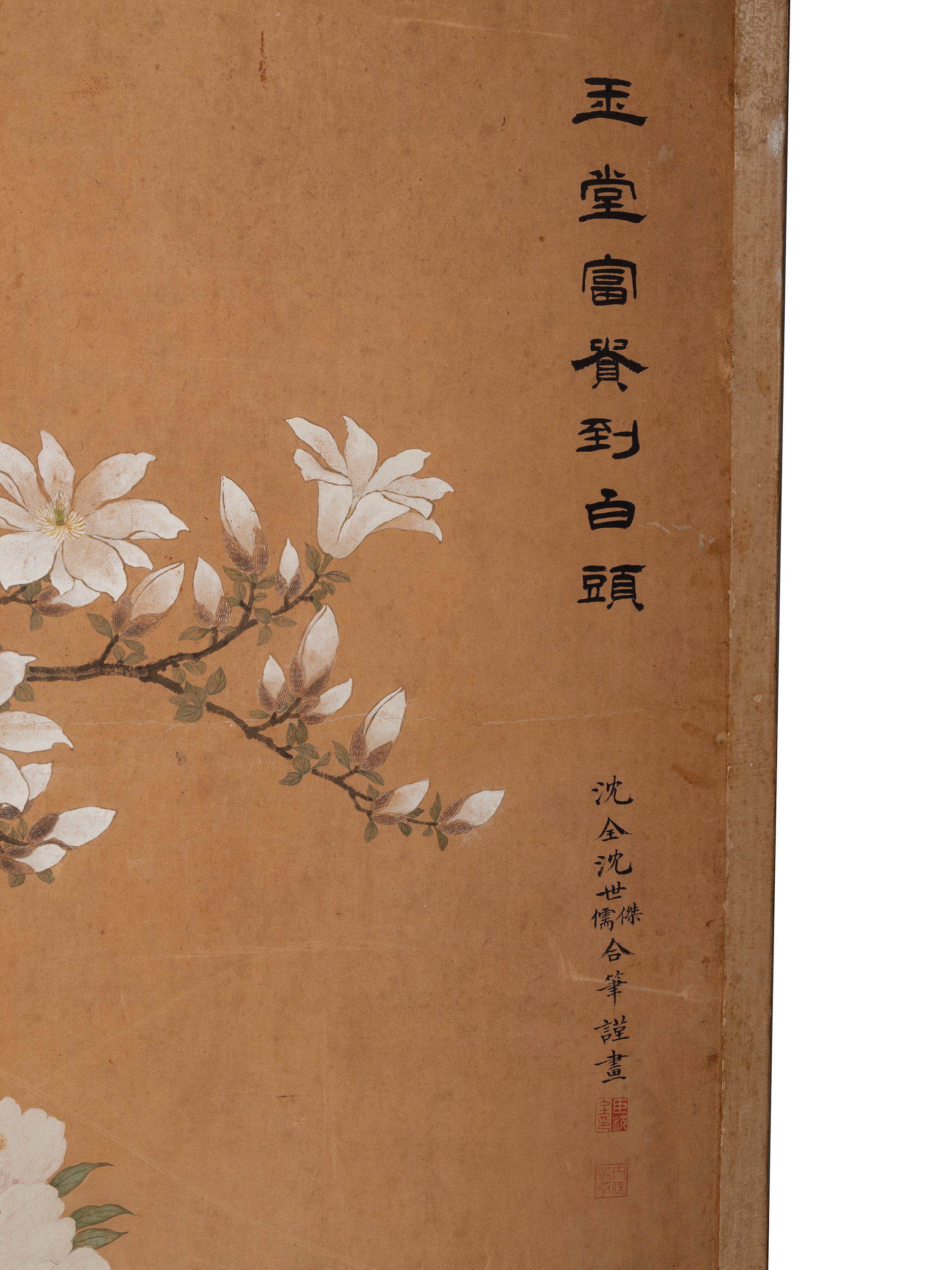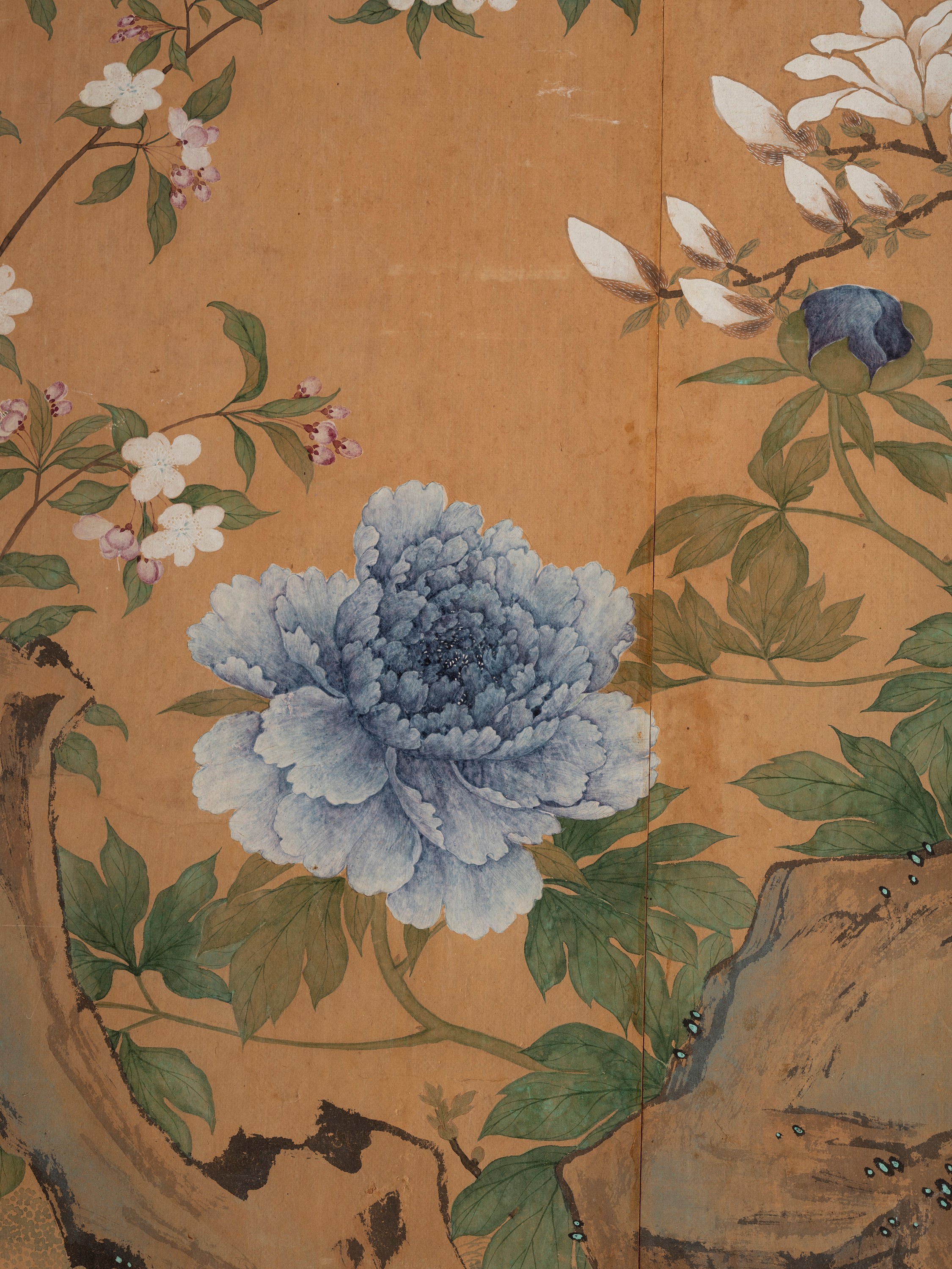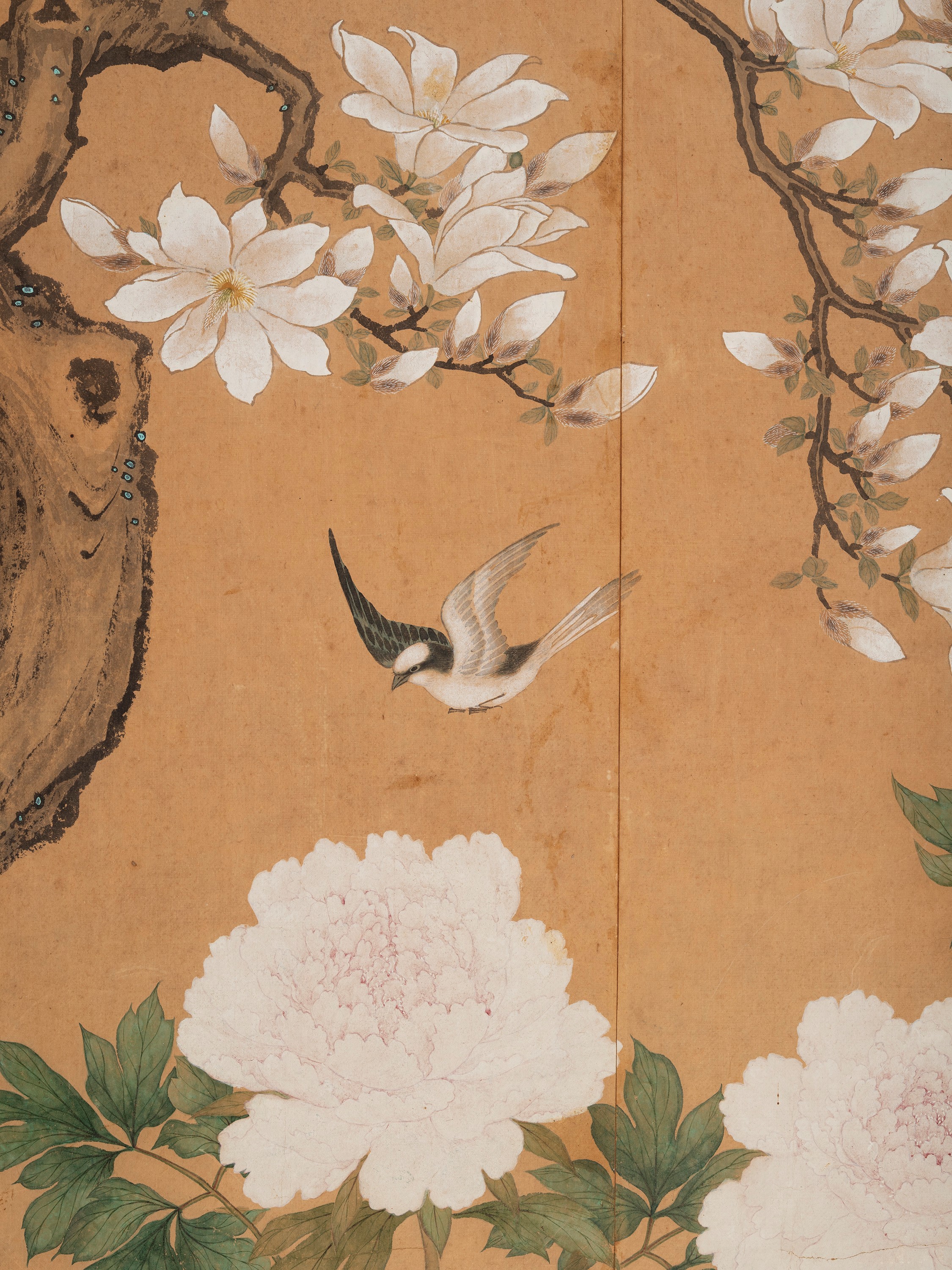 Composed of six panels, it is finely painted with a garden scene featuring vibrant rocks, peonies, plum blossoms, and a flowering magnolia around which two swallows flutter. In the upper right corner are inscriptions bearing the names of the artists Shen Quan, Shen Shijie, and Shen Shiru.
