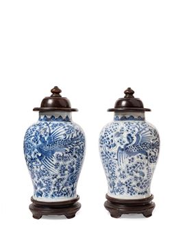 Decorated with phoenixes flying over a floral landscape with peonies. With carved wooden lids, wooden stands.