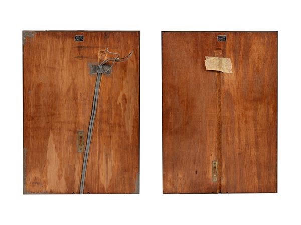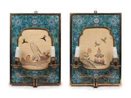Enamelled with refined floral motifs and leafy ramages, each frame is centered by a polylobed reserve enclosing silk fabrics decorated with a boat animated by figures and a landscape with pagodas and birds. Gilt-bronze mounts enriched with two-light candelabra
