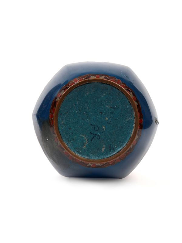 Baluster-shaped, the body is painted on a blue ground with panels depicting dragons and phoenixes, surmounted by a band decorated with floral motifs. The upper section is finely glazed with foliate ramages and chrysanthemums, alternating with lobed panels containing birds.