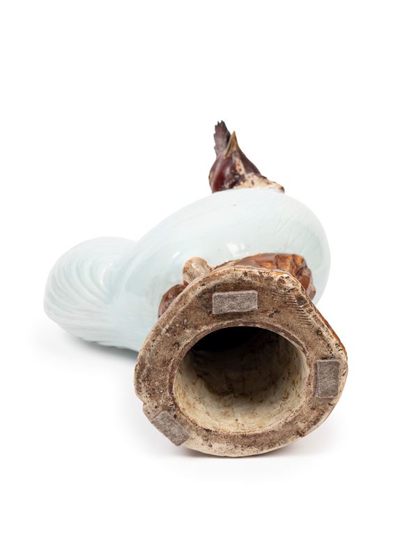 Well modelled in a naturalistic manner as roosters perched upon a rock, their feathers finely incised to create a realistic effect.