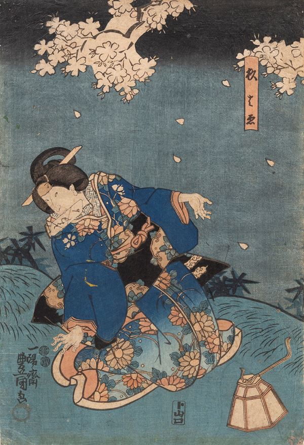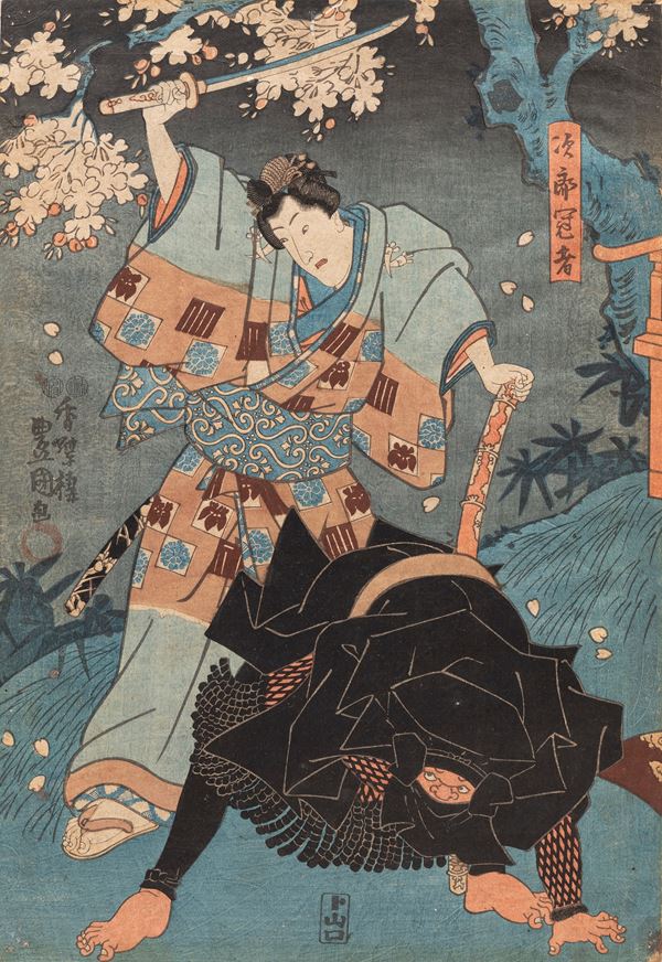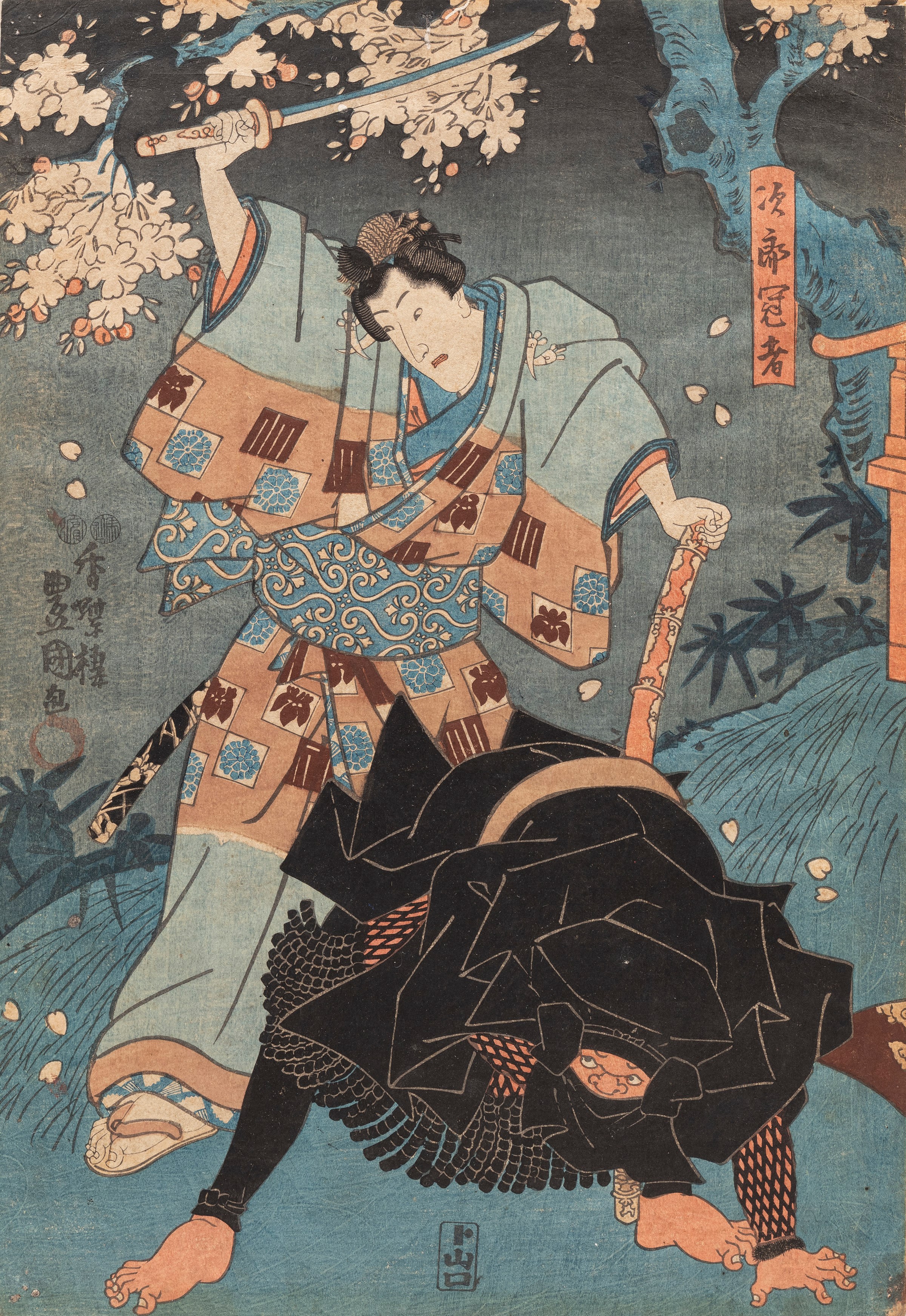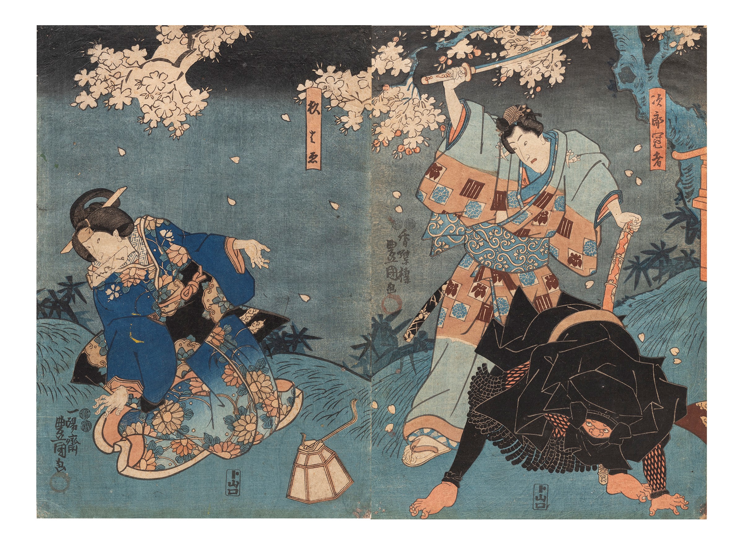 Titled: "Actors Iwai Kumesaburô III as Jirô Kanja and Azuma Ichinojô I as Sugibae", by Utagawa Kunisada.