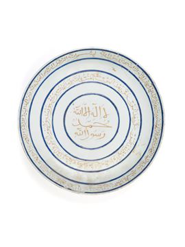Of shallow rounded form on a short foot, the exterior decorated with four white oblong cartouches bearing Qur’anic inscriptions in gold, outlined in red and green enamel, set against a cobalt-blue ground with gilded crescents and stars. The rim features a white band with further Qur’anic inscriptions in gold, while the foot is encircled by a narrow band of green and red enamelled chrysanthemums. The white interior is detailed with concentric blue circles and two bands of Qur’anic inscriptions, the centre with the shahada in large gilded naskh script.
