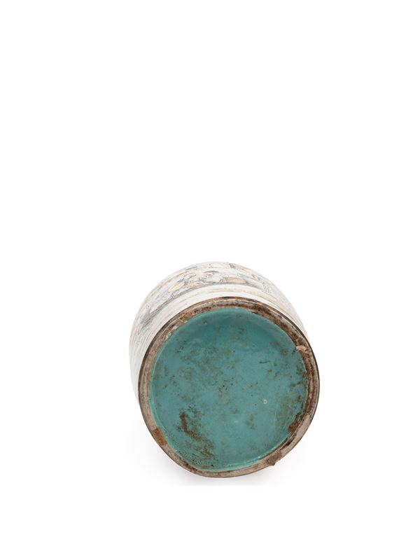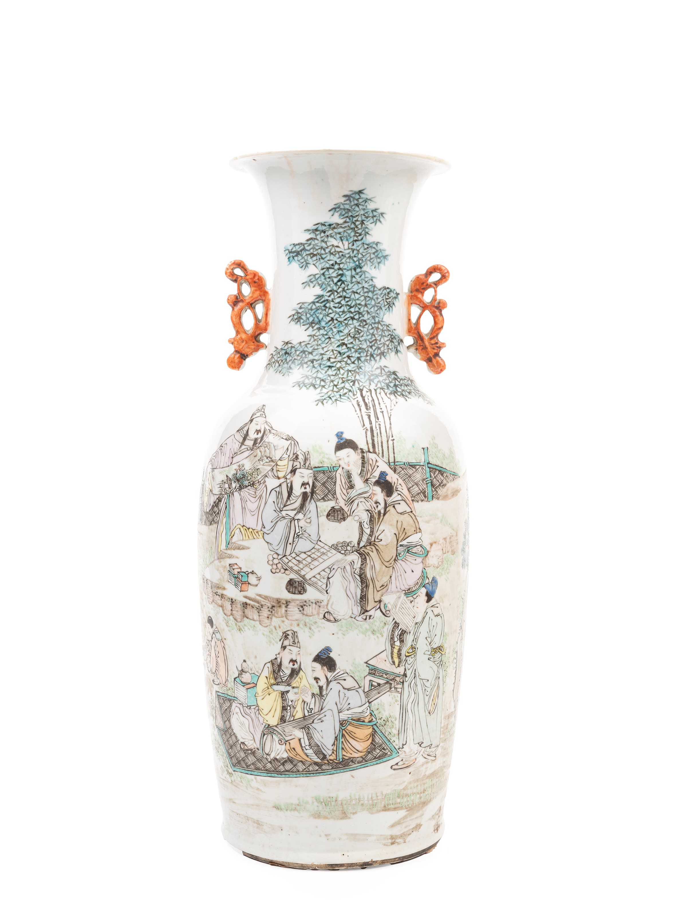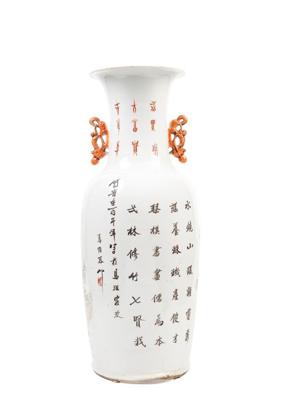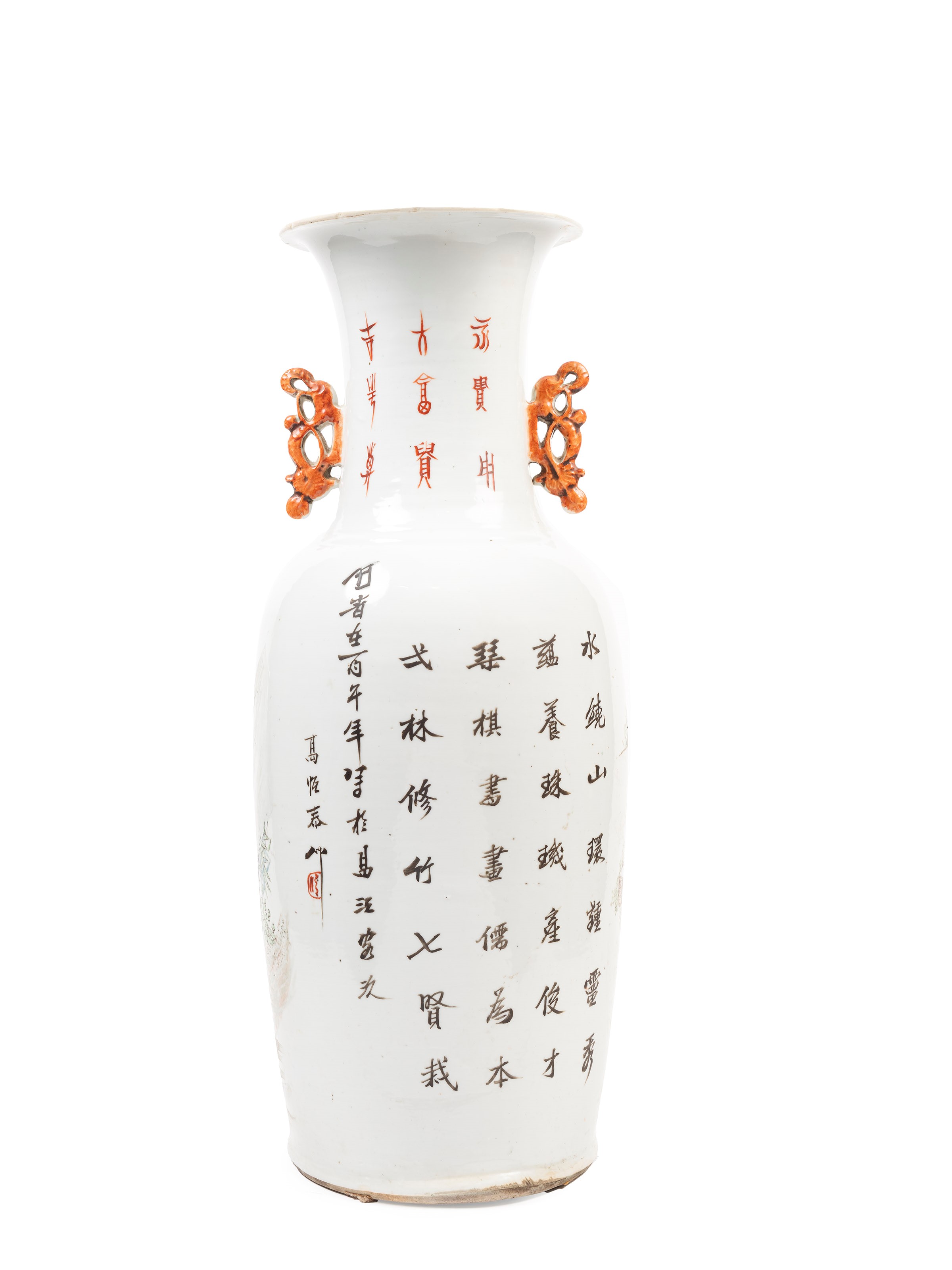 Shaped like a baluster column with handles modeled as mythical creatures, the body is painted with sages and their attendants in a tree-lined courtyard, engaged in playing go, making music, and reading. The reverse bears poetic inscriptions with the signature of the artist Gao Hengtai (高恒泰) and the date bing wu (丙午) corresponding to 1906.