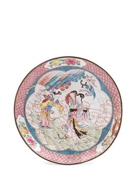 Finely painted at the center with a lobed reserve enclosing a scene within a naturalistic landscape with clouds, waves and a phoenix in flight, where two elegantly dressed ladies with elaborately arranged coiffures meeting a young figure carrying a basket of fruit and a staff. The rim decorated with pink geometric motifs alternating with reserves containing cartouches adorned with fruits and flowers. The reverse painted with leafy and floral designs.