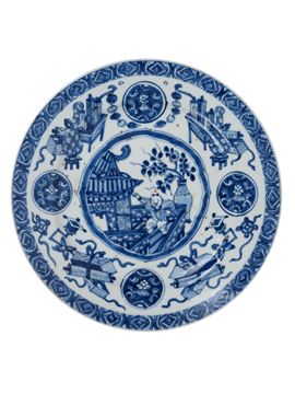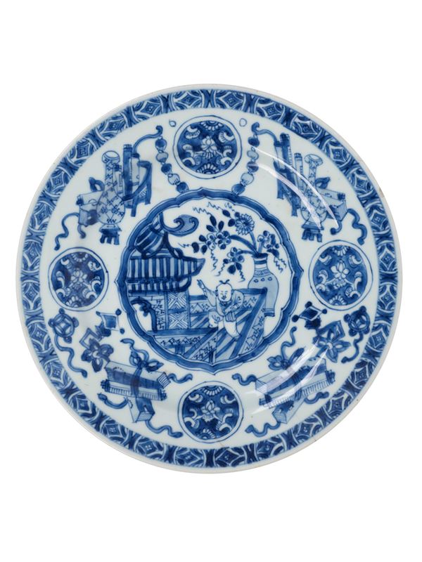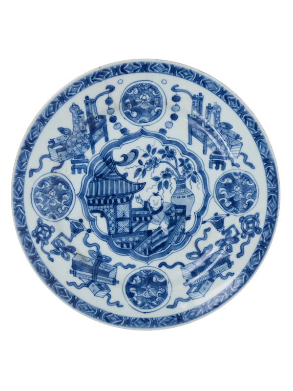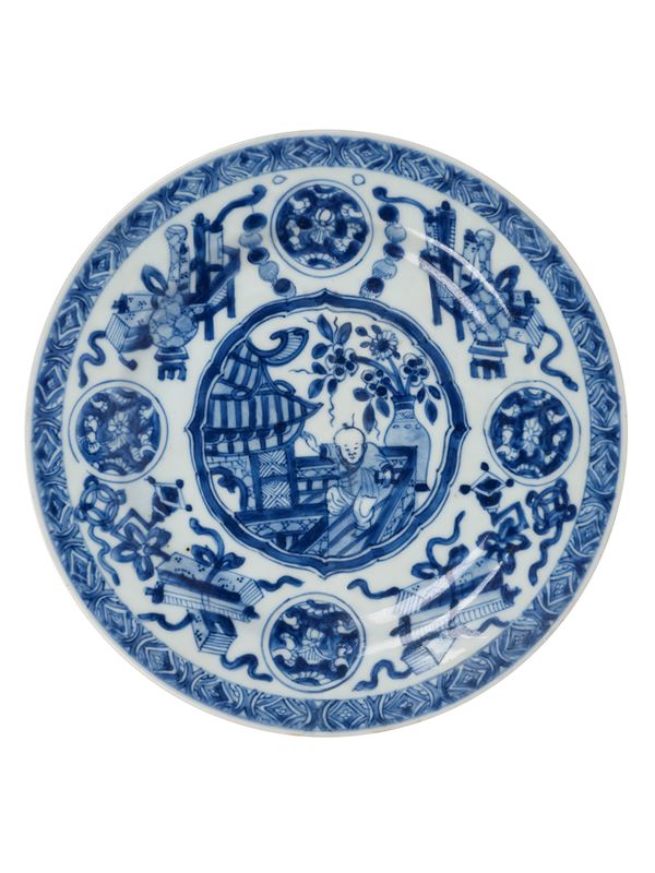 Painted in various shades of blue, with a central lobed medallion enclosing a dancing boy on a terrace, surrounded by Buddhist emblems and precious objects; the exterior decorated with stylized flowering branches.