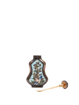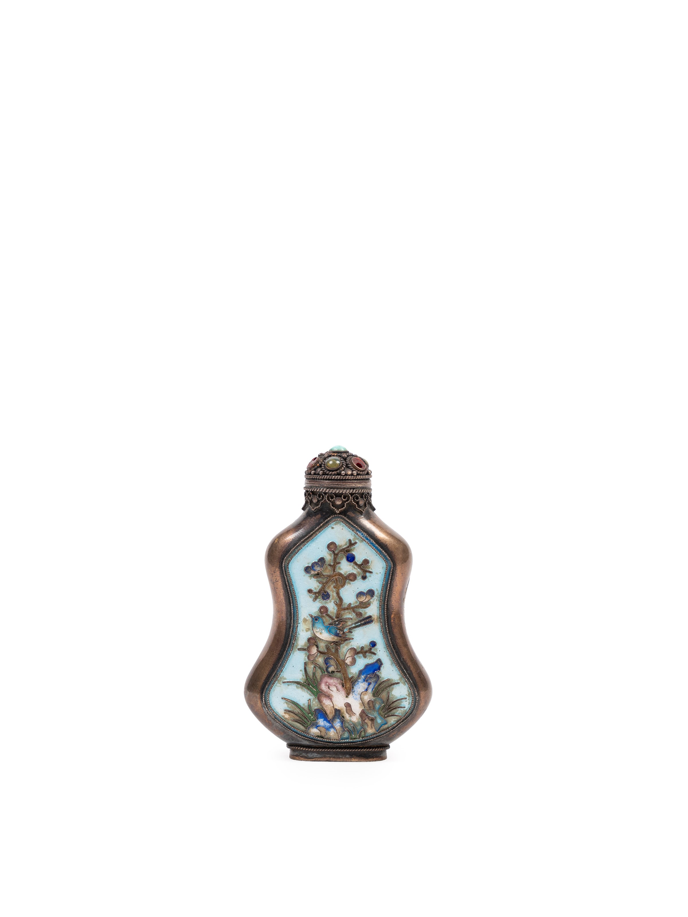 Finely decorated on both sides with a naturalistic landscape depicting a tree and a bird against a pale blue ground. The neck is encircled by a band of ruyi motifs, while the stopper is adorned with hardstones and surmounted by a turquoise.