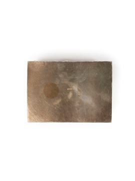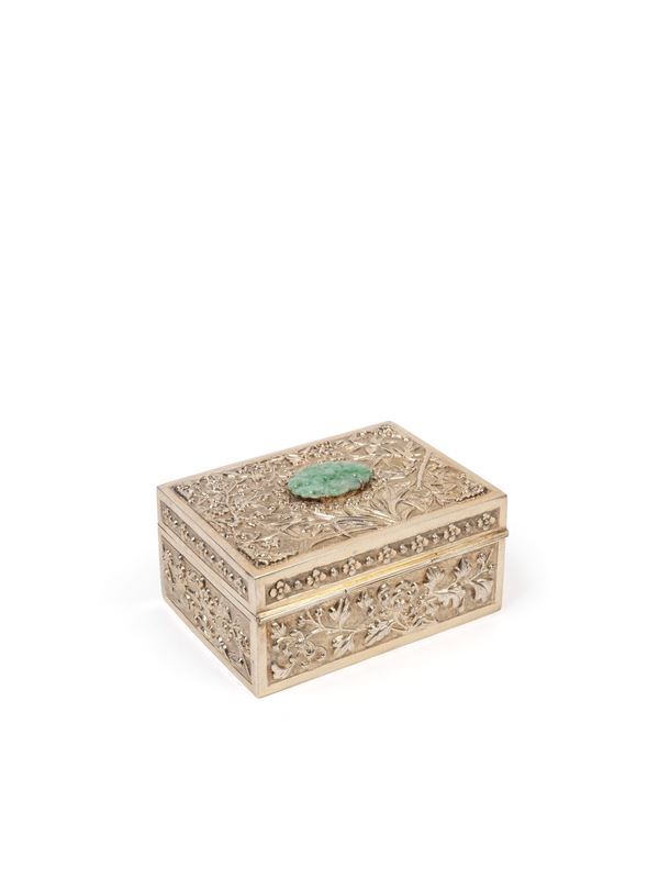 Of rectangular form, finely chased on the sides with bamboo and peach blossom motifs; the lid is richly embossed with foliate, floral, and bat decorations, and is centered by a small jadeite carving depicting leaves. Weight g 178.