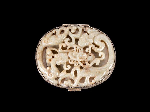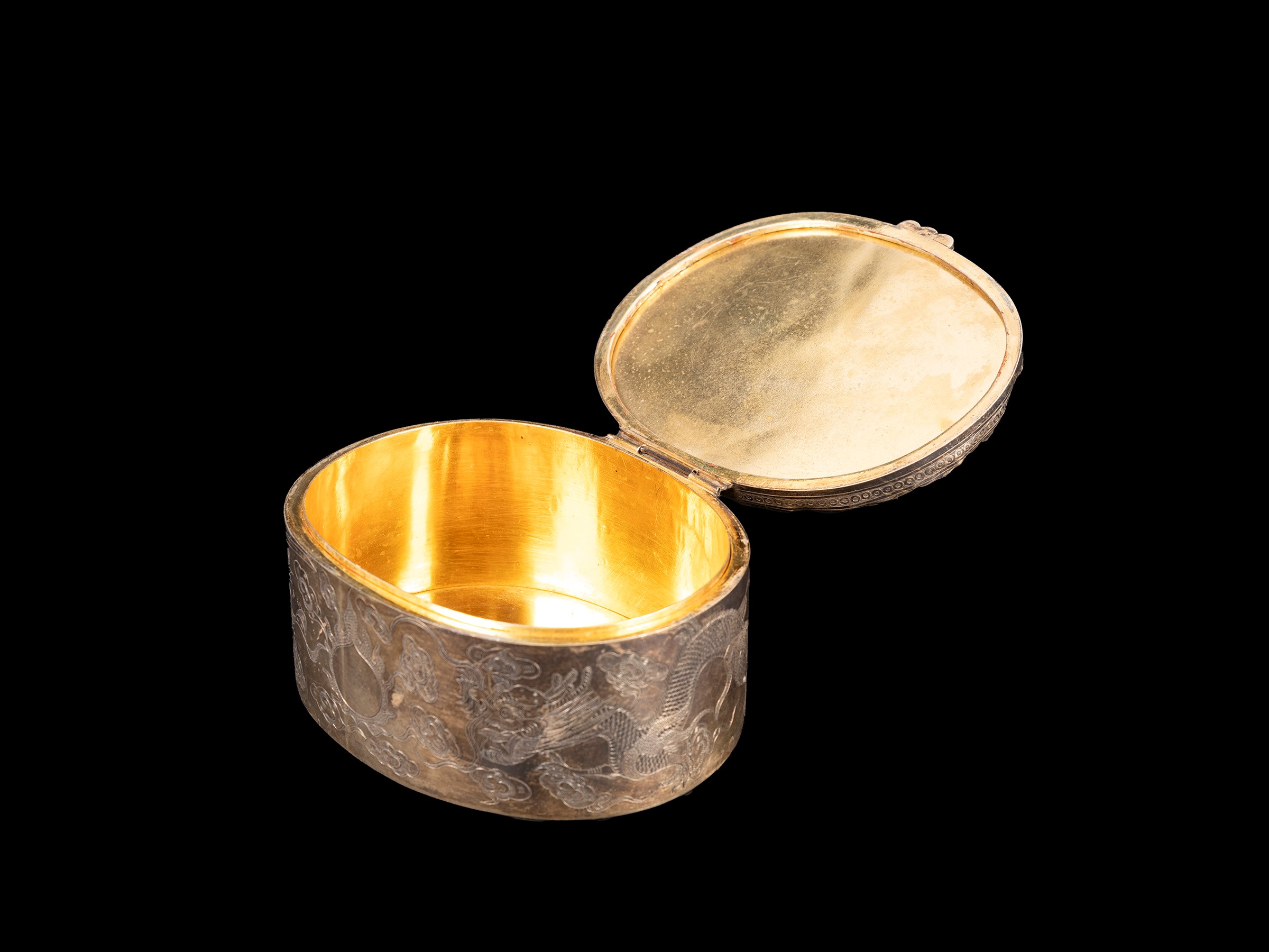The 800 silver box with a vermeil interior, is finely engraved with dragons and phoenixes flying among stylized clouds while chasing the pearl; the lid is celadon jade, carved and pierced with two qilong dragons amid floral motifs.