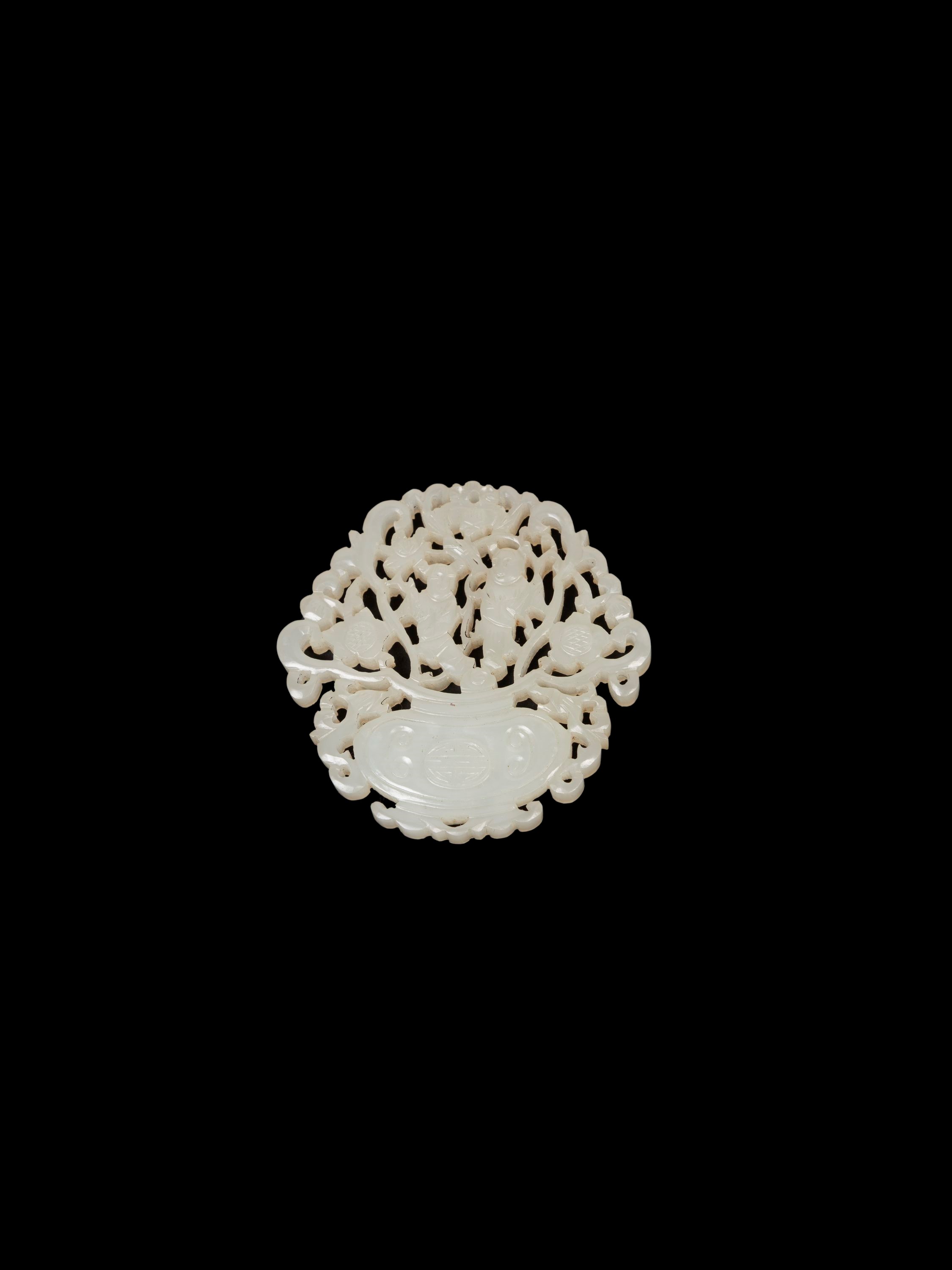 Carved and pierced, it depicts a vase from which two figures emerge amid floral motifs and bats.
