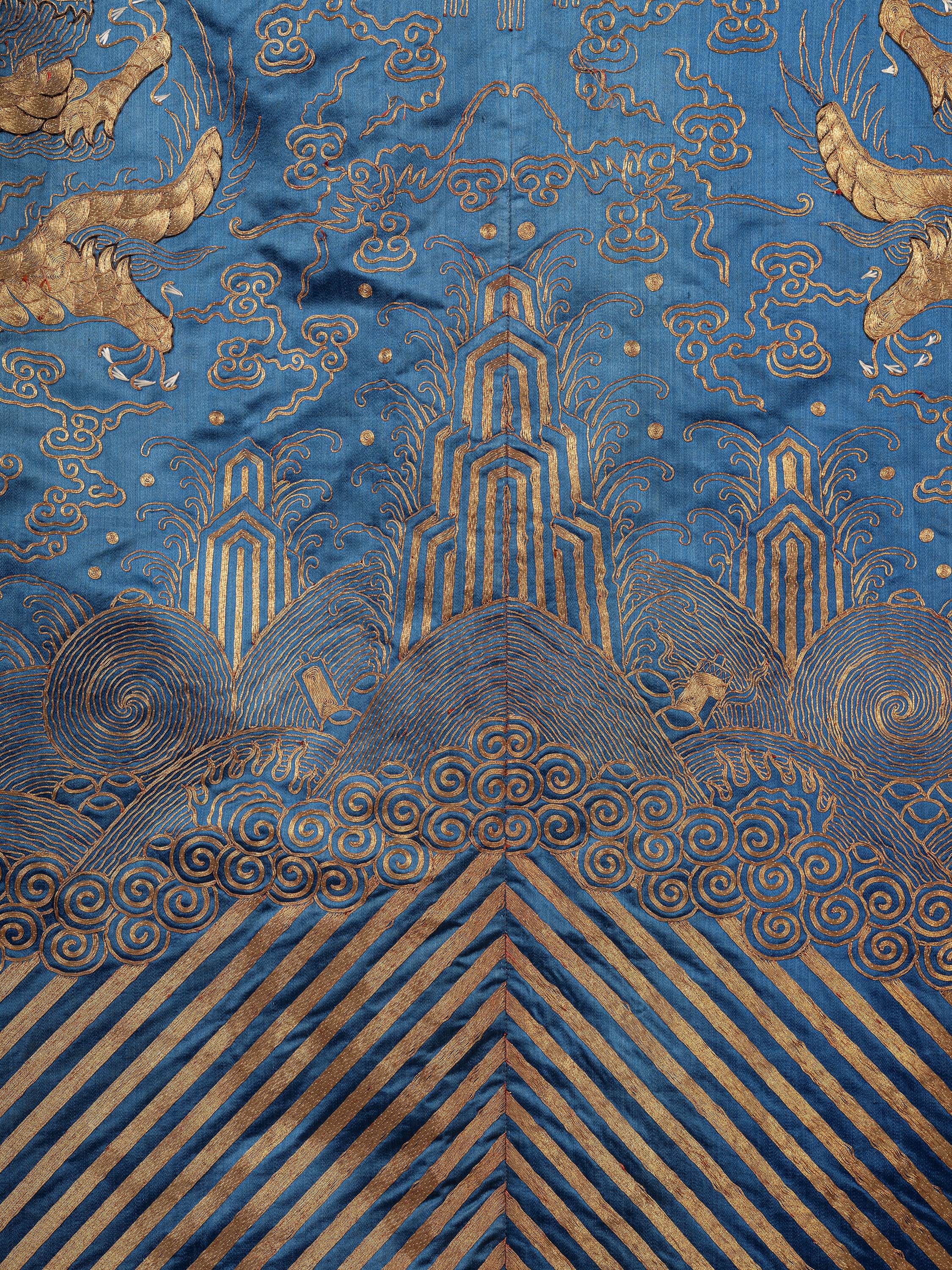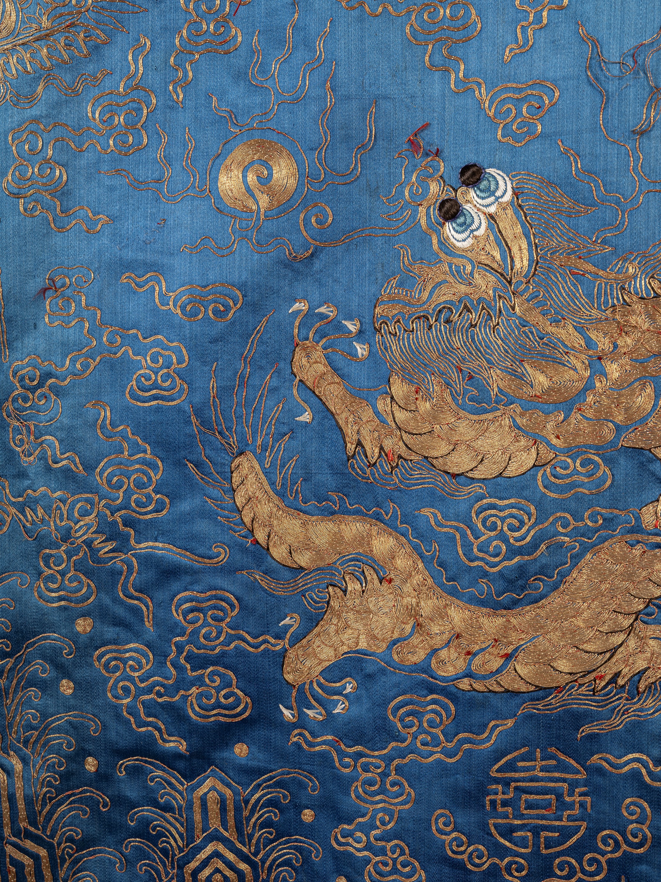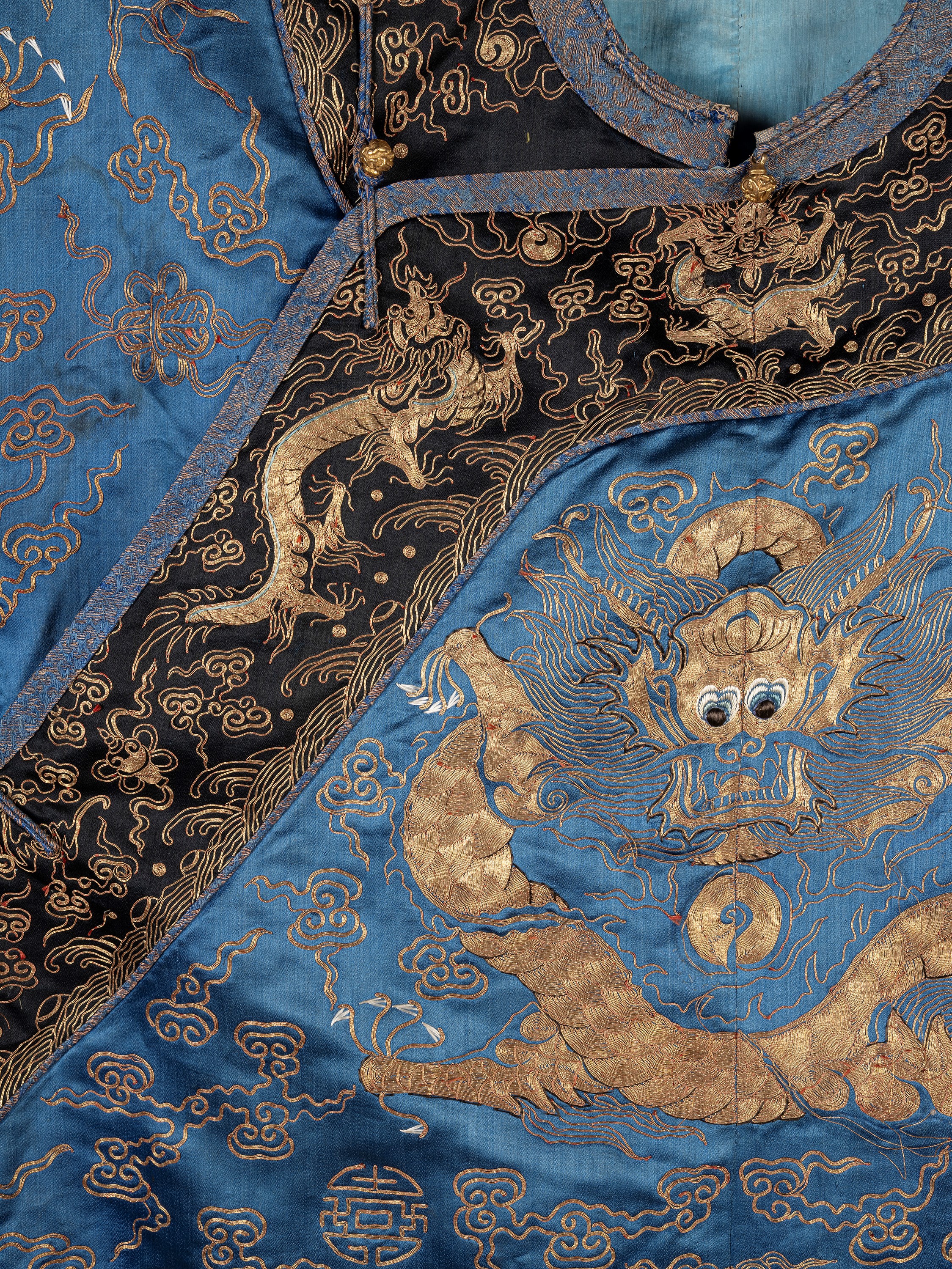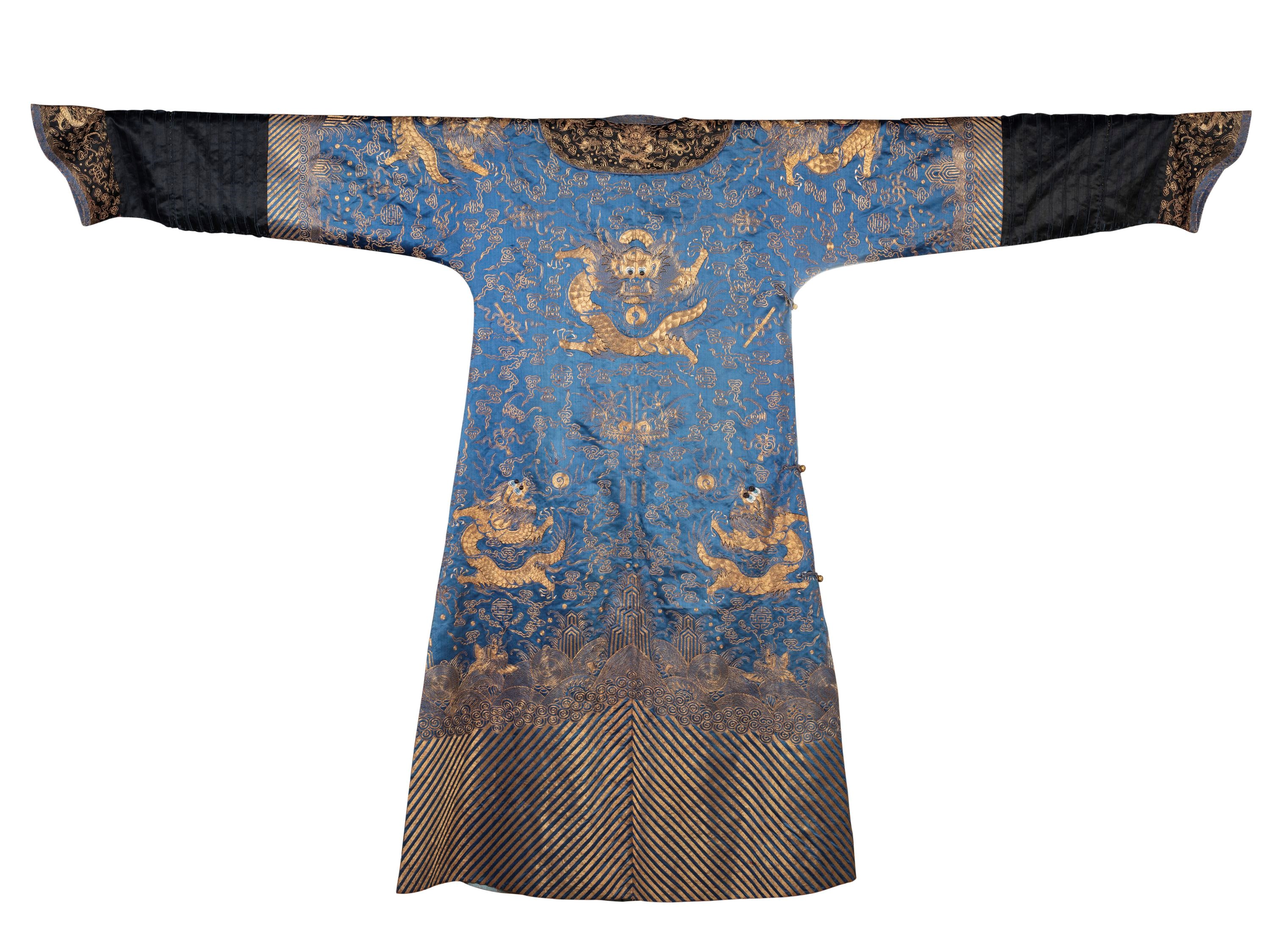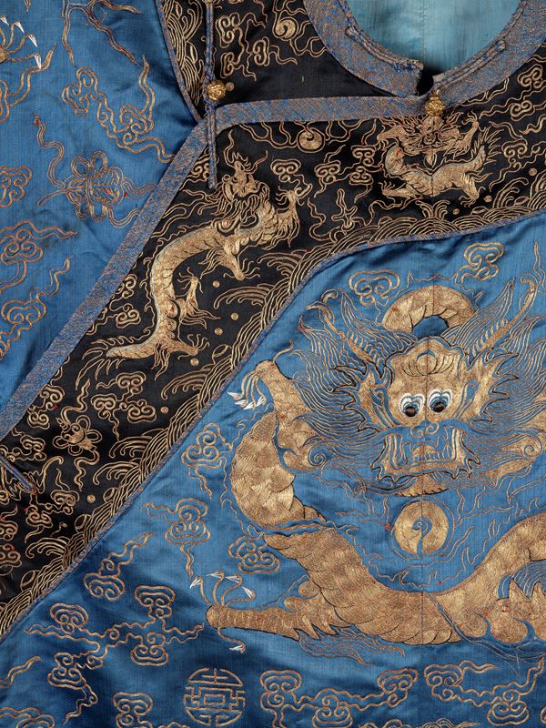 On a blue ground, it is finely embroidered with nine five-clawed dragons in gold thread, set among clouds, bats, flowers, bājíxiáng, and stylized waves. The sash and cuffs, embroidered on a black ground, feature similar decorations with dragons, clouds, and bats.