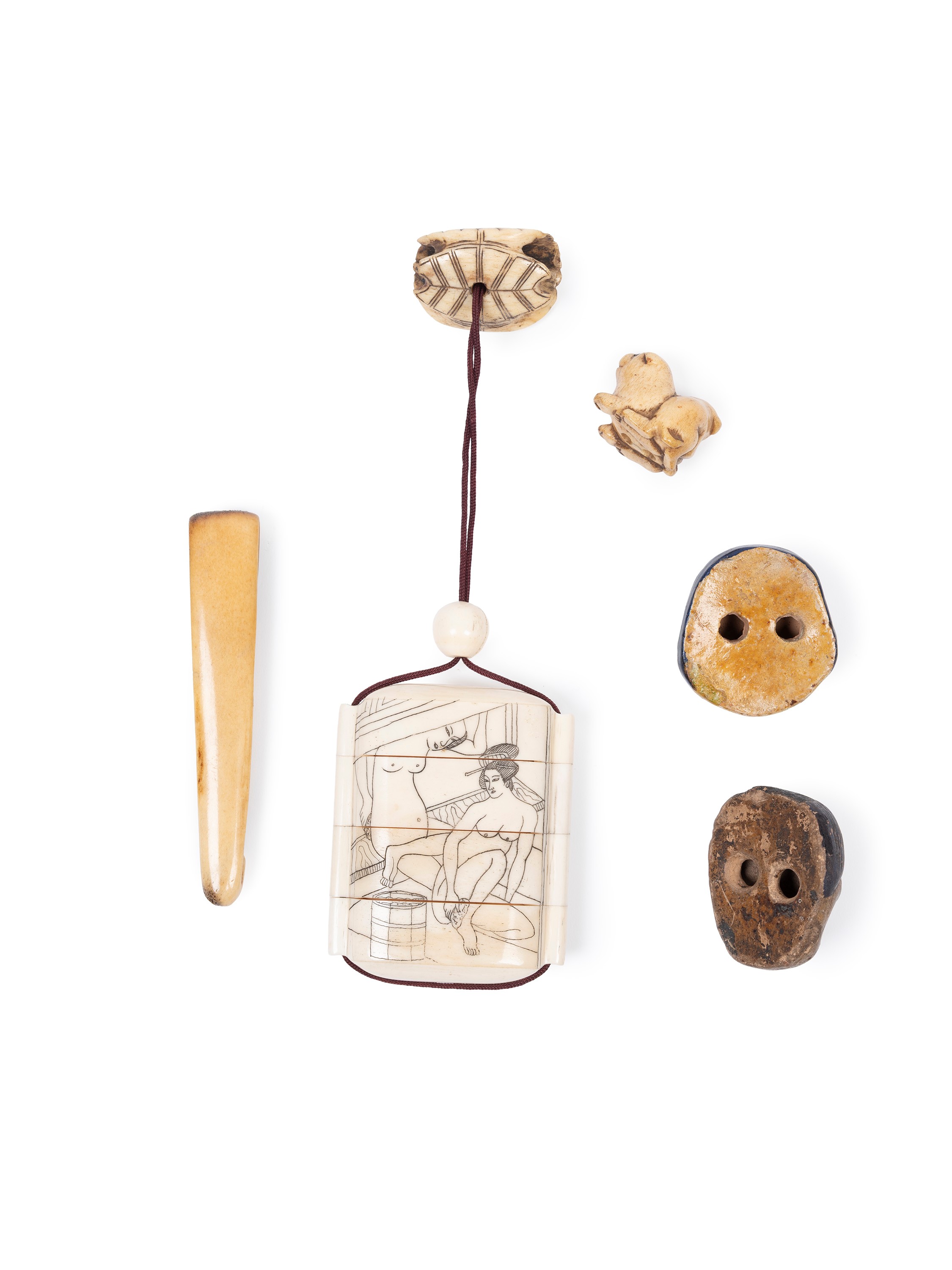 AN EROTIC INRŌ (SHUNGA) IN BONE AND FOUR NETSUKE, Japan, Meiji period (1868-1912)