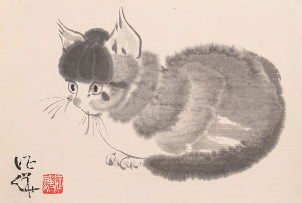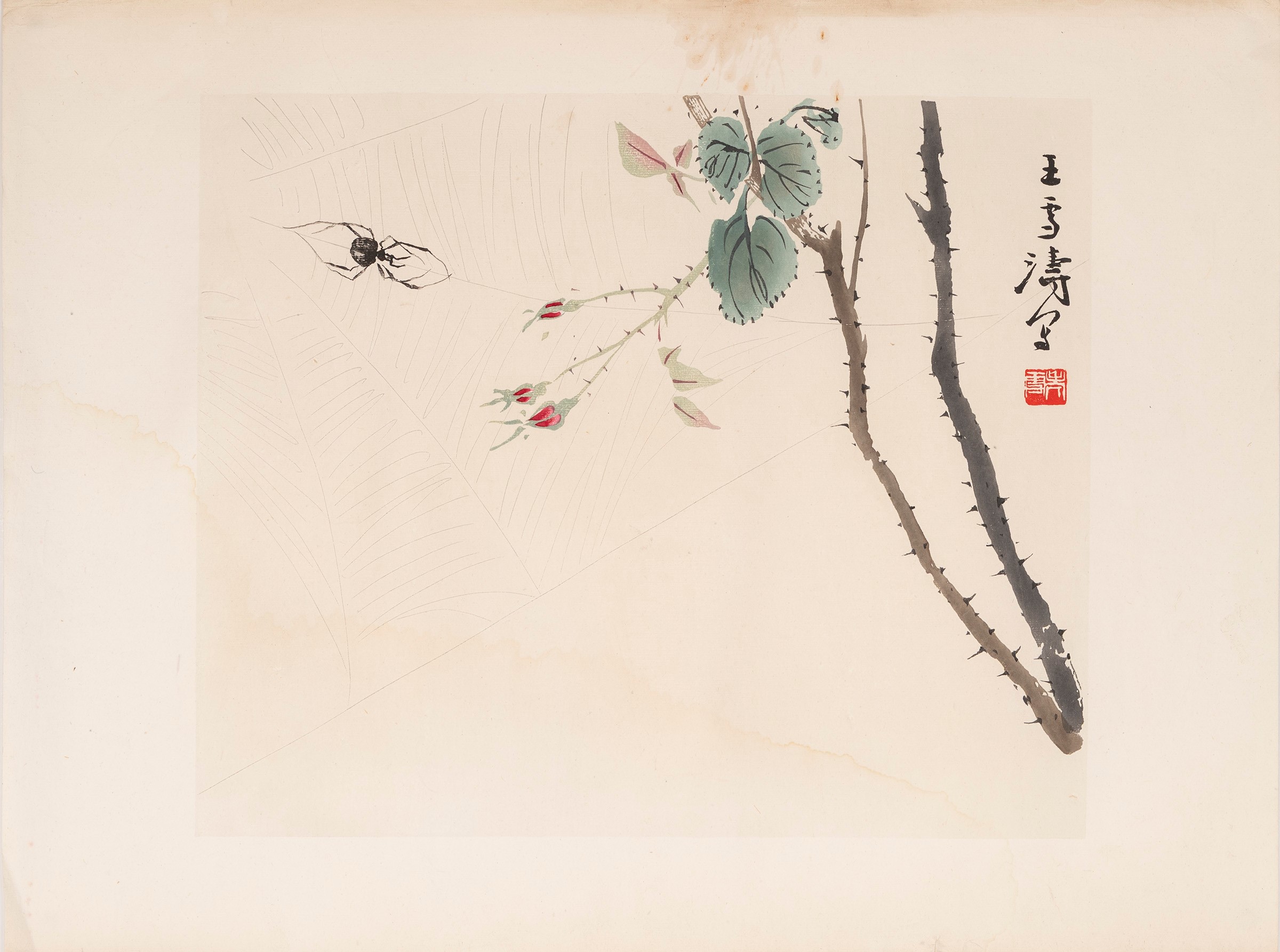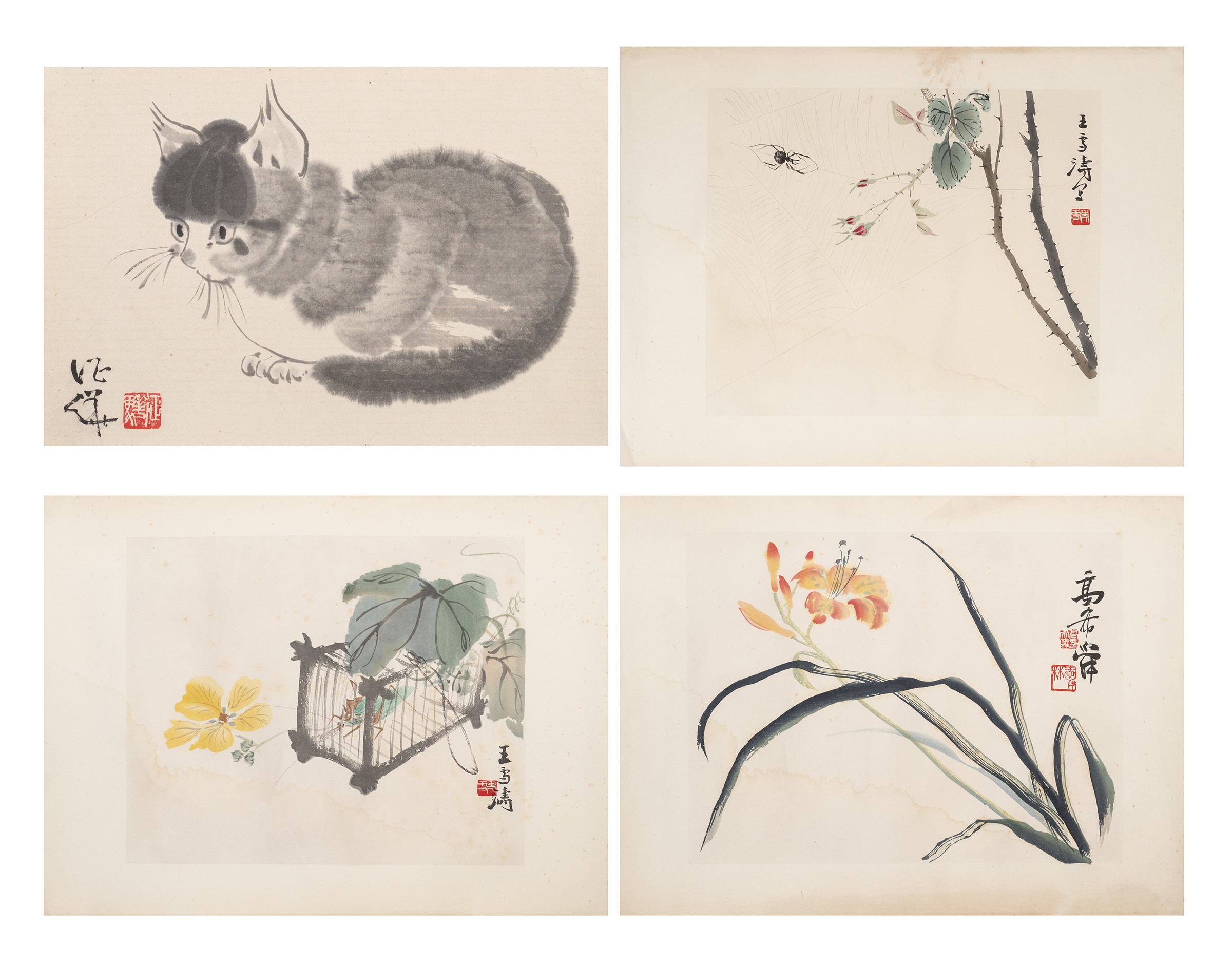 One depicting a cat; three by the artist Wang Xue-tao, two depicting a spider, roses and a cricket inside a cage, and one depicting a plant with a flower.