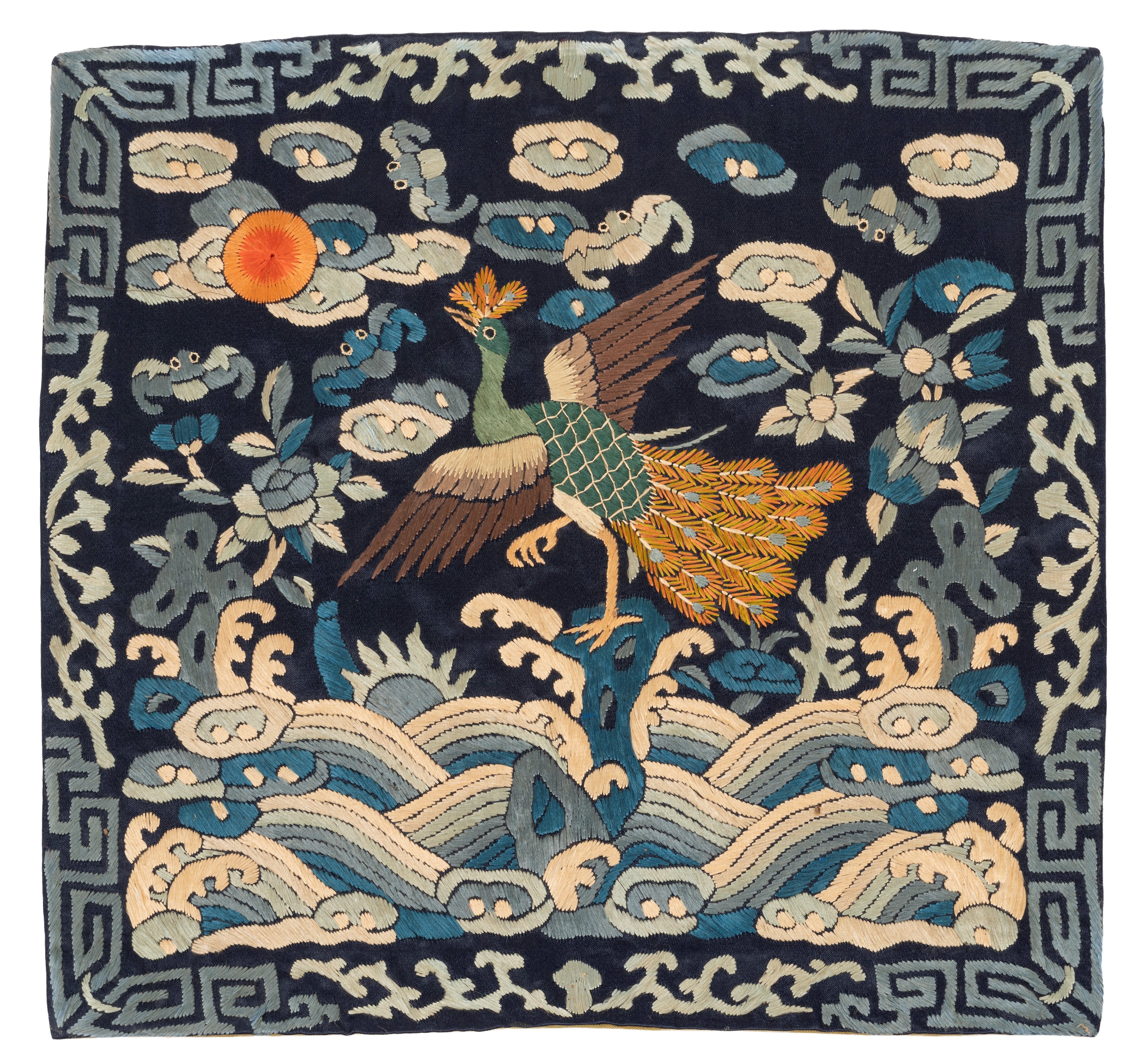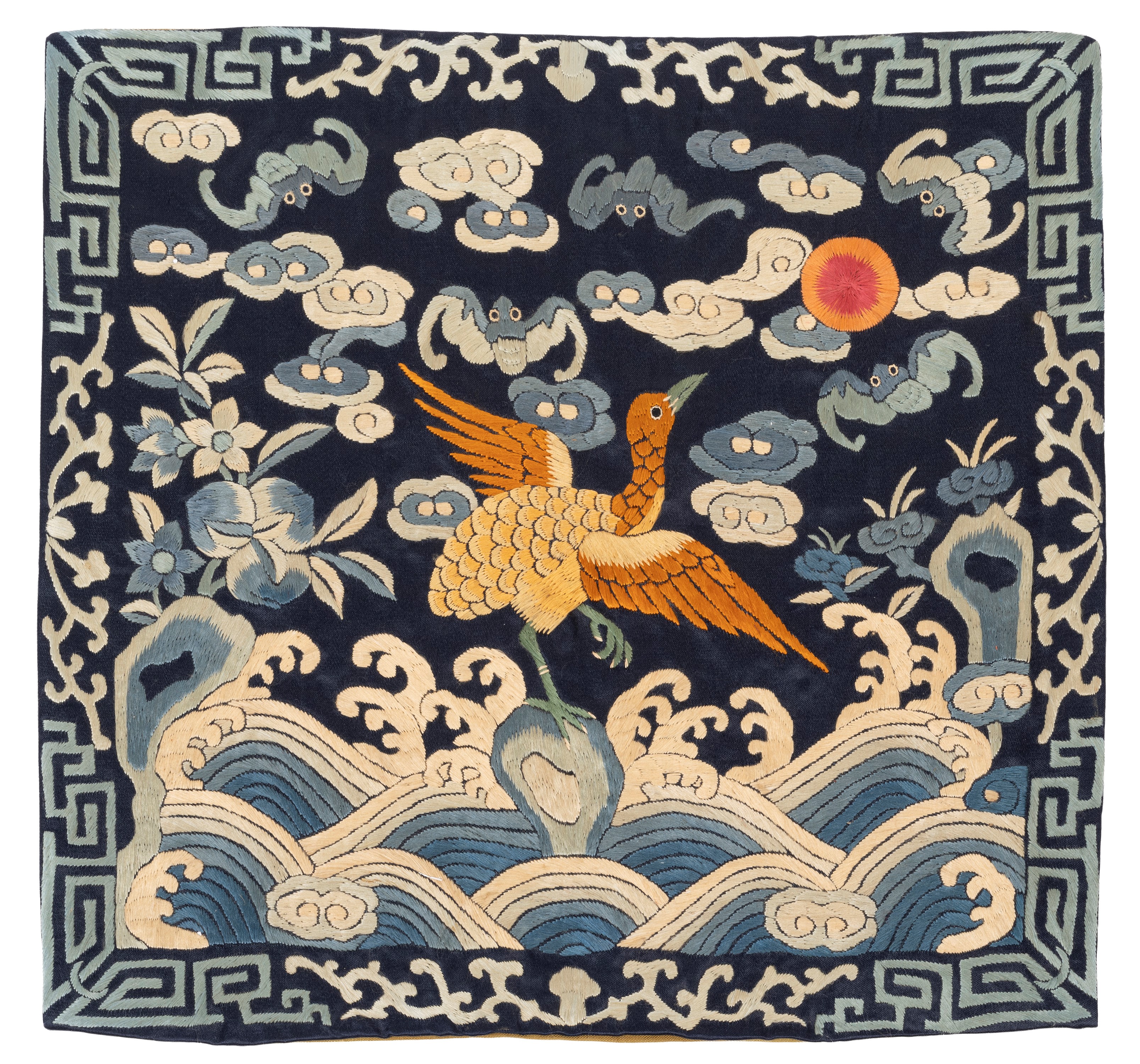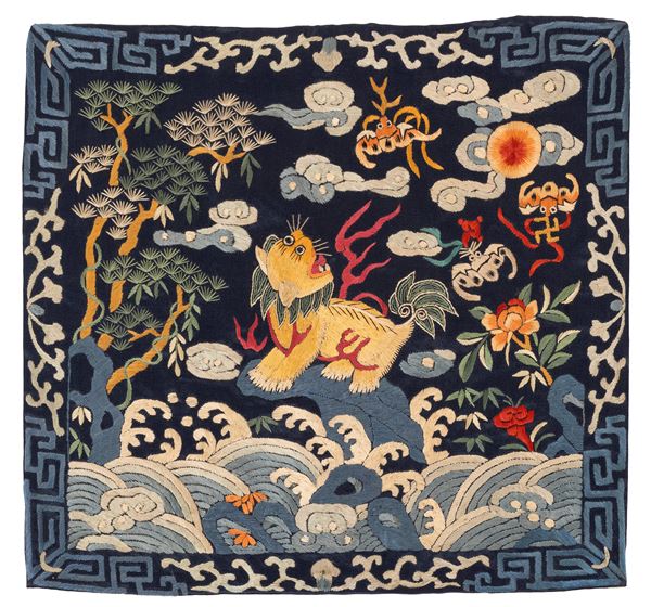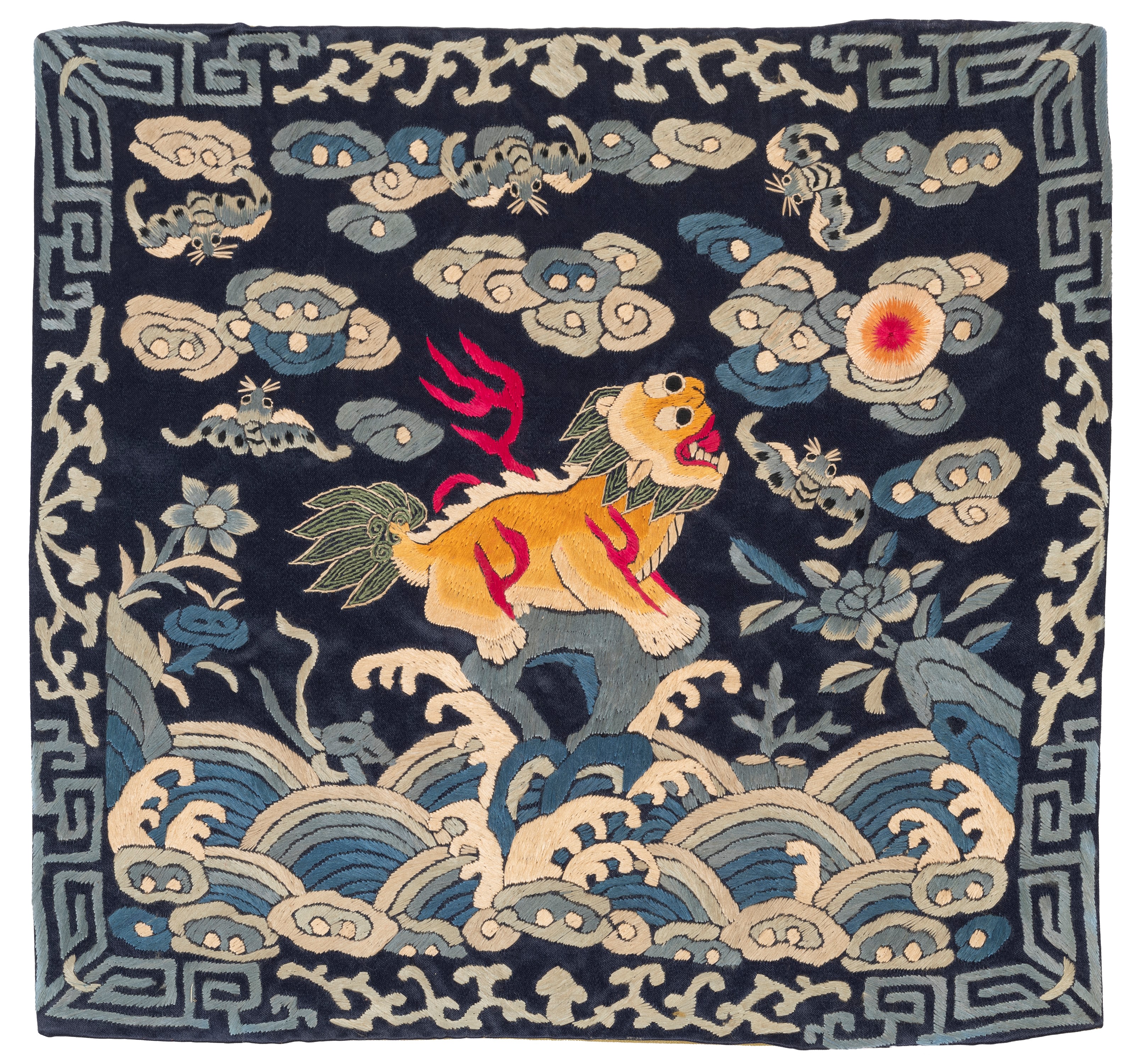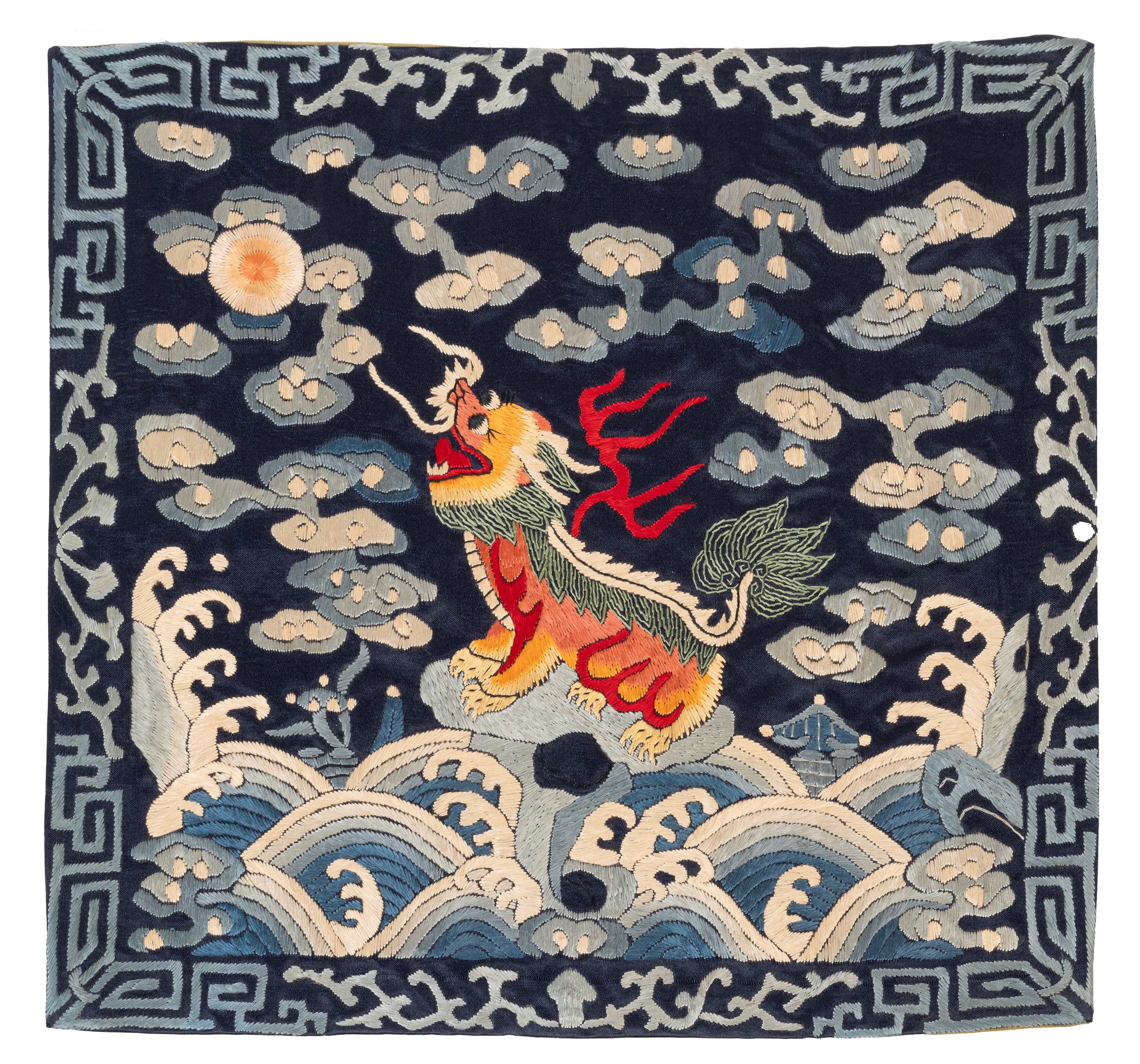 Square in form, with borders embroidered in a Greek key and floral motifs, decorated with kirin and birds on a blue ground enriched with clouds, waves, bats, and stylized foliate patterns.