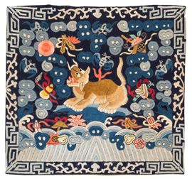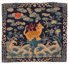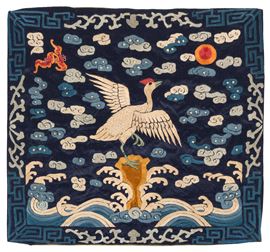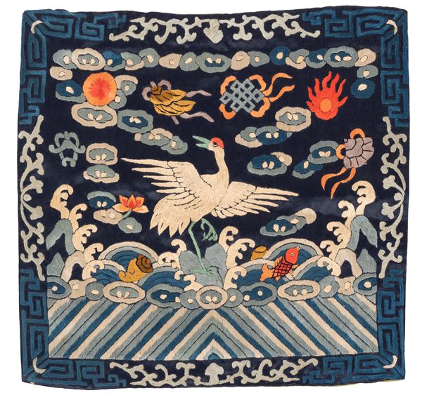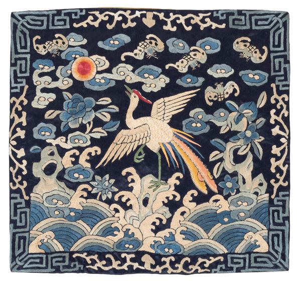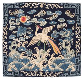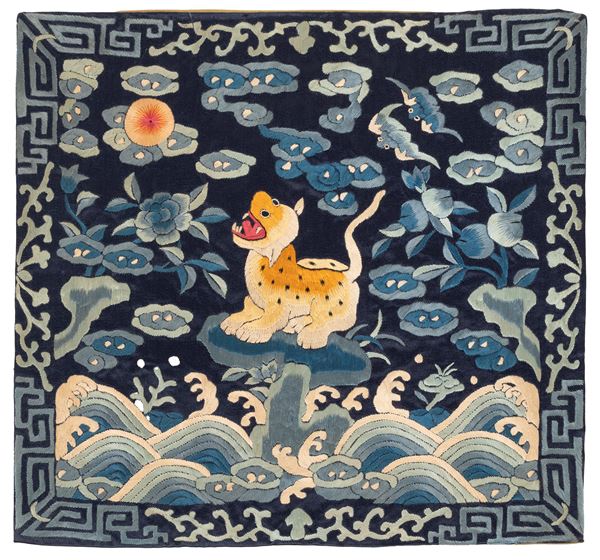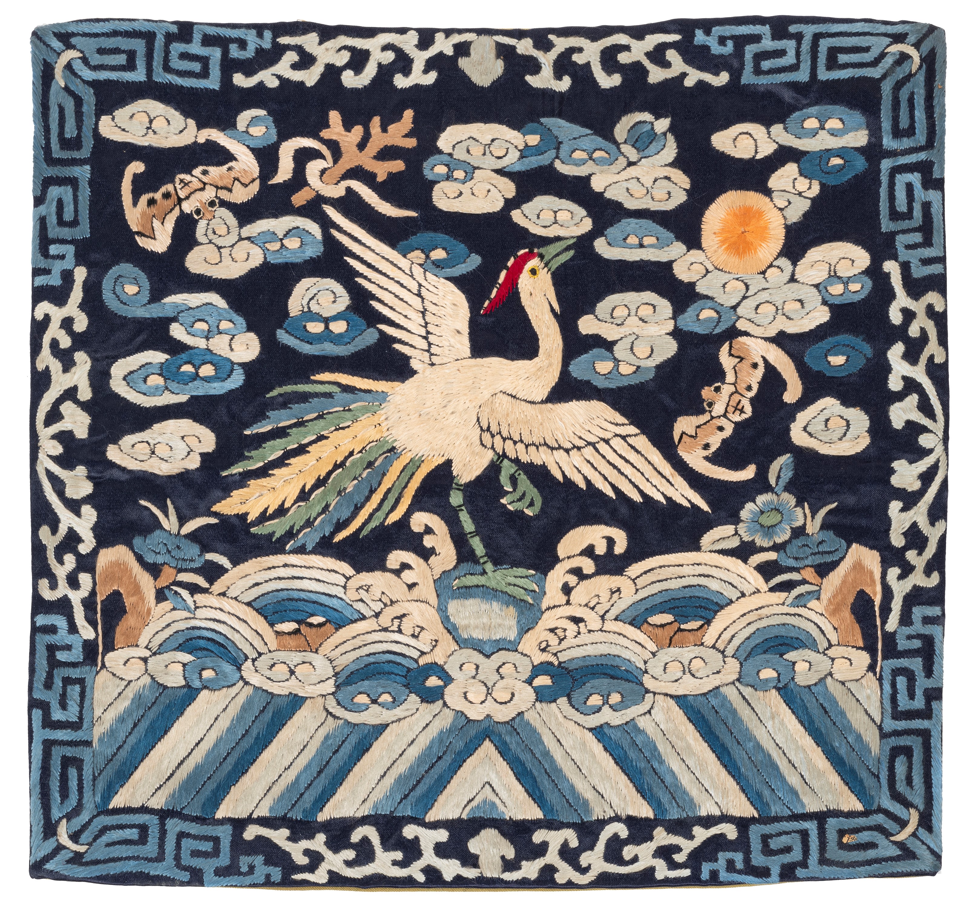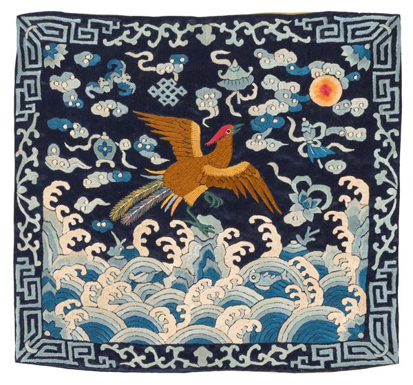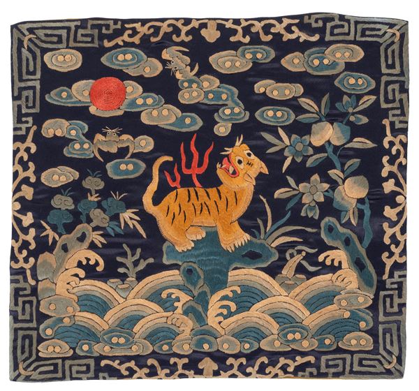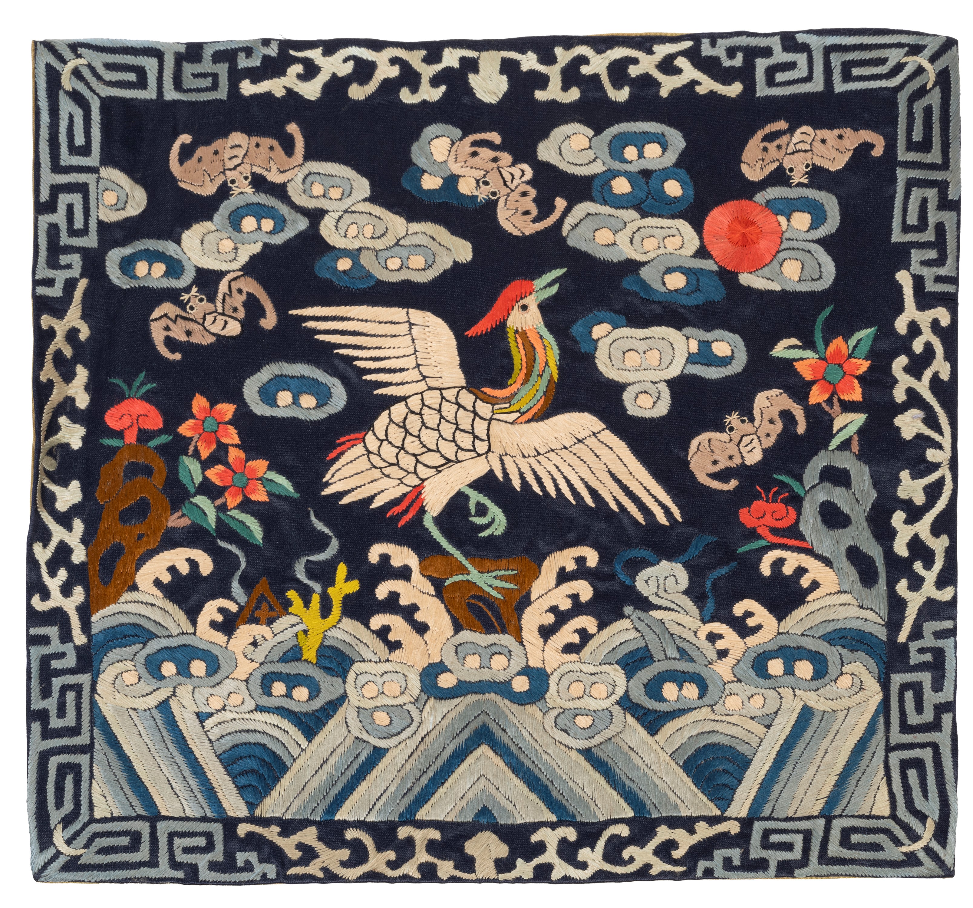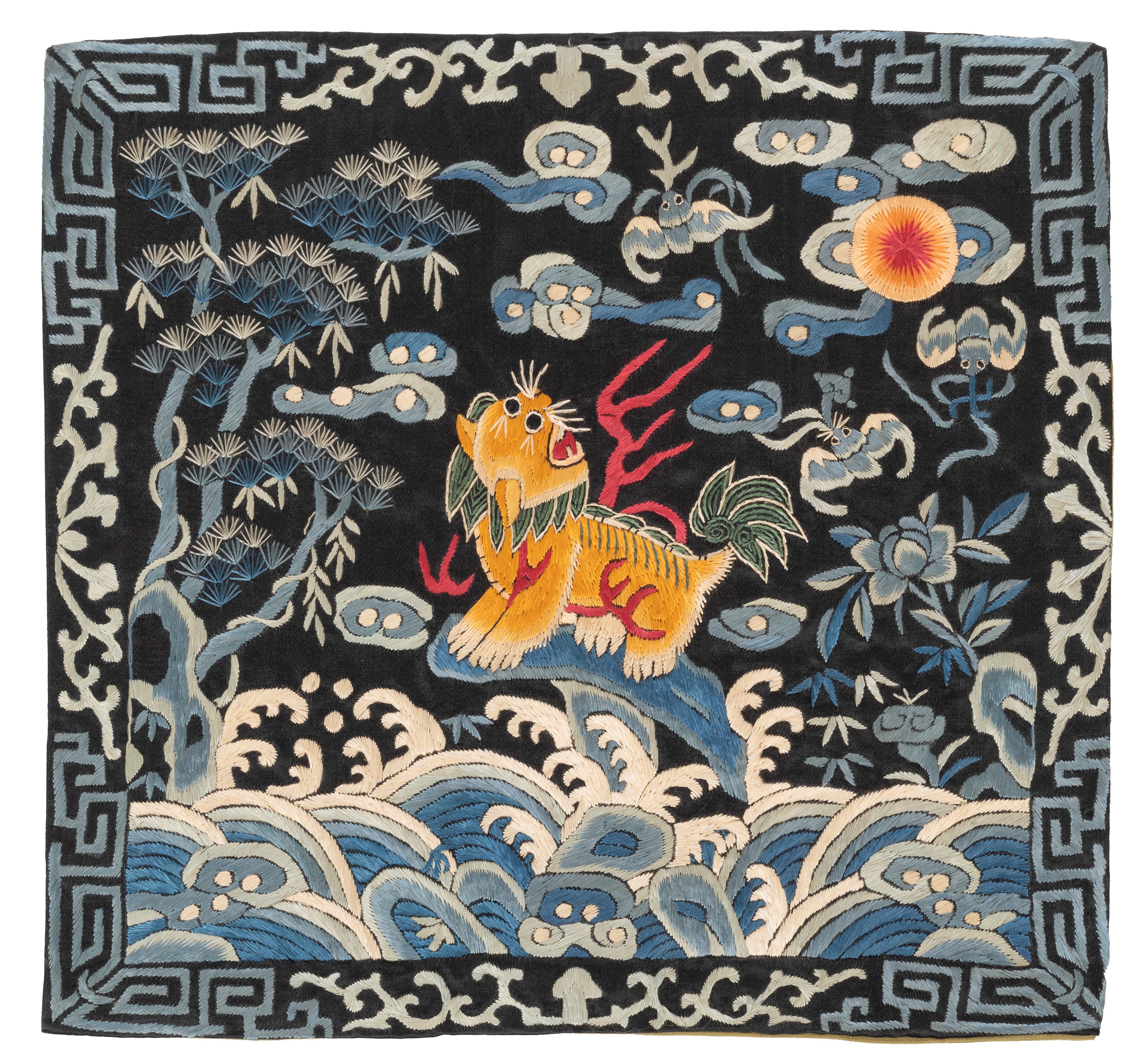 Square in form, with borders embroidered in a Greek key and floral motifs, decorated with kirin and birds on a blue ground enriched with clouds, waves, bats, and stylized foliate patterns.