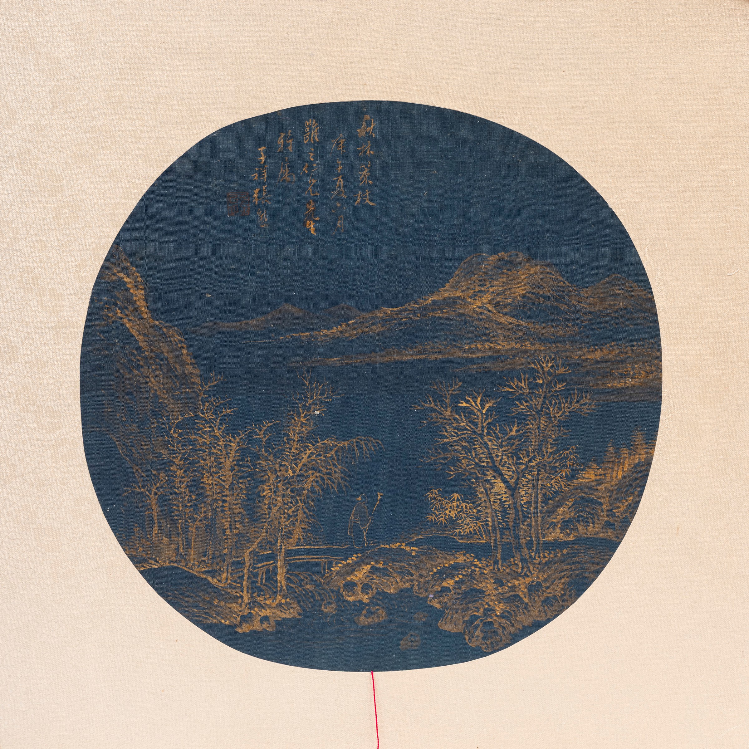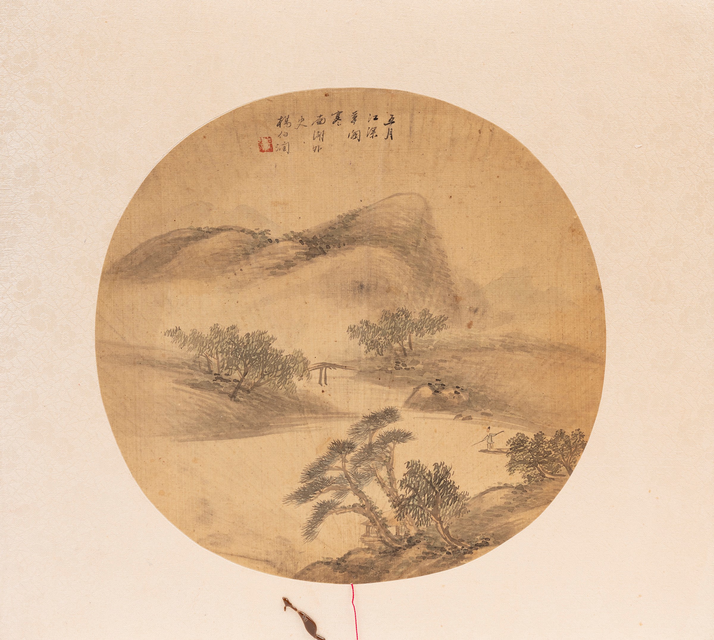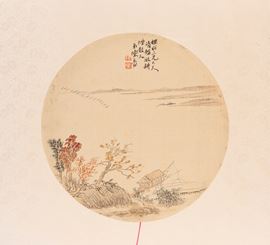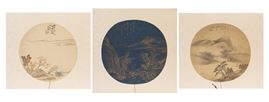 Of circular form, they depict river landscapes with pagodas, fishermen, trees and mountains, accompanied by inscriptions.