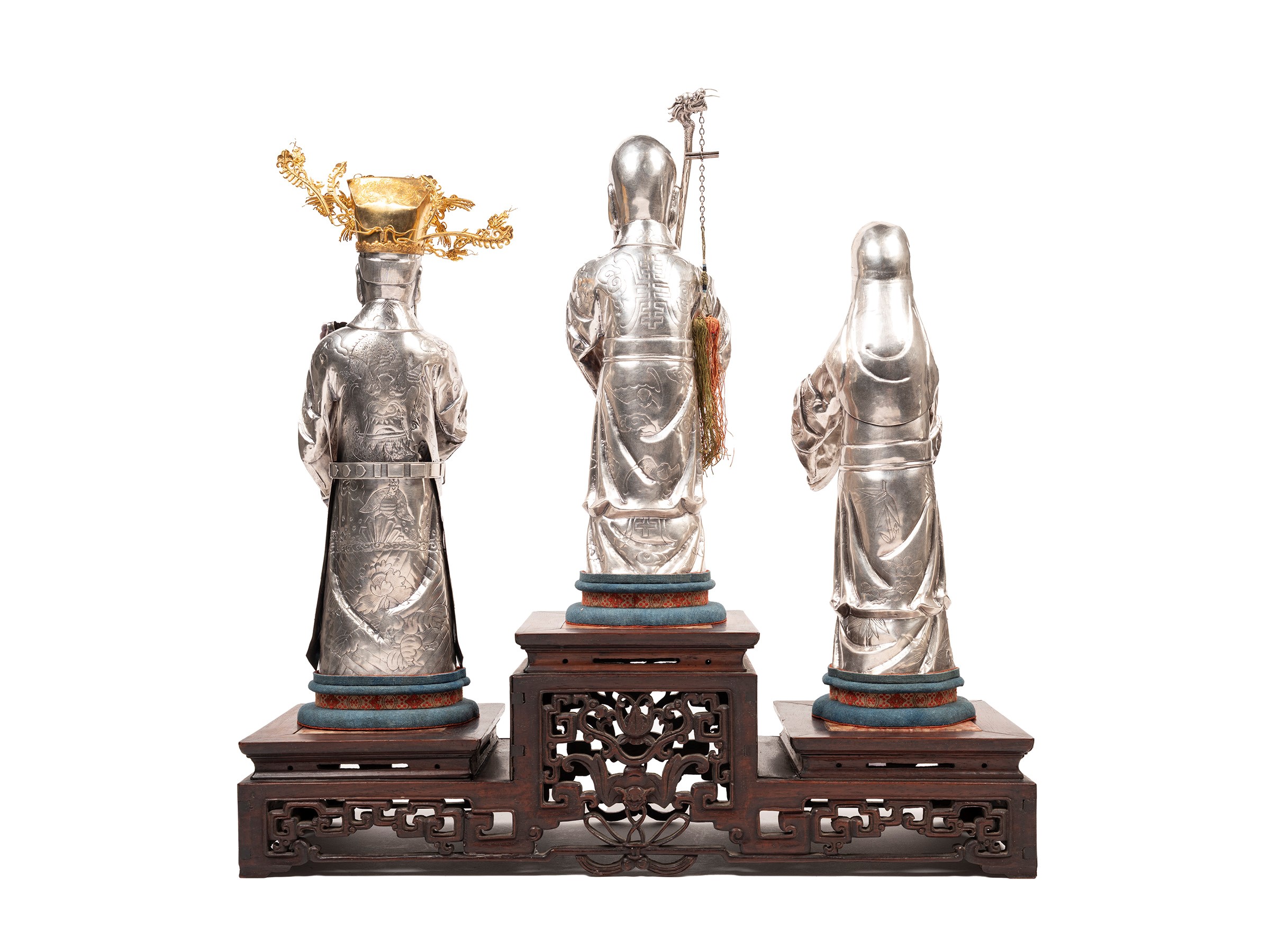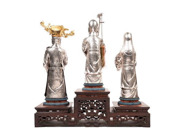 Depicting the San Xing (Three Stars), deities from Chinese mythology, dressed with finely engraved and chiseled robes, standing on a wooden base in their traditional positions. Weight 1.480 g