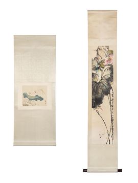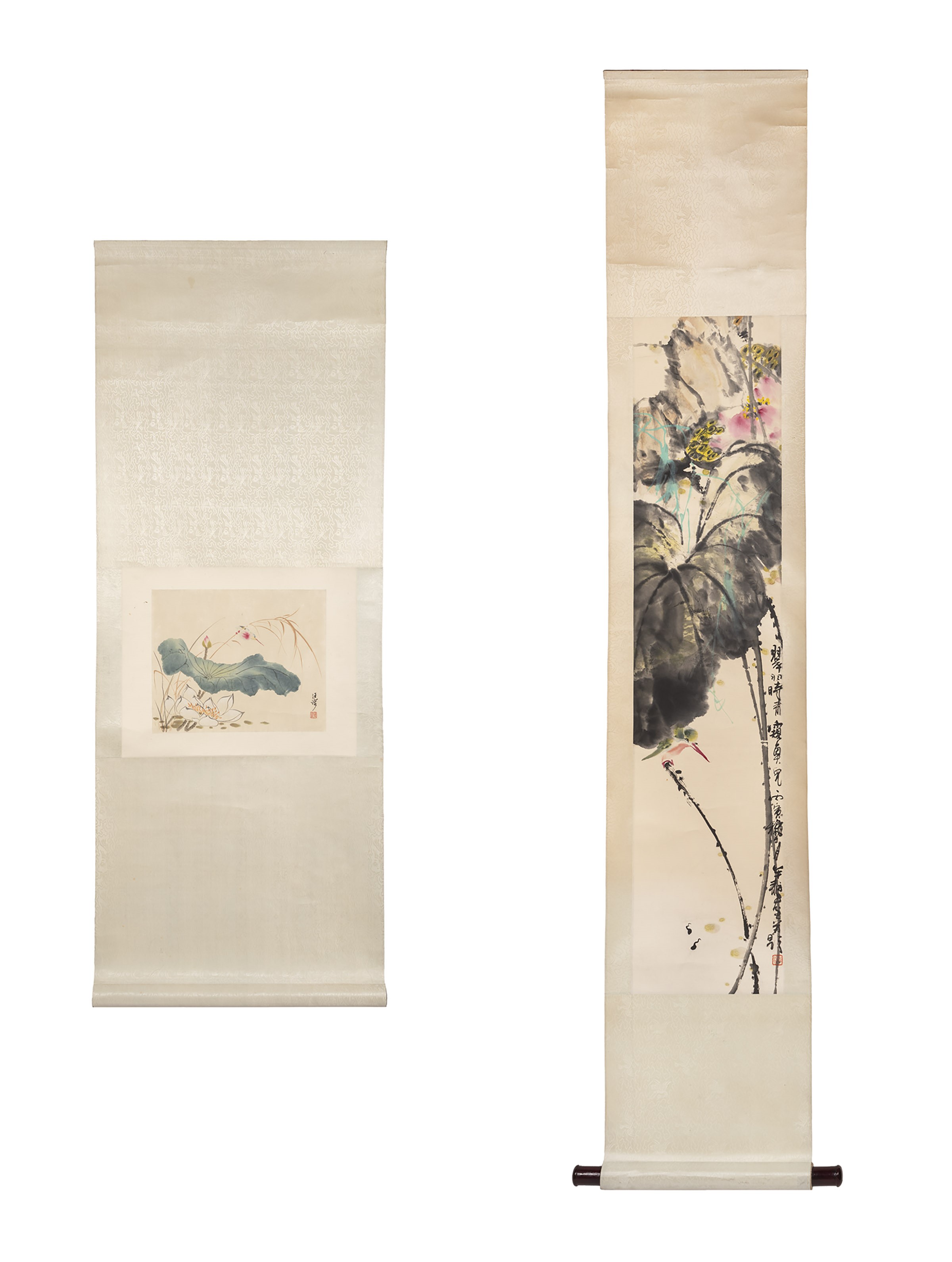 Both depicting lakeside landscapes with lotus flowers and birds. Both with inscriptions.