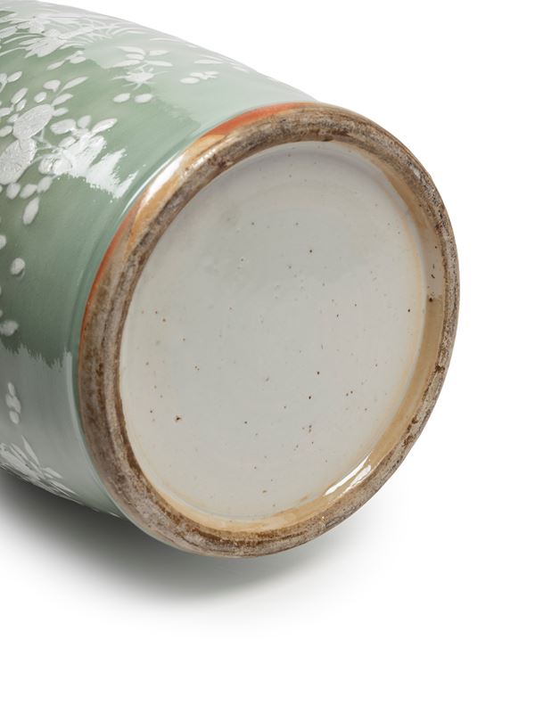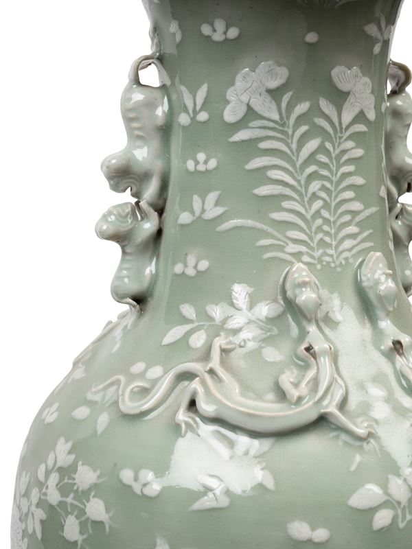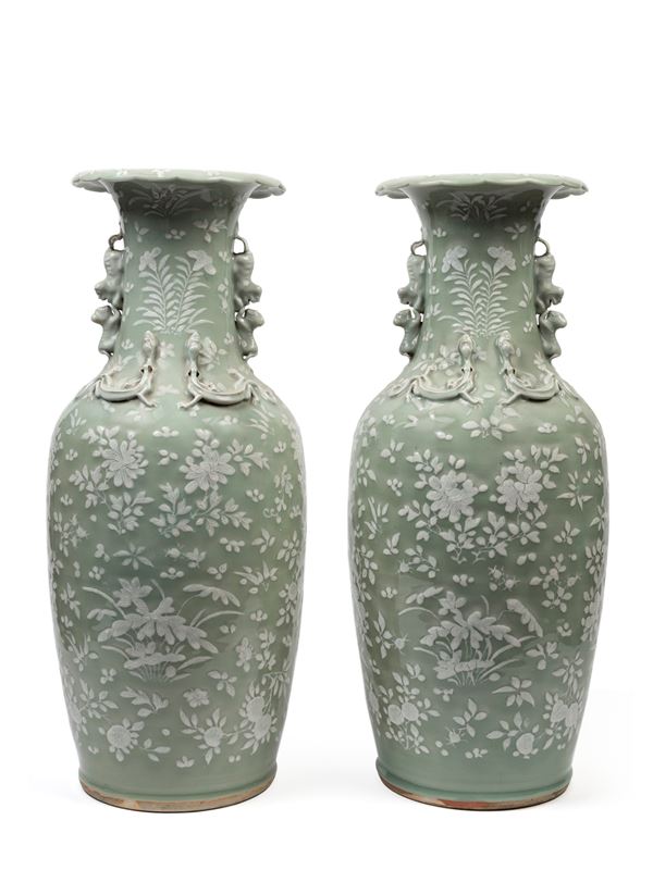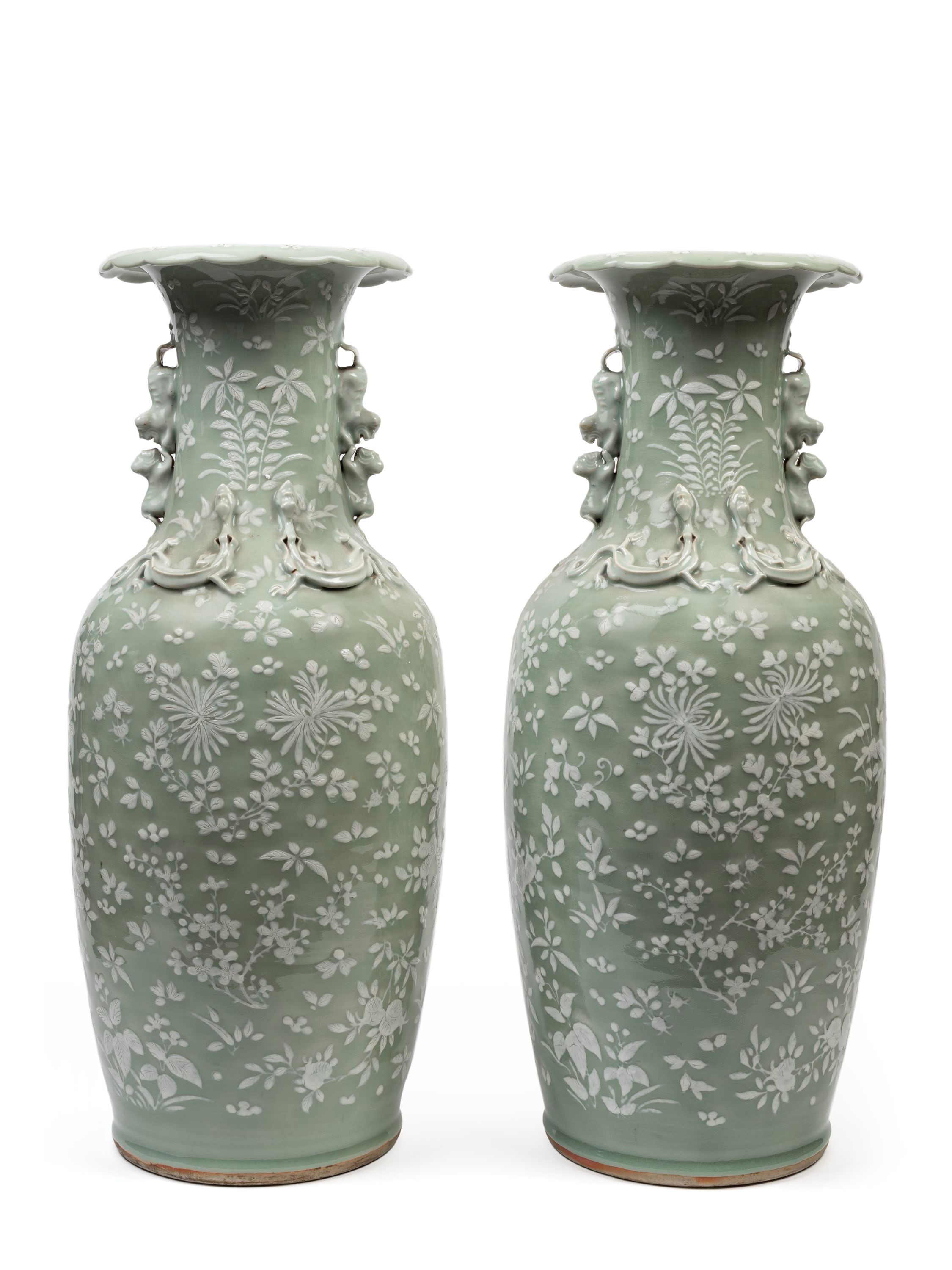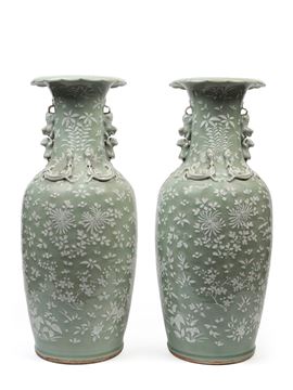 TWO LARGE CELADON-GROUND SLIP-DECORATED VASES, China, Qing dynasty, 19th century