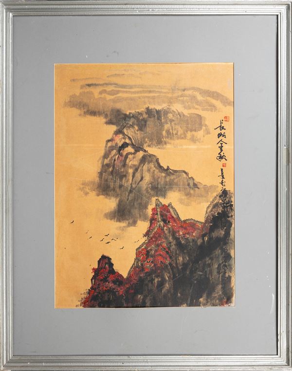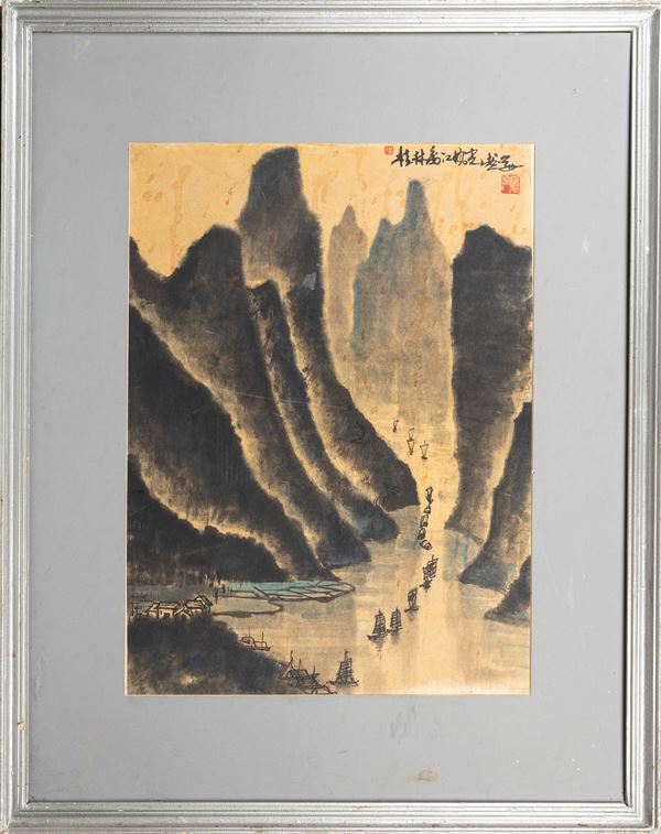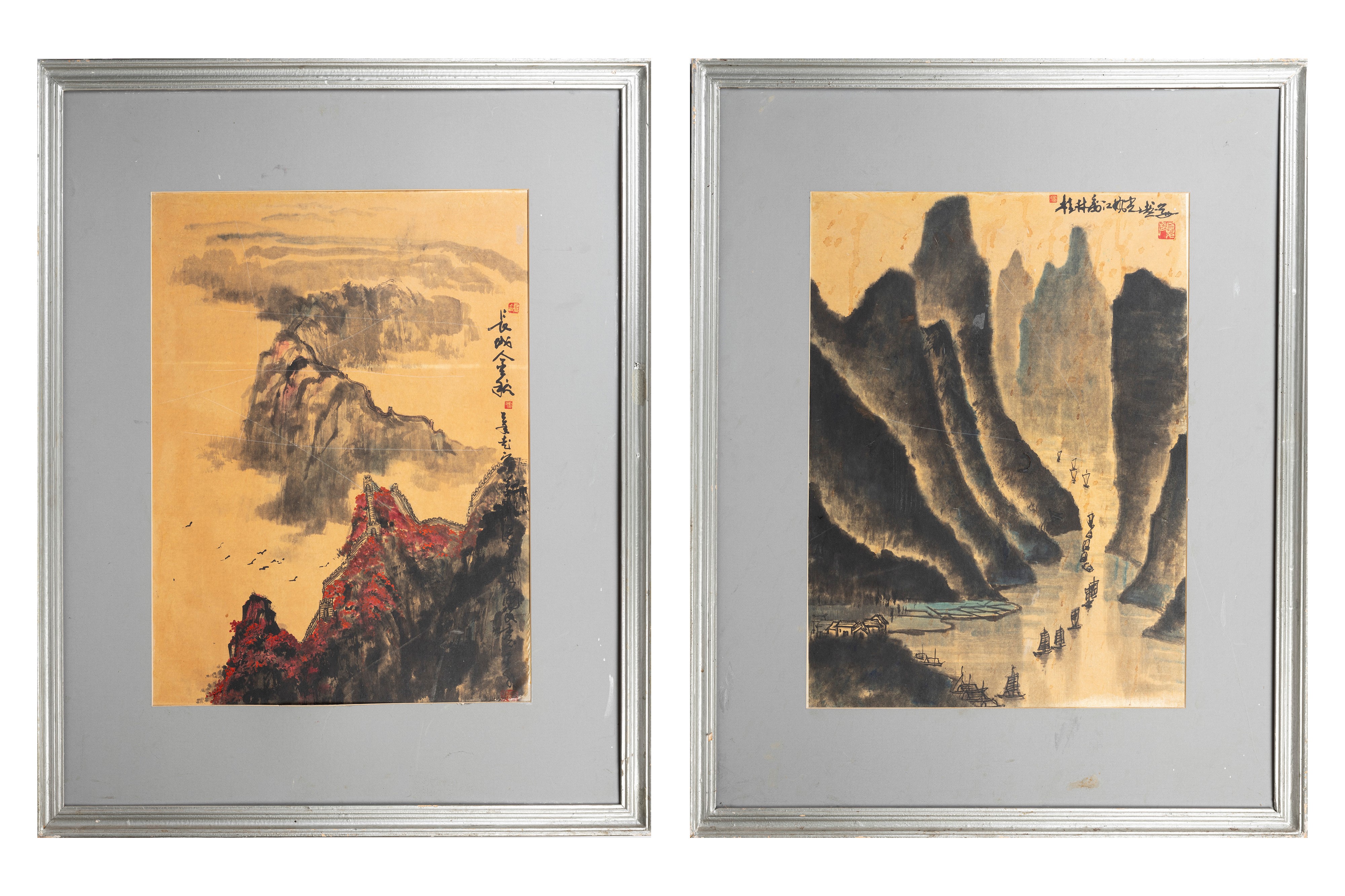 Depicting a mountainous landscape with the Great Wall of China and a riverine scene among mountains with boats, the two pieces bear inscriptions and the artist’s seal.