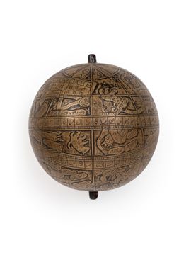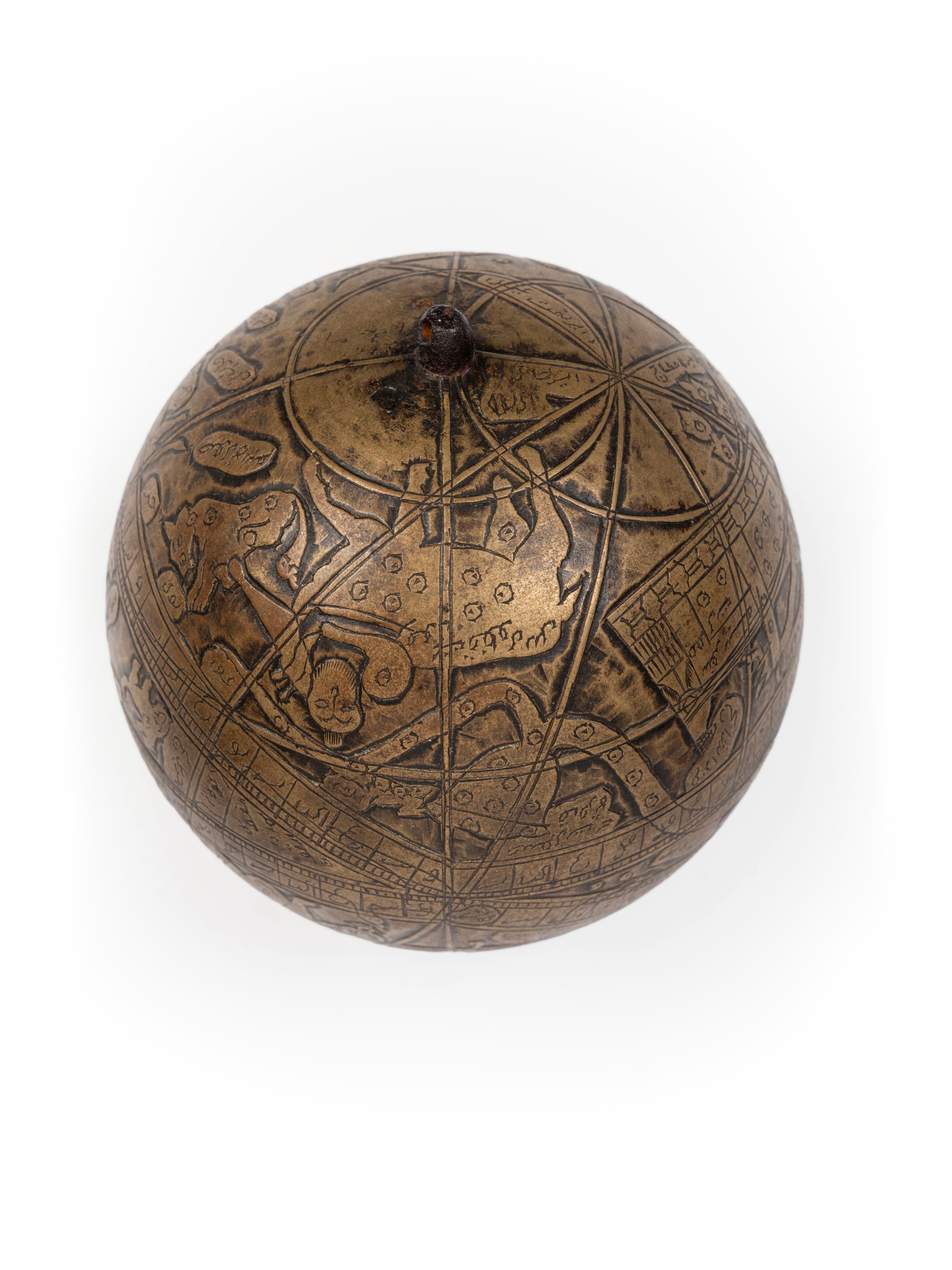 Spherical in shape, the body engraved with constellations and astrological symbols.