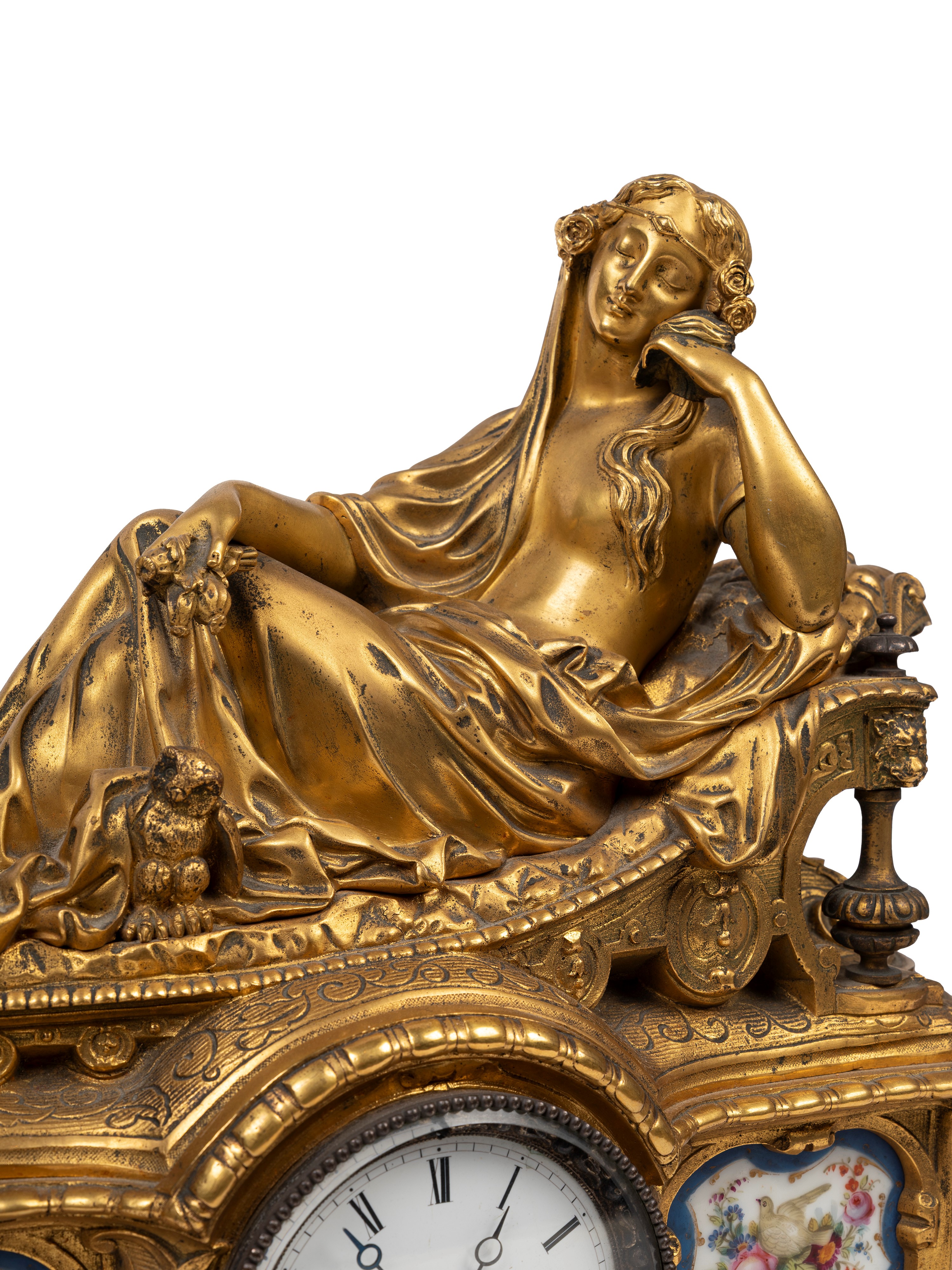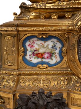 Surmounted by a reclining female figure, it is decorated with two blue-ground porcelain plaques depicting birds among floral motifs.