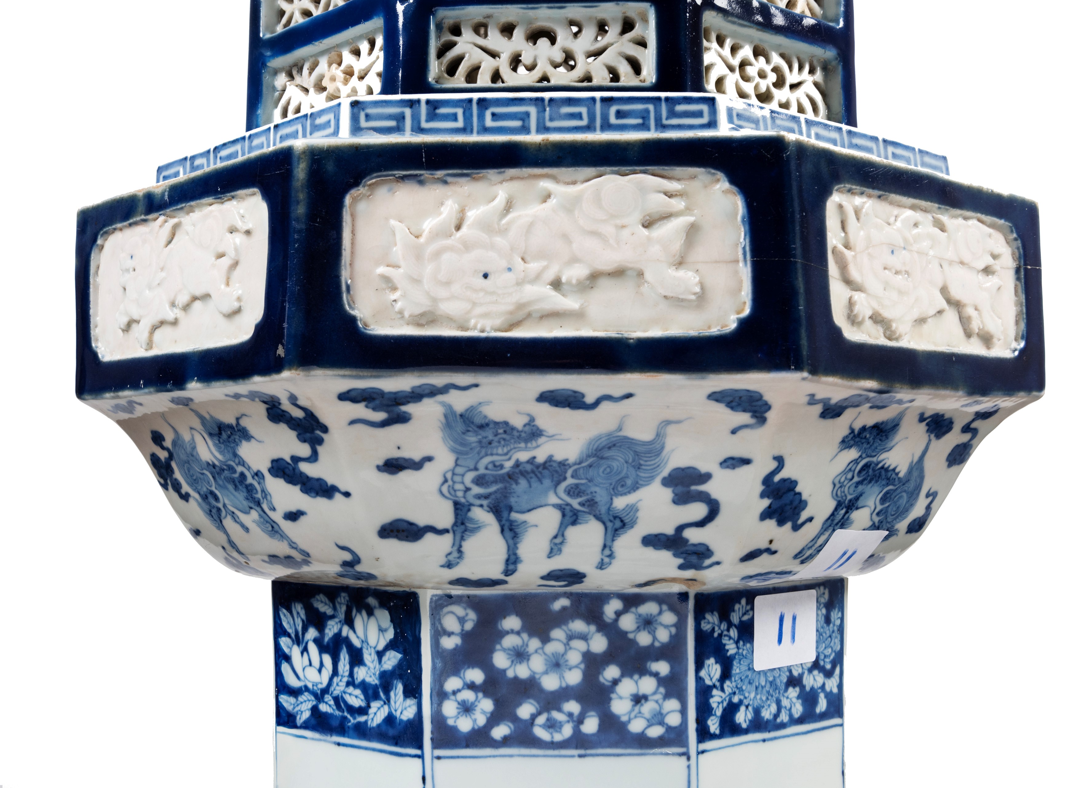 The pagoda rises from an octagonal base adorned with low-relief reserves depicting kirin; above it unfolds an elegant lotus flower, finely enamelled in underglaze blue. The main structure is richly decorated with floral motifs. The upper section echoes the ornamentation of the base, with kirin in relief and stylised among swirling clouds; above them, small pierced windows support the graceful domed finial, surmounted by a flower-shaped tip and embellished with foliate motifs and auspicious symbols.