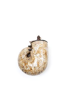 Nautilus-shaped, the body is finely decorated with mother-of-pearl plaques, while the wooden lid is carved in the form of a lotus flower.