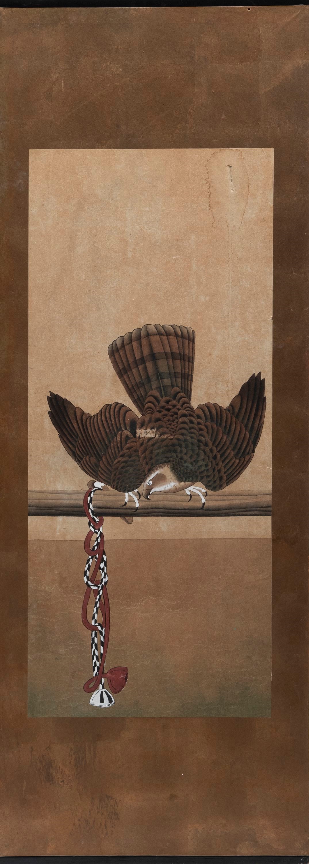 Depicting a falcon on a perch.