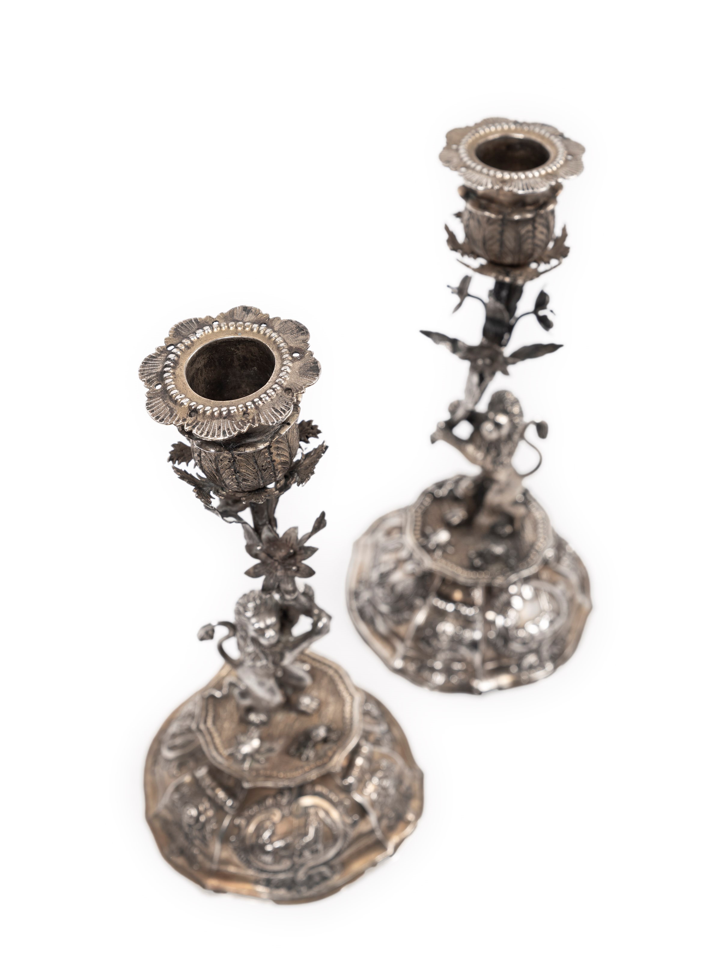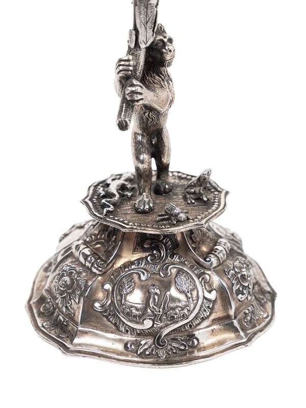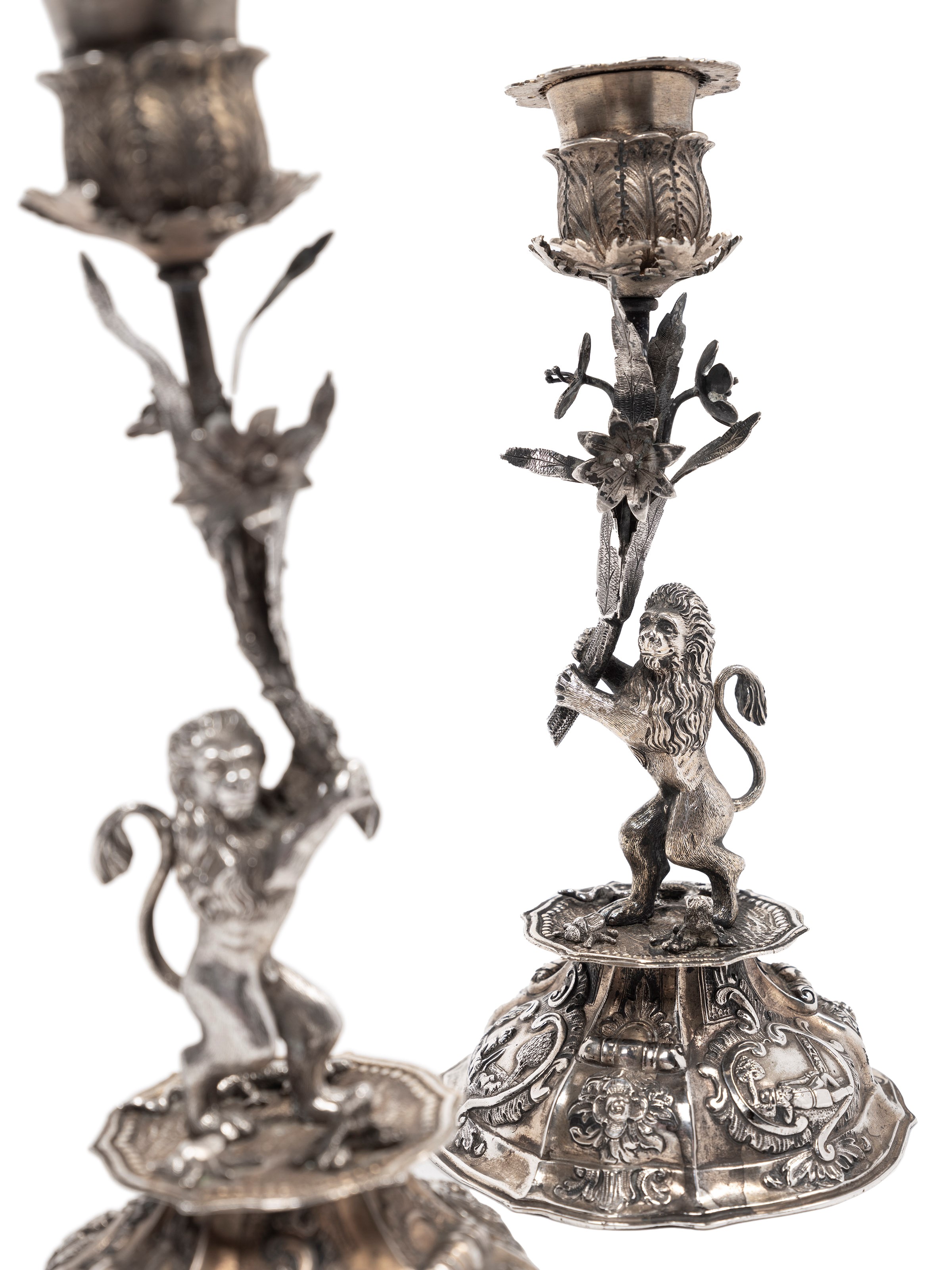 Mark 13. Shaft with a rampant lion holding a cornucopia ending in a candlestick. Polylobed base decorated with floral motifs and cartouches depicting stories from the Old Testament. Weight: 500 g.