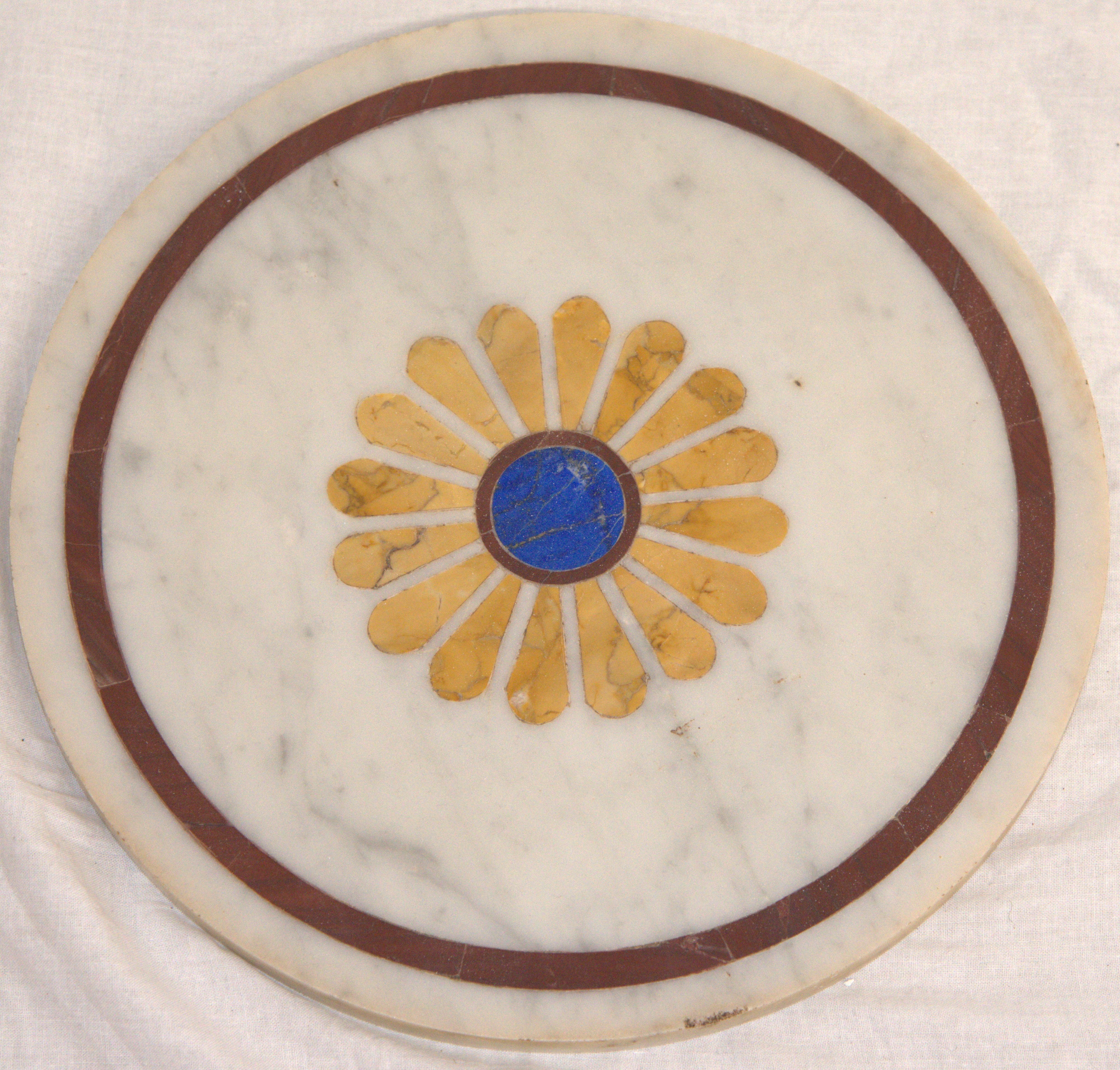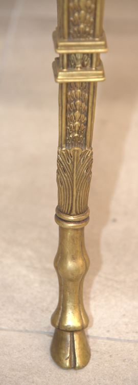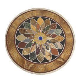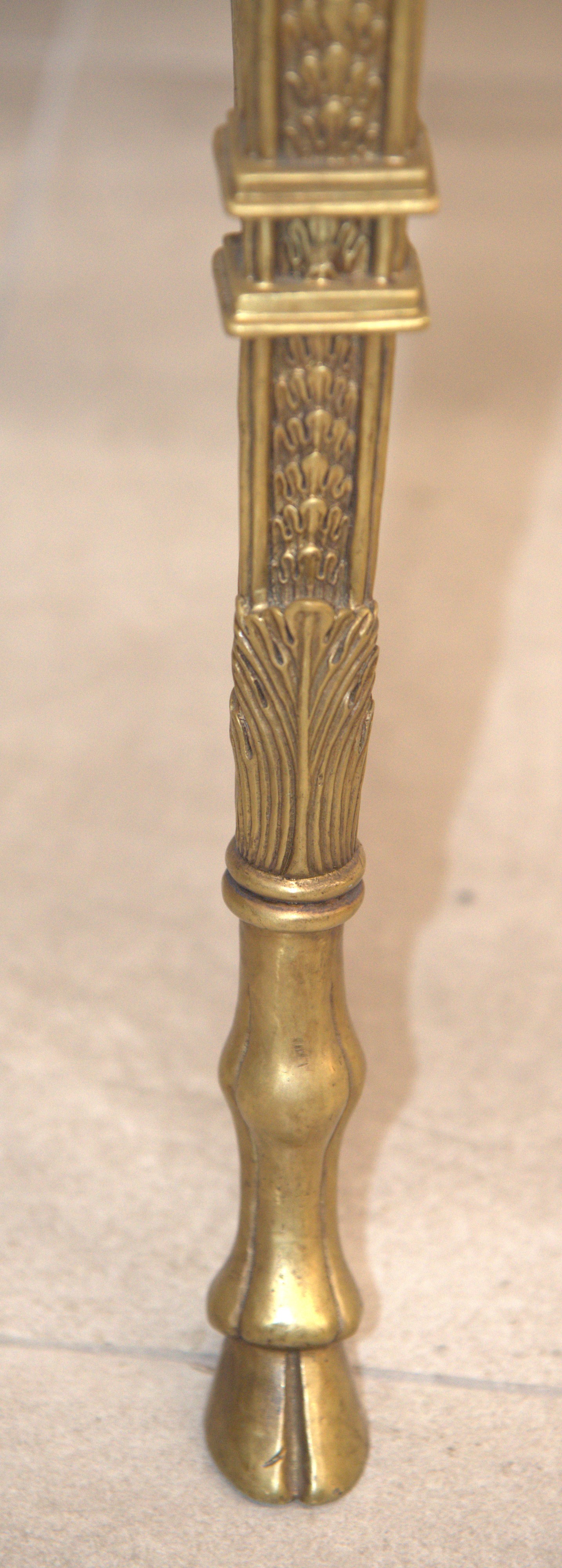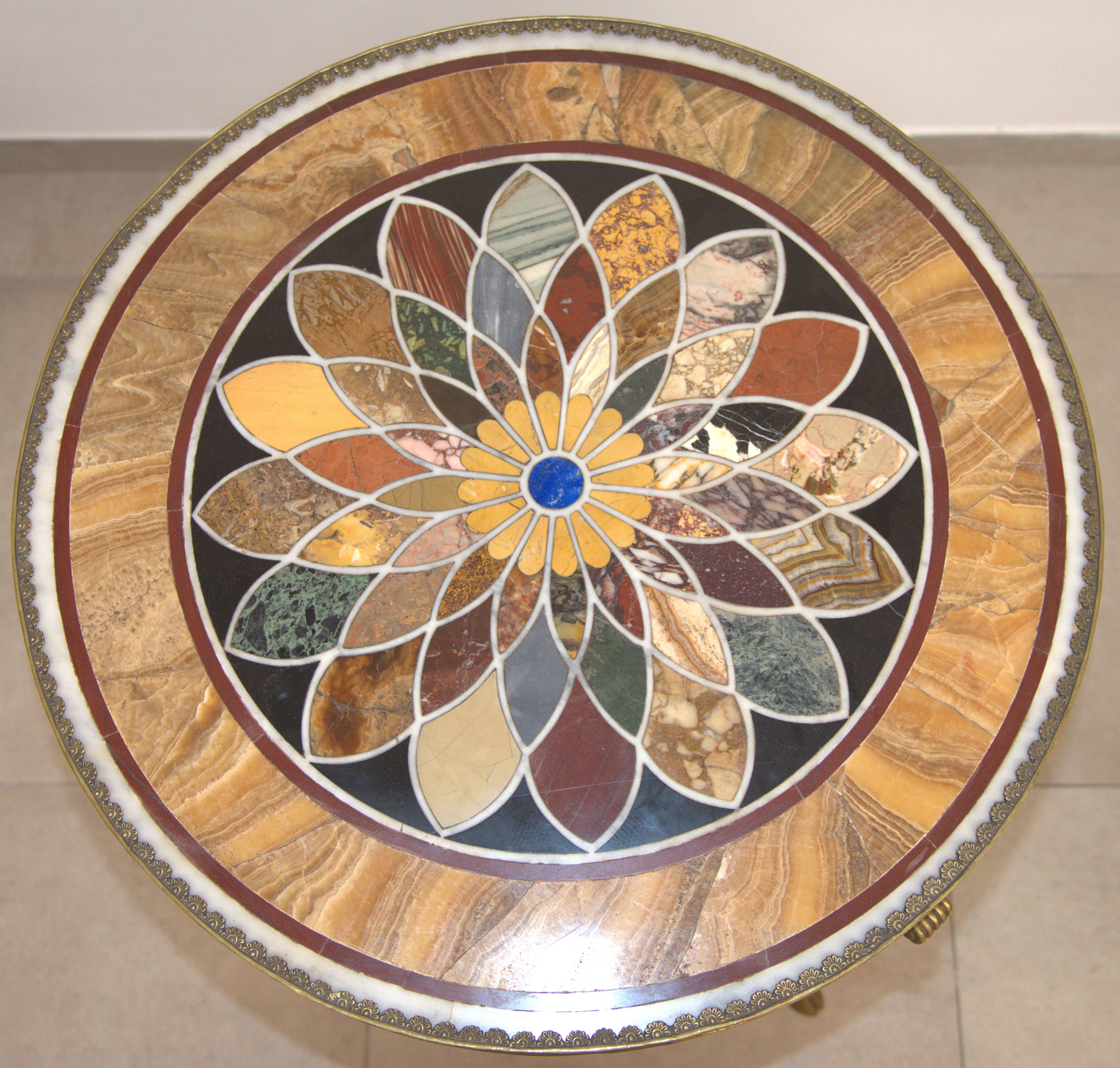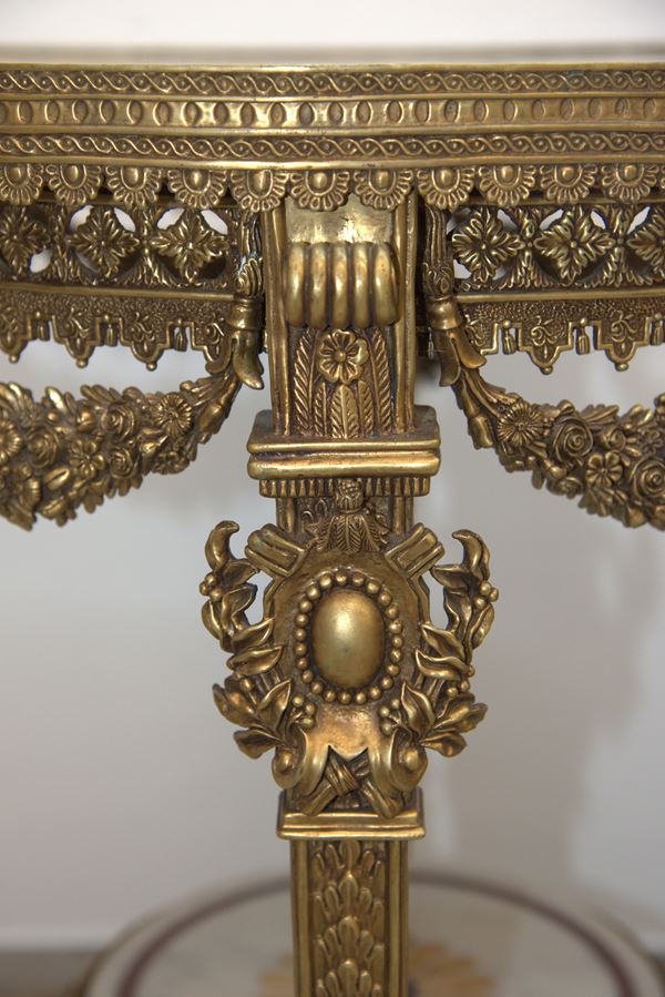 The bronze structure, adorned with draped garlands, rests on symmetrical legs ending in hoof feet. The circular tops feature a refined polychrome marble inlay arranged in an intricate floral or geometric pattern.